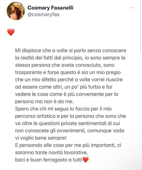 Mi dispiace che a volte si parla senza conoscere la realtà dei fatti dal principio, io sono sempre stata la persona che avete conosciuto, sono trasparente e forse questo è sia un mio pregio che un mio difetto perché a volte vorrei riuscire ad essere come gli altri, un po’ più furba a far vedere le cose com’è conveniente per la persona ma non è da me. Spero che chi mi segua lo faccia per il percorso artistico e per la persona che sono che va oltre le questioni private sentimentali di cui non conoscete gli avvenimenti, comunque vada vi voglio bene sempre! E pensando alle cose per me più importanti ci saranno tante novità lavorative!