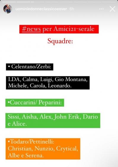 Secondo la pagina Instagram uominiedonneclassicoeover le squadre di Amici 21 saranno tre e saranno così composte: