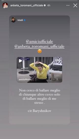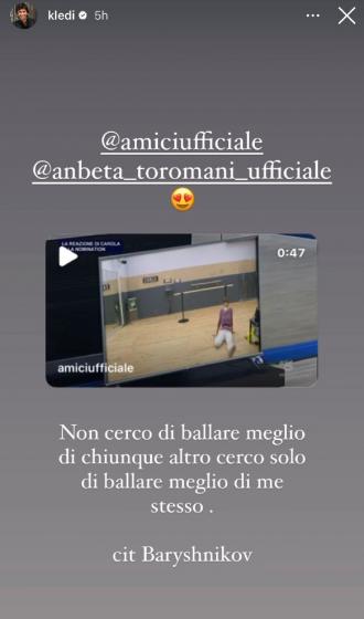 Nel frattempo, un altro volto noto al pubblico di Amici ha appoggiato lo sfogo di Carola, condividendo il video del daytime sul proprio profilo social. Stiamo parlando di Kledi Kadiu, il quale in una storia Instagram non solo ha condiviso lo spezzone dedicato alla ballerina, ma ha anche taggato la stessa Anbeta.