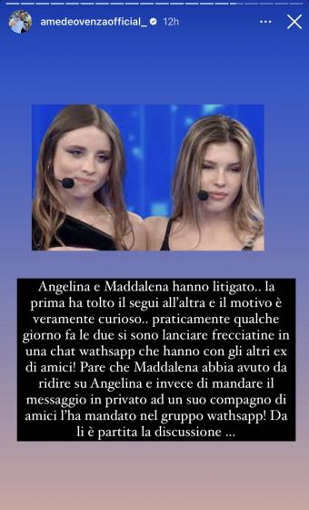 Angelina e Maddalena hanno litigato. La prima ha tolto il segui all’altra e il motivo è curioso. Praticamente qualche giorno fa le due si sono lanciate frecciatine in una chat whatsapp che hanno con gli altri ex di Amici. Pare che Maddalena abbia avuto da ridire su Angelina e invece di mandare il messaggio in privato a un suo compagno di Amici, l’ha mandato nel gruppo whatsapp! Da lì è partita la disucssione.