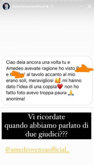 Nei giorni scorsi vi abbiamo parlato di un’indiscrezione in merito a una “bella amicizia” fra due giudici di Amici. Bene, pochi minuti fa, Deianira Marzano ha riportato in una delle sue storie Insagram un messaggio da parte di un’utente che rivelerebbe anche i nomi dei giudici in questione. Nomi che sono stati poi cancellati, ma che sono facilmente intuibili: