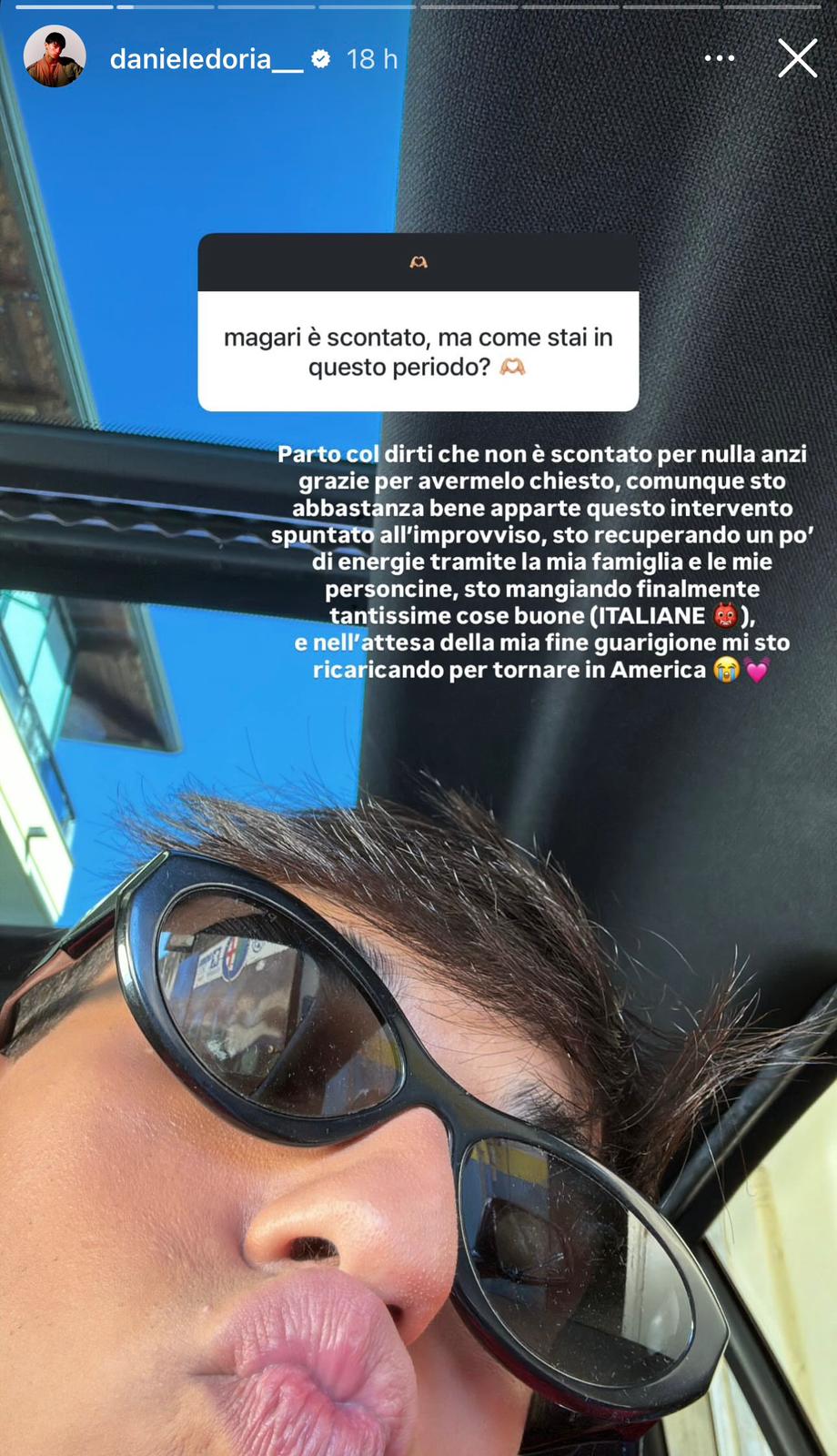Sto abbastanza bene, a parte questo intervento che è spuntato all’improvviso, sto recuperano un po’ di energie tramite la mia famiglia e le mie personcine, sto mangiando finalmente tantissime cose buone (italiane). E nell’attesa della mia fine guarigione mi sto ricaricando per tornare in America.