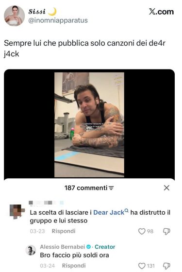 Di recente però, dopo l’ennesimo commento di un utente, l’ex leader dei Dear Jack ha voluto replicare, e anche in maniera piuttosto piccata.