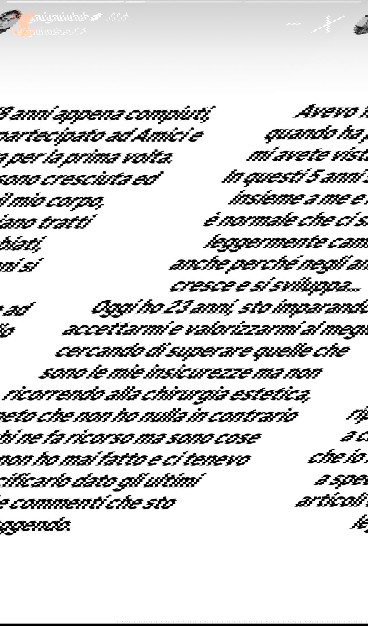 In questi 5 anni sono cresciuta ed insieme a me e il mio corpo, è normale che ci siano tratti leggermente cambiati, anche perché negli anni si cresce e si sviluppa…Oggi ho 23 anni, sto imparando ad accettarmi e valorizzarmi al meglio cercando di superare quelle che sono le mie insicurezze ma non ricorrendo alla chirurgia estetica, ripeto che non ho nulla in contrario a chi ne fa ricorso ma sono cose che io non ho mai fatto e ci tenevo a specificarlo dato gli ultimi articoli e commenti che sto leggendo.