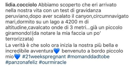 Non solo lavoro e carriera però nella vita della Cocciolo, la cantante e attrice ha infatti rivelato attraverso il suo profilo Instagram di essere in dolce attesa. Lei e il compagno Davide Maffei, durante un avventuroso viaggio in Perù hanno scoperto di diventare presto genitori: “Abbiamo scoperto che eri arrivato nella nostra vita con un test di gravidanza peruviano, dopo aver scalato il canyon, circumnavigato mari, dormito su un lago a 4200 m di altitudine, cavalcato onde di 3 metri… già un piccolo giramondo (.. da notare la mia faccia un po’ terrorizzata)! La verità è che solo ora inizia la nostra più bella e incredibile avventura. Benvenuto a bordo piccolo mio!”.