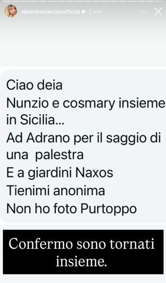 Una segnalazione che però non appare isolata, a conferma del ritorno di fiamma tra i due ex fidanzati. Sempre la Marzano, infatti, nelle scorse ore ha postato nelle sue storie Instagram il racconto di una sua follower che ha visto Stancampiano e Fasanelli insieme in Sicilia in occasione del saggio di una palestra, sebbene non sia riuscita a fare loro una foto: