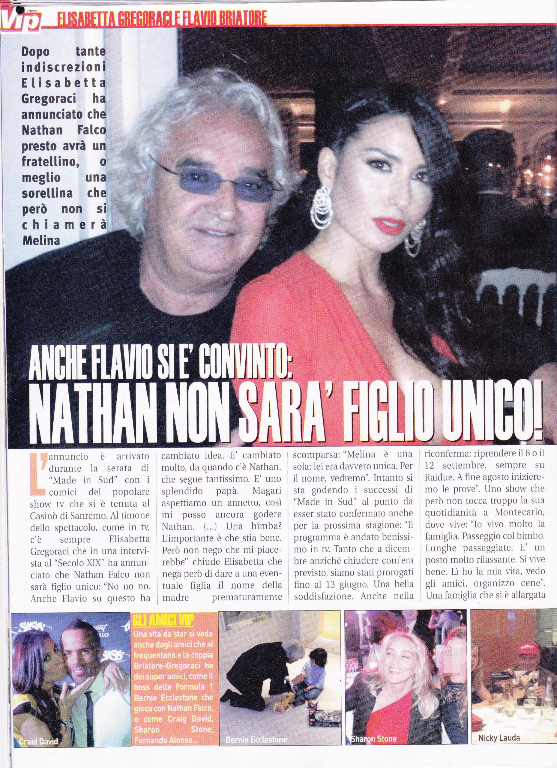 Durante la serata Made in Sud che si è tenuta al Casinò di Sanremo, la conduttrice Elisabetta Gregoraci ha fatto il suo annuncio: “No, mio figlio Nathan Falco non rimarrà figlio unico. Anche mio marito, Flavio Briatore, ha cambiato idea. E’ cambiato da quando c’è Nathan, lo segue tantissimo ed è uno splendido papà. Magari, però, aspettiamo un annetto così mi posso godere Nathan. Una bimba? Mi piacerebbe, ma l’importante è che stia bene. Il programma Made in Sud sta andando bene, ha chiuso a giugno anziché a dicembre e sono stata confermata per la prossima stagione: riprende il 6 o il 12 settembre su Raidue. Frattanto, la mia vita è a Montecarlo: è rilassante e si sta bene”. E la famiglia pare già allargata: a Montecarlo vive anche Alessandra Pierelli, storica corteggiatrice di Costantino Vitagliano, che ha da poco avuto il piccolo Liam.