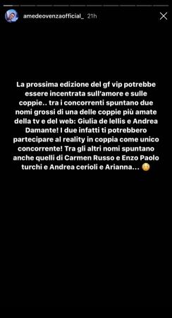L’ultimo rumor arriva direttamente da Amedeo Venza, il quale ha anticipato che nella prossima edizione del Grande Fratello Vip potremmo rivedere – oltre a Enzo Paolo Turchi e Carmen Di Pietro e Andrea Cerioli e Arianna Cirrincione – anche Andrea Damante e Giulia De Lellis, che hanno già partecipato rispettivamente alla prima e alla seconda edizione del reality show, ma che questa volta potremmo forse vedere insieme come unico concorrente: