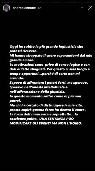 Oggi ho subito la più grande ingiustizia che potessi ricevere. Mi hanno strappato il cuore separandomi dal mio grande amore. Le motivazioni sono prive di senso logico e con dati di fatto sbagliati. Per questo ci sarà luogo e tempo opportuni…perché di certo non mi arrendo. Sapevo di affrontare i poteri forti, ma speravo. Speravo nell’onestà intellettuale e nell’affermazione della giustizia. In questo momento soffro come di più non potrei. Ma chi ha cercato di distruggere la mia vita, presto capirà quanta forza ho dentro il cuore. La forza dell’innocenza e soprattutto…la coscienza pulita. Una sentenza può modificare gli eventi ma non l’uomo.