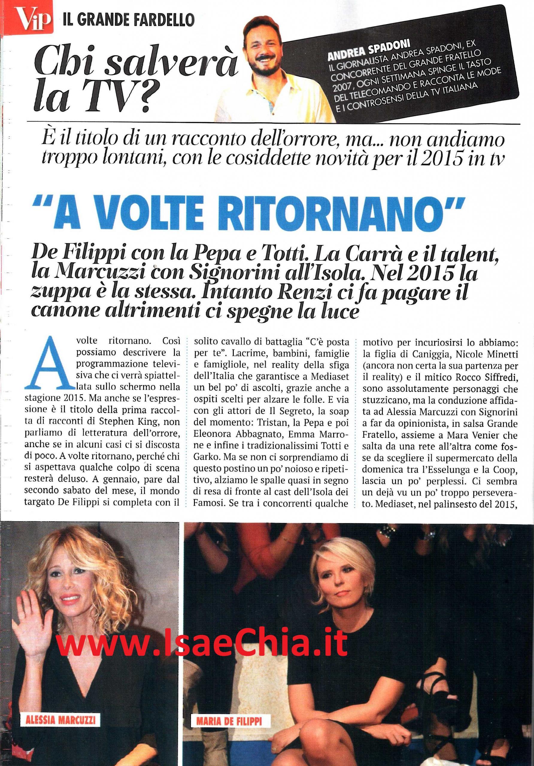 Il palinsesto per la prossima stagione televisiva è ormai stato rivelato e, ancora una volta, sono stati confermati programmi come C’è posta per te, lo show del sabato sera di Maria De Filippi ormai da anni sul piccolo schermo. La Mediaset e la Rai avevano annunciato grandi novità, ma, tutto sommato, non ci sono grandi colpi di scena: L’Isola dei Famosi, ad esempio, è approdato su Canale 5 e alla conduzione ci sarà Alessia Marcuzzi, finora padrona di casa al Grande fratello. Ed è proprio un ex concorrente del Grande fratello, il giornalista Andrea Spadoni, che commenta la situazione della televisione italiana del 2015: “A volte ritornano. Così possiamo descrivere la programmazione televisiva che verrà spiattellata sugli schermi televisivi nel 2015. Chi si aspettava grandi colpi di scena rimarrà deluso. A gennaio, il mondo targato De Filippi si completa con C’è posta per te: lacrime, bambini, famiglie e famigliole nel reality della sfiga dell’Italia che garantisce a Mediaset ottimi ascolti grazie agli ospiti scelti per alzare le folle. E vai con gli attori de Il Segreto, Tristan e Pepa, e poi i soliti Emma Marrone, Francesco Totti e Gabriel Garko. Ma se non ci sorprendiamo di questo postino un po’ ripetitivo, alziamo le spalle di fronte a L’isola dei famosi. Alcuni concorrenti, come Charlotte Caniggia con Rocco Siffredi stuzzicano, ma la conduzione di Alessia Marcuzzi con Alfonso Signorini come opinionista in stile Grande fratello, con Mara Venier che salta da una rete all’altra, lascia un po’ perplessi. Ma se pensiamo che il talent Forte forte forte di Raffaella Carrà dovrebbe essere la vera novità della stagione di Mamma Rai, allora dobbiamo convogliare tutte le nostre speranze nella televisione a pagamento: in casa Sky, MasterChef inizia col botto e si conferma una formula ideale anche per un pubblico giovane e attivo sui social network. Lo stesso vale per i reality di Raidue: The Voice of Italy e Boss in incognito agganciano i giovani con smartphone e Twitter. L’unico dubbio volge su Costantino Della Gherardesca: bravo e simpatico, ormai un’icona. Ma perché quando uno funziona poi lo si mette ovunque? Coach di The Voice e conduttore di Boss in incognito, dopo Pechino Express. Non si rischia di esporlo troppo?“.