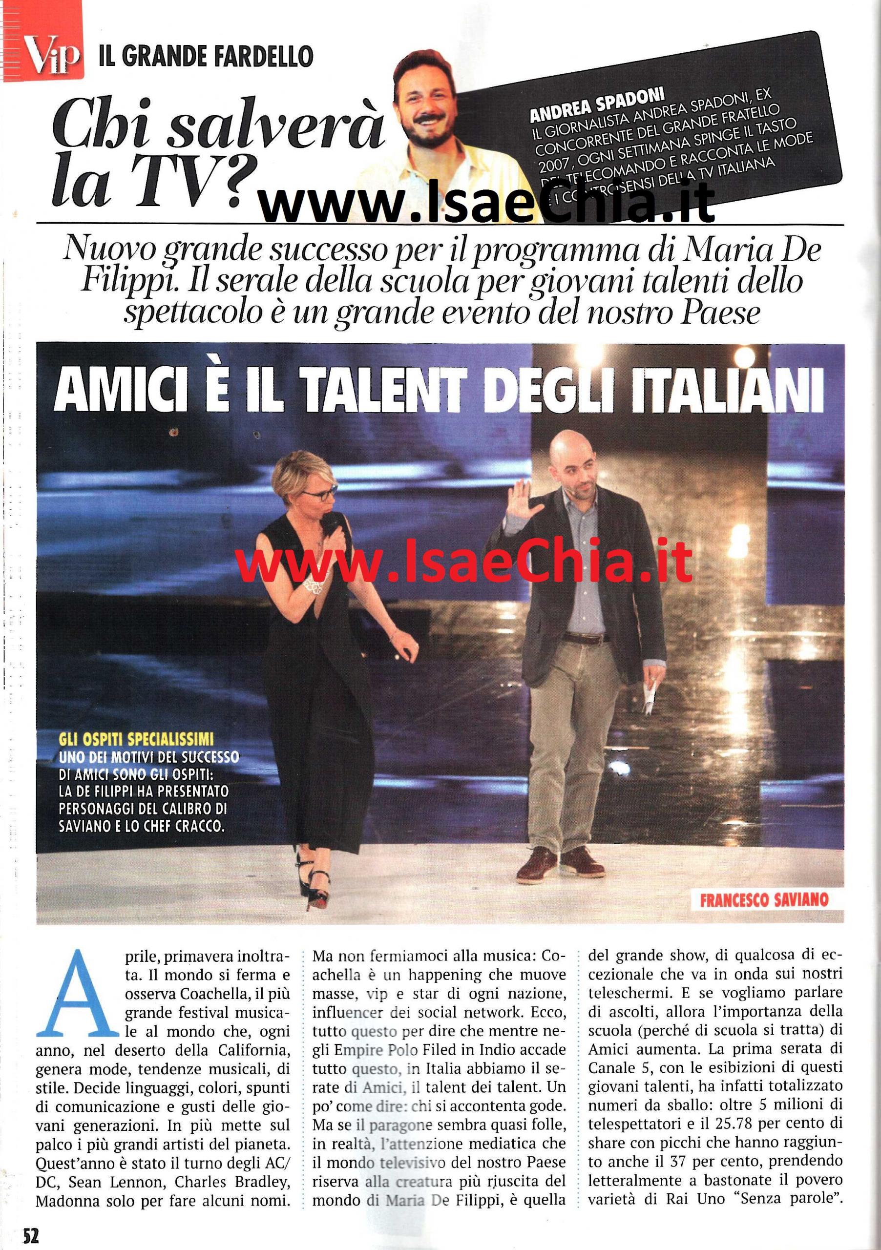 Questa settimana, l’ex gieffino e giornalista Andrea Spadoni, nel suo spazio dedicato alla televisione, commenta il talent Amici, da 14 anni nella tv degli Italiani. “Aprile, primavera inoltrata e il mondo si ferma ad osservare Coachella, il più grande festival musicale al mondo, che ogni anno, nel deserto della California, genera mode e tendenze e mette sul palco i più grandi artisti del pianeta. Mentre negli Empire Polo Fields di Indio accade tutto questo, in Italia abbiamo il serale di Amici, il talent dei talent. Un po’ come dire ‘chi s’accontenta, gode’. Ma, se il paragone sembra folle, in realtà l’attenzione mediatica che il nostro Paese riserva alla creatura più riuscita del mondo di Maria De Filippi è quella del grande show, di qualcosa di eccezionale che va in onda sui nostri teleschermi. E se vogliamo parlare di ascolti, l’importanza di Amici aumenta. La prima serata ha totalizzato più di 5 milioni di telespettatori e il 25,78%, con picchi che hanno toccato il 37%, prendendo letteralmente a bastonate lo show di Raiuno Senza parole. Merito forse anche degli ospiti di cui può disporre Maria, che nella sua prima del 2015, ha portato Gianni Morandi, i Modà, Virginia Raffaele e gli Sheppard, con in più Emma Marrone ed Elisa, Renato Zero, Francesco Renga e Sabrina Ferilli come giurati. Entusiasmo anche negli uffici della direzione di Canale 5: “Amici è il più bel talent della televisione italiana’ ha dichiarato Giancarlo Scheri, direttore di rete. “Intrattenimento di livello internazionale, la scuola di spettacolo per eccellenza, la fucina da cui sono usciti i migliori talenti italiani del canto e del ballo. Maria De Filippi è eccezionale ed unica, espressione sempre di qualità e grandi ascolti”. Lo dobbiamo ammettere, come del resto abbiamo fatto per C’è posta per te: Maria ha un intuito televisivo come nessuno e riesce a plasmare nei programmi i gusti degli Italiani. Difficile ripetere, per gli allievi, i successi di Alessandra Amoroso ed Emma Marrone, ma Amici resta il padre di tutti i talent e al confronto, tutti sembrano tentativi di emulazione, non tutti ben riusciti. E soprattutto, qui si tratta di Made in Italy e non di rivisitazione di format internazionali. Un doppio applauso alla nostra Maria, portabandiera della tv dello Stivale. E chi se ne frega se gli Stati Uniti hanno il Coachella. A noi date Marco Carta, Valerio Scanu e siamo contenti così!“.