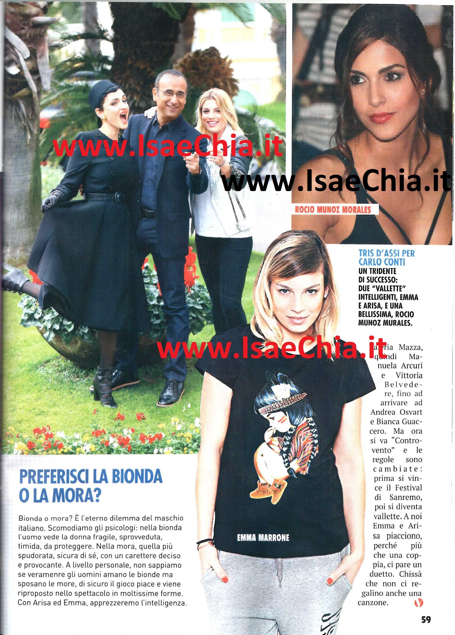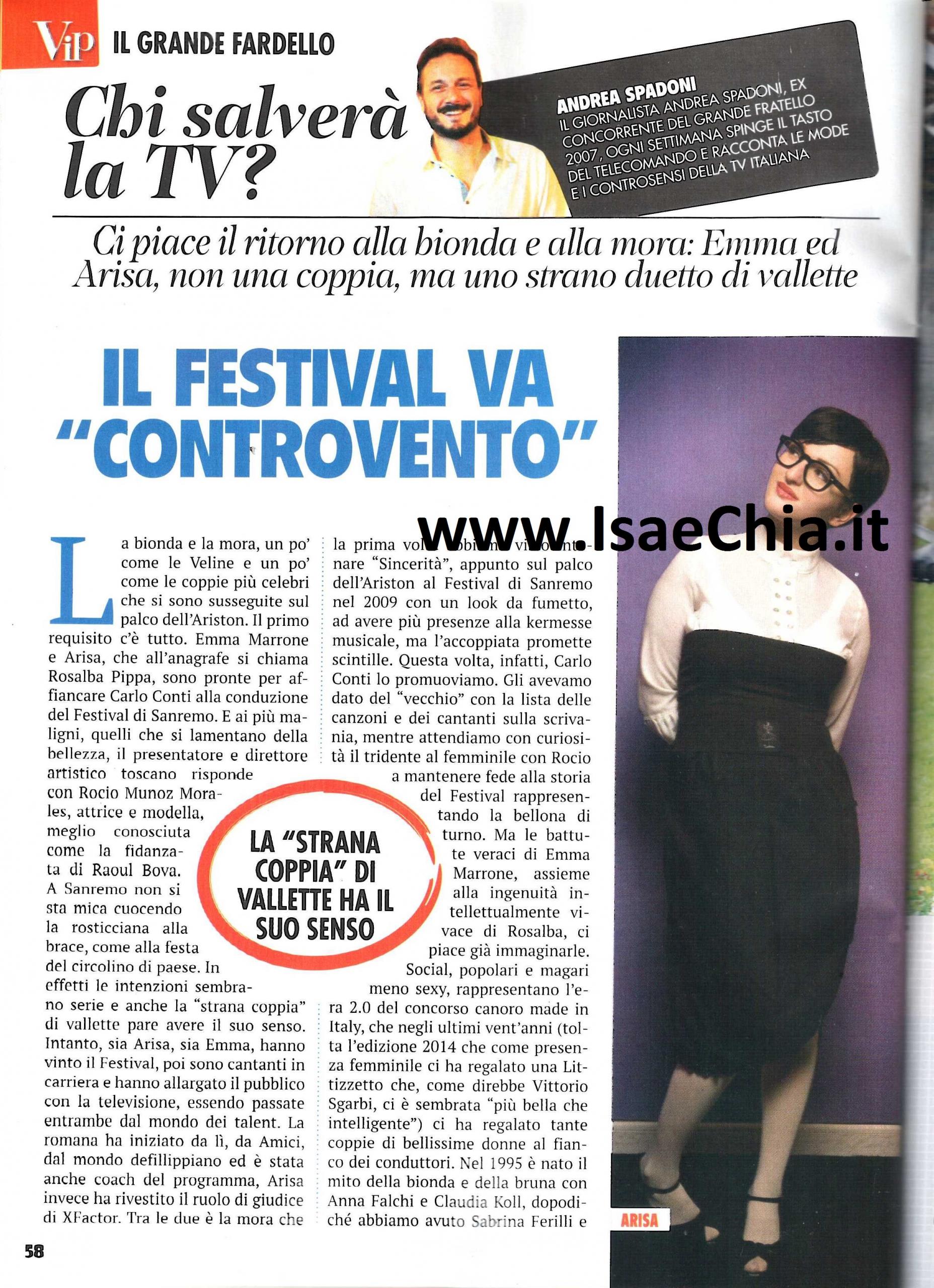 Il giornalista ed ex concorrente del Grande fratello Andrea Spadoni commenta la scelta di Carlo Conti di farsi accompagnare nel ruolo di vallette, per il prossimo Festival di Sanremo, da Emma Marrone e Arisa, vincitrici delle scorse edizioni. “La bionda e la mora: il primo requisito c’è tutto. Ai più maligni, quelli che lamentano della bellezza, il conduttore toscano risponde con Rocio Munoz Morales, attrice e modella spagnola, meglio conosciuta come fidanzata di Raoul Bova. Le intenzioni a Sanremo sembrano serie e anche la “strana coppia” sembra avere il suo senso: intanto, sia Arisa sia Emma hanno vinto il Festival, sono cantanti in carriera e hanno allargato il loro pubblico con la televisione, essendo passate entrambe per il mondo dei talent: Emma è passata da Amici, dove è stata anche coach, Arisa giudice di X Factor. Questa volta, Carlo Conti lo promuoviamo: gli avevamo dato del vecchio con la lista delle canzoni e dei concorrenti mentre attendiamo Rocio che rappresenterà la bellona di turno. Ma le battute veraci di Emma, insieme all’ingenuità intellettualmente vivace di Rosalba Pippa (questo il vero nome di Arisa) ci piace già immaginarle. Social, popolari e magari meno sexy, rappresentano l’era 2.0 del concorso canoro Made in Italy, che tolta Luciana Littizzetto (che citando Vittorio Sgarbi, è ‘più intelligente che bella’) ci ha regalato tante bellissime donne al fianco dei conduttori. Ma ora si va…”Controvento” e le regole sono cambiate: prima si vince il Festival e poi si diventa vallette! A noi Emma e Arisa piacciono, perché più che una coppia, ci pare un duetto. Chissà che non ci regalino anche una canzone!“.