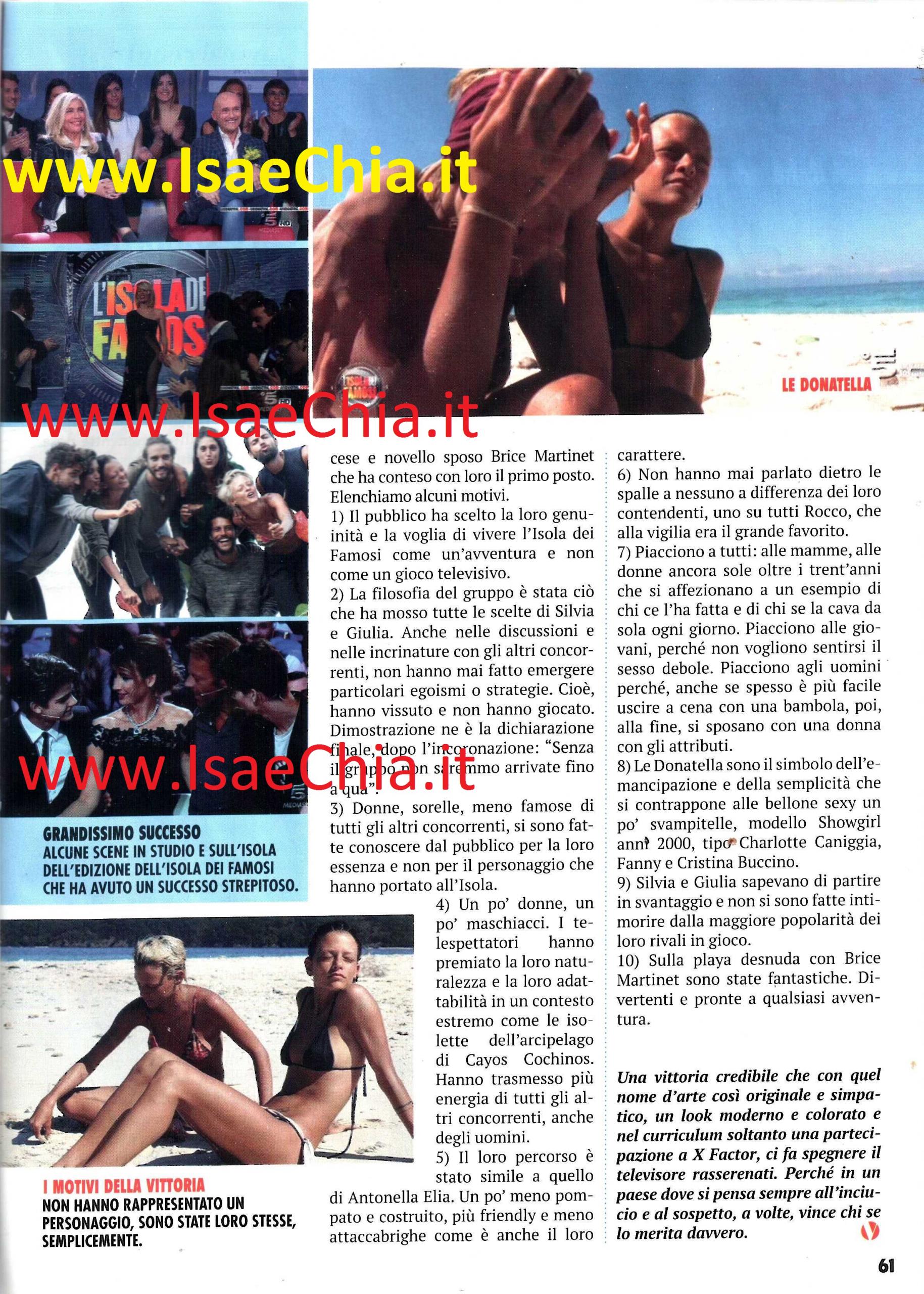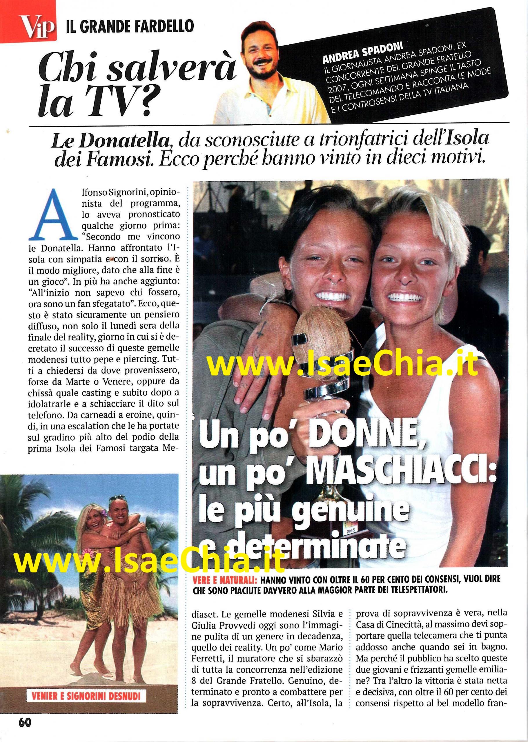 La decima edizione dell’Isola dei famosi si è conclusa con la vittoria delle Donatella, che nonostante la poca popolarità, data solo dalla partecipazione al talent X Factor, hanno saputo conquistare il pubblico con la loro determinazione, la simpatia e la forza fisica che hanno dimostrato durante le prove settimanali. L’ex concorrente del Grande fratello e giornalista Andrea Spadoni, che ora ha una rubrica sulla tv, commenta così la loro vittoria: “Alfonso Signorini l’aveva predetto: ‘Secondo me vincono le Donatella. Hanno affrontato l’Isola con il sorriso ed è il modo migliore, dato che alla fine è un gioco’. Ecco, questo è stato sicuramente un pensiero condiviso, non solo il lunedì della finale del reality. Tutti a chiedersi da dove provenissero, forse da Marte o da Venere, e a schiacciare il dito sul telefono. Le gemelle modenesi Giulia e Silvia Provvedi sono l’immagine pulita di un genere in decadenza, quello del reality, un po’ come Mario Ferretti, il muratore che vinse il Grande fratello 8, genuino, determinato e pronto a lottare per la sopravvivenza. Ma perché il pubblico ha scelto loro, tra l’altro con una percentuale di oltre il 60%? Ecco alcuni motivi: