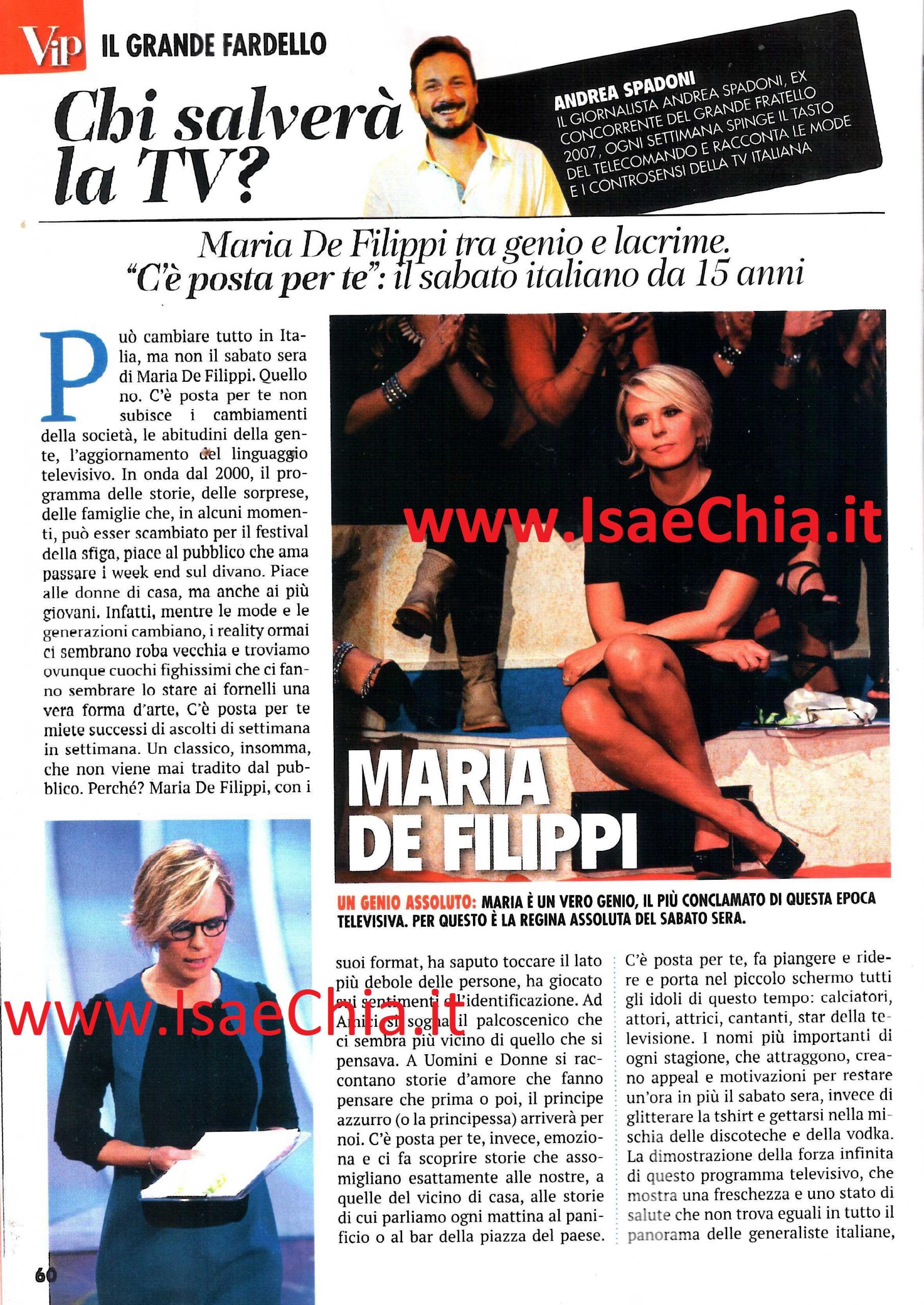 Domani sera si concluderà l’appuntamento settimanale con C’è posta per te, il programma di Maria De Filippi che da ormai quindici anni ci fa compagnia, tra risate e pianti e ospiti speciali. L’ex concorrente del Grande fratello 7 e giornalista Andrea Spadoni commenta così il grande successo della trasmissione: “Può cambiare tutto in Italia, ma non il sabato sera con Maria De Filippi. C’è posta per te non subisce i cambiamenti della società, le abitudini della gente, l’aggiornamento del linguaggio televisivo. In onda dal 2000, il programma delle storie, delle sorprese, delle famiglie che, in alcuni momenti, può esser scambiato per il festival della sfiga, piace al pubblico che ama passare i week-end sul divano. Piace alle donne di casa, ma anche ai giovani. Le mode e le relazioni cambiano, i reality sembrano ormai roba vecchia e troviamo ovunque cuochi fighissimi che fanno sembrare stare ai fornelli una forma d’arte, ma C’è posta per te miete successi di ascolti ogni settimana. Un classico che non viene mai tradito dal pubblico. Perché? Perché Maria, con i suoi format, ha saputo toccare il lato più debole delle persone, ha giocato sui sentimenti e l’identificazione: ad Amici si sogna il palcoscenico che sembra più vicino di quello che sembrava; a Uomini e Donne si raccontano storie d’amore che fanno sognare che prima o poi il principe azzurro arriverà per noi; C’è posta per te ti fa scoprire storie che assomigliano alle nostre, a quelle del vicino di casa, a quelle di cui parliamo al bar. Fa piangere e ridere e porta nel piccolo schermo calciatori, attori, cantanti, star della tv, i nomi più importanti che attraggono e creano motivazione per restare un’ora in più la sera anziché gettarsi nella mischia delle discoteche. La dimostrazione della forza infinita di questo programma, che mostra una freschezza che ha eguali in nessun altro programma delle tv generaliste italiane, la troviamo nei risultati dell’audience di ogni settimana: per 9 volte consecutive è stato il programma più seguito, con picchi di share che superano il 30% e oltre 6 milioni di telespettatori, contro i miseri 15% di Notti sul ghiaccio su Mamma Rai. Dimostrazione dell’innata capacità di Maria di trasmettere forti emozioni, come quella di papà Mario, che ha incontrato Belén Rodriguez e Stefano De Martino, che è scoppiato a piangere mentre ascoltava le parole dei propri figli. La commozione si mischia alla voglia di vedere i propri beniamini in tv, in una forma di spettacolo che ha poco a che vedere con l’intrattenimento leggero, ma vince sempre, nonostante gli anni passino e nonostante sia un riflesso della nostra società estremamente pop. Maria De Filippi è un vero genio. Il più conclamato di questa epoca televisiva“.