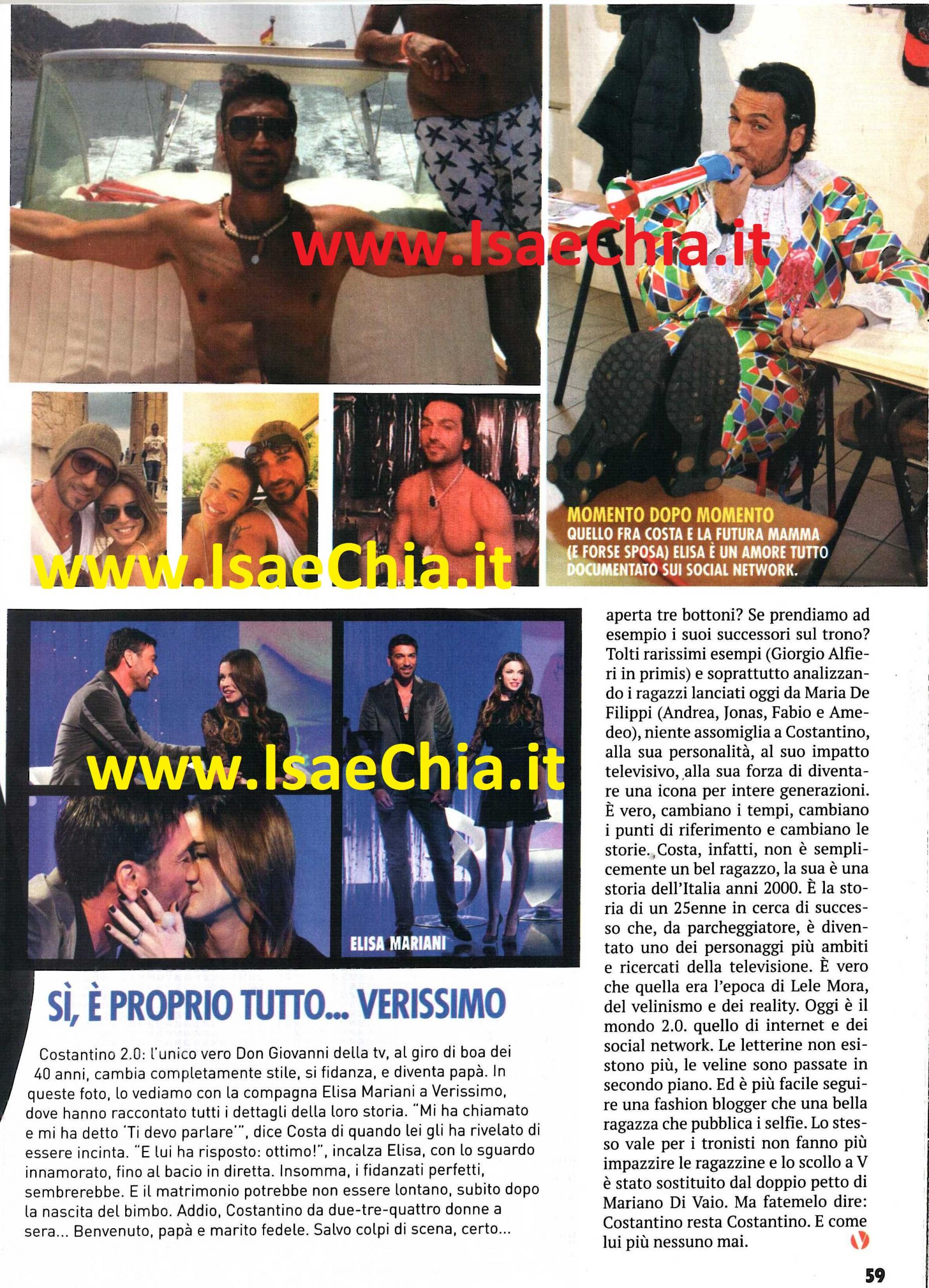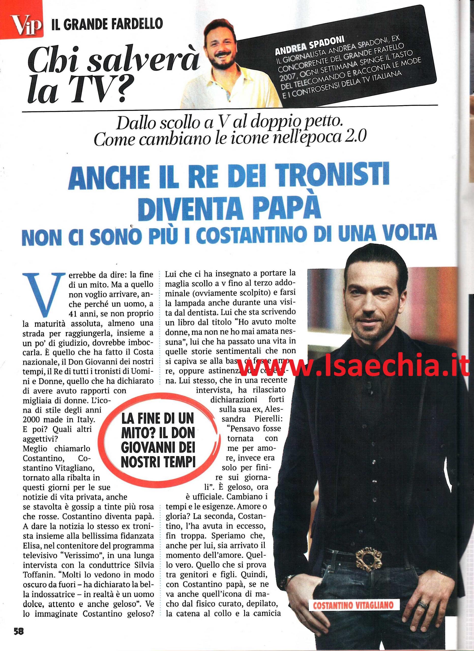 Il giornalista ed ex concorrente del Grande fratello Andrea Spadoni ha commentato così la notizia, giunta qualche settimana fa, che l’ex tronista Costantino Vitagliano diventerà presto padre (QUI la sua intervista rilasciata a Chi). “Verrebbe da dire ‘la fine di un mito’, ma a quello non voglio arrivare perché un uomo, a 41 anni, se non proprio la maturità assoluta, almeno la strada per raggiungerla, dovrebbe imboccarla! E’ quello che ha fatto il Costa nazionale, il Don Giovanni dei nostri tempi, il re di tutti i tronisti, colui che ha dichiarato di aver avuto migliaia di donne…Ora è tornato alla ribalta con gossip a tinte più rosa che rosse: diventerà papà e lo annuncia con la bellissima fidanzata Elisa a Verissimo, da Silvia Toffanin (QUI per rivedere il video). Lei ha detto: “E’ dolce, attento e anche geloso”. Ce lo vedete in questo modo? Lui, che ha insegnato ad indossare le maglie con lo scollo a V fino all’addominale, lui che sta scrivendo un libro dal titolo ‘Ho avuto molte donne, ma non ne ho amata nessuna’. Lui che sulla sua ex Alessandra Pierelli, conosciuta a Uomini e Donne, ha dichiarato: “Pensavo fosse tornata con me per amore, invece era tornata per finire sui giornali”. Speriamo che anche per lui sia venuto il momento dell’amore, quello vero, quello che si prova tra padre e figlio. Con Costantino papà, se ne va quell’icona di macho dal fisico curato, depilato, la catena al collo e la camicia aperta a tre bottoni? E i suoi successori al trono? Tranne rarissimi esempi, come Giorgio Alfieri, i ragazzi lanciati oggi da Maria De Filippi (Andrea Cerioli, Jonás Berami, Amedeo Andreozzi e Fabio Colloricchio), niente assomiglia a Costantino, alla sua personalità, al suo impatto televisivo. Costa non è solo un bel ragazzo, è la storia dell’Italia anni 2000, di un 25enne che cerca successo e da parcheggiatore è diventato uno dei personaggi più ambiti della tv. E’ vero che quella era l’epoca di Lele Mora, ora è l’epoca dei social network, le Letterine non esistono più, le Veline sono passate in secondo piano e gli scolli a V sono stati sostituiti dal doppio petto di Mariano Di Vaio. Ma fatemelo dire, Costantino resta Costantino e come lui, nessuno mai“.