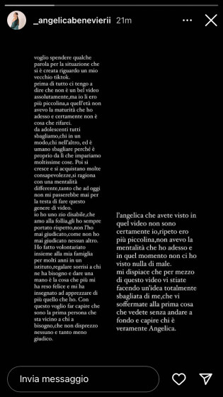 Angelica Benevieri torna sui social dopo la polemica per un suo video ironico sui disabili: ecco il suo intervento ufficiale