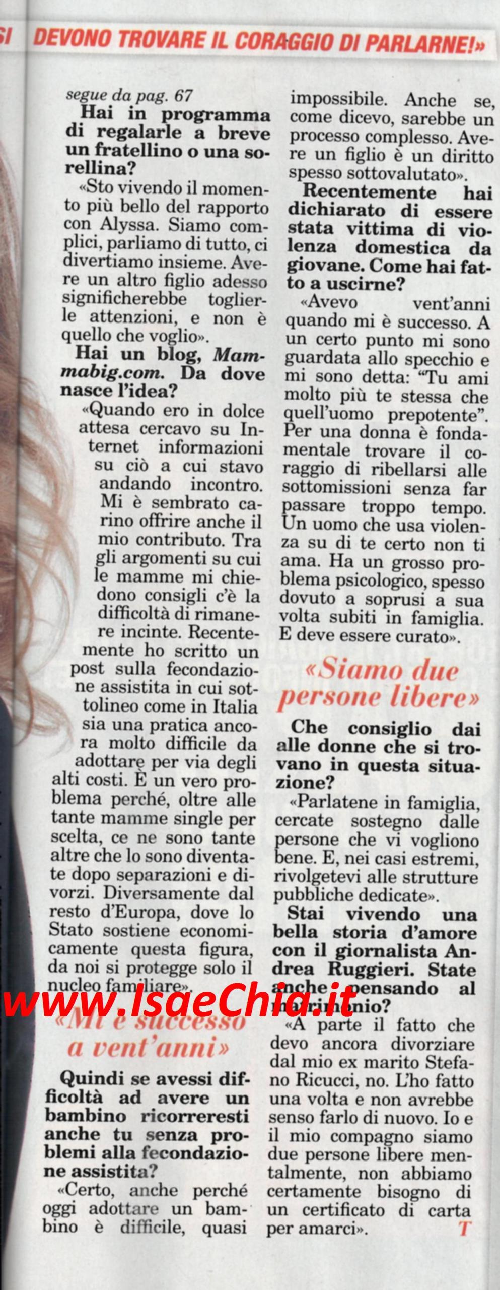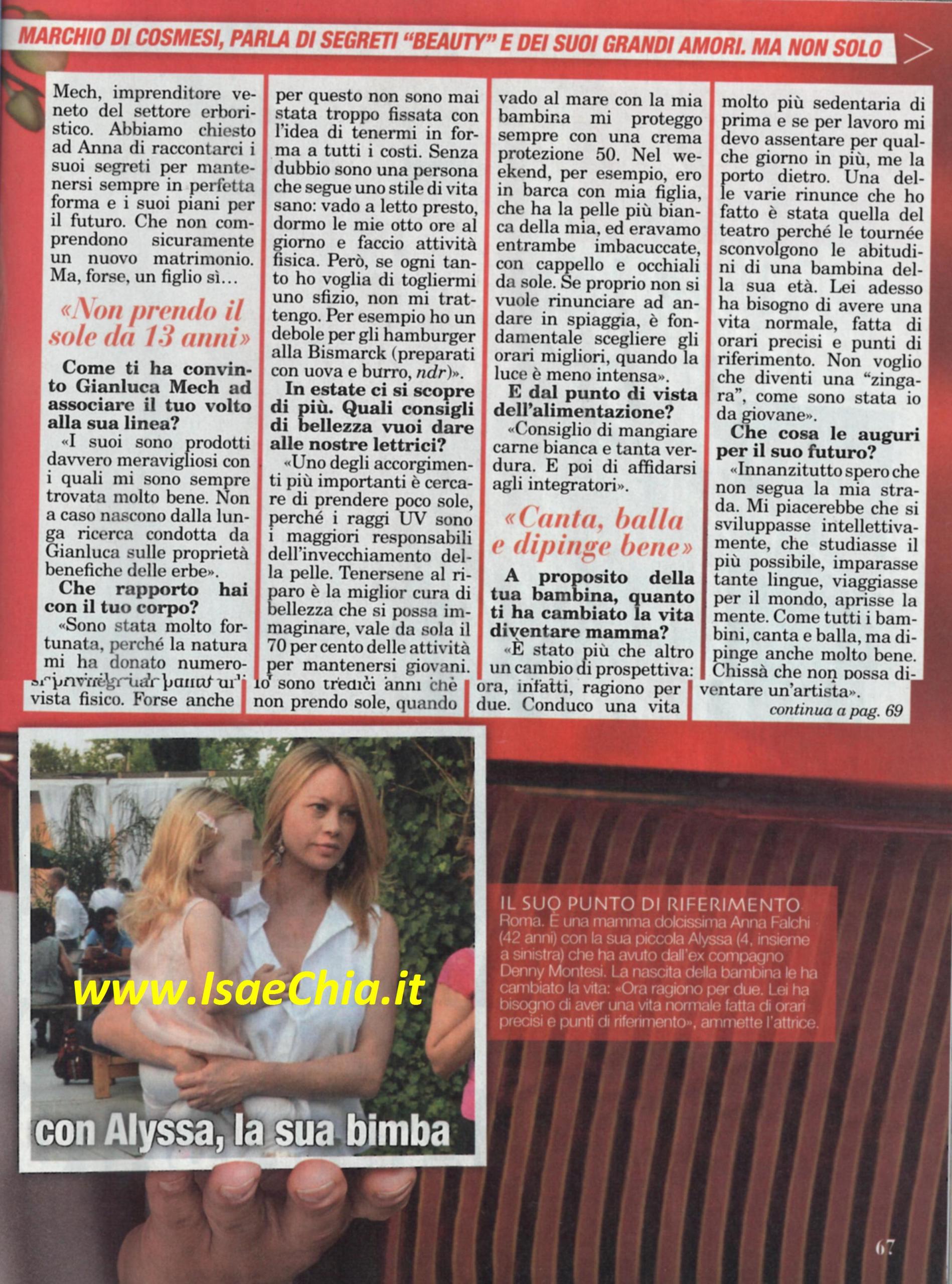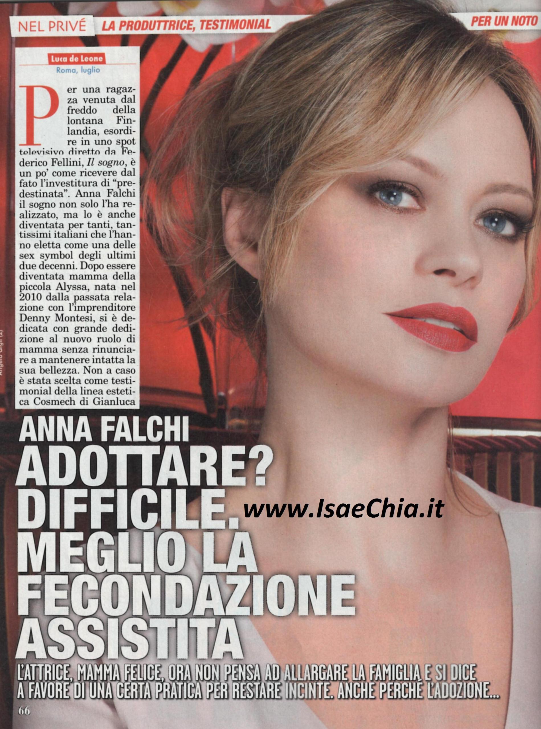 Dopo esser diventata mamma di Alyssa (nata dalla precedente relazione con Denny Montesi) nel 2010, Anna Falchi si è dedicata a questo suo nuovo ruolo con dedizione. Tuttavia, rimane un’icona di bellezza degli ultimi due decenni ed è stata scelta come testimonial per la linea estetica Cosmech di Gianluca Mech: “I suoi prodotti sono meravigliosi e mi sono sempre trovata molto bene. Non a caso nascono da una lunga ricerca sulle proprietà delle erbe. Sono fortunata perché la natura mi ha dato molti privilegi dal punto di vista fisico e per questo non sono mai stata fissata con la cura del corpo. Però ho uno stile di vita sano, anche se davanti agli hamburger alla Bismark, con uova e burro, non mi trattengo! Uno dei consigli che do è prendere poco sole, perché i raggi UV sono responsabili dell’invecchiamento della pelle. Tenersene al riparo è la cura migliore e vale da sola il 70% delle attività per mantenersi giovani. Io non prendo il sole da 13 anni e per la mia bambina uso creme con protezione 50. Nell’alimentazione consiglio carne bianca, verdura e affidarsi agli integratori” svela lei. Parlando del suo ruolo di mamma racconta: “Ora sono più sedentaria e se devo assentarmi qualche giorno in più, mi porto mia figlia dietro. Ho rinunciato ad andare in tournée per non sconvolgere le sue abitudini: non voglio che diventi una “zingara” come sono stata io da giovane. Mi piacerebbe che si sviluppasse intellettivamente, che studiasse il più possibile, imparasse le lingue, viaggiasse per il mondo e aprisse la mente. Come tutti i bimbi canta e balla, ma dipinge anche molto bene: chissà che non diventi un’artista. Sto vivendo un momento molto bello con lei e avere un altro figlio significherebbe toglierle attenzioni, e non voglio. Quando ero in attesa ho fondato il blog Mammabig.com e ho notato che tante donne mi chiedevano come restare incinte. Recentemente ho scritto un post sulla fecondazione assistita, notando che fosse molto difficile da fare in Italia per via degli alti costi. Ci sono tante mamme single che lo fanno per scelta, altre che lo sono diventate dopo separazioni e divorzi, ma l’Italia tende a sostenere poco questa figura e a tutelare il nucleo familiare. Anch’io ricorrerei all’assistita, anche perché adottare è un procedimento quasi impossibile. Avere un figlio è un diritto spesso sottovalutato”. Infine, quando le si chiede se ha intenzione di sposare il giornalista Andrea Ruggieri, con cui sta vivendo una bella storia d’amore, risponde: “A parte il fatto che devo ancora divorziare dal mio ex marito Stefano Ricucci, no. L’ho fatto una volta e non avrebbe senso farlo di nuovo. Siamo due persone libere mentalmente e non abbiamo bisogno di un certificato di carta per amarci”.