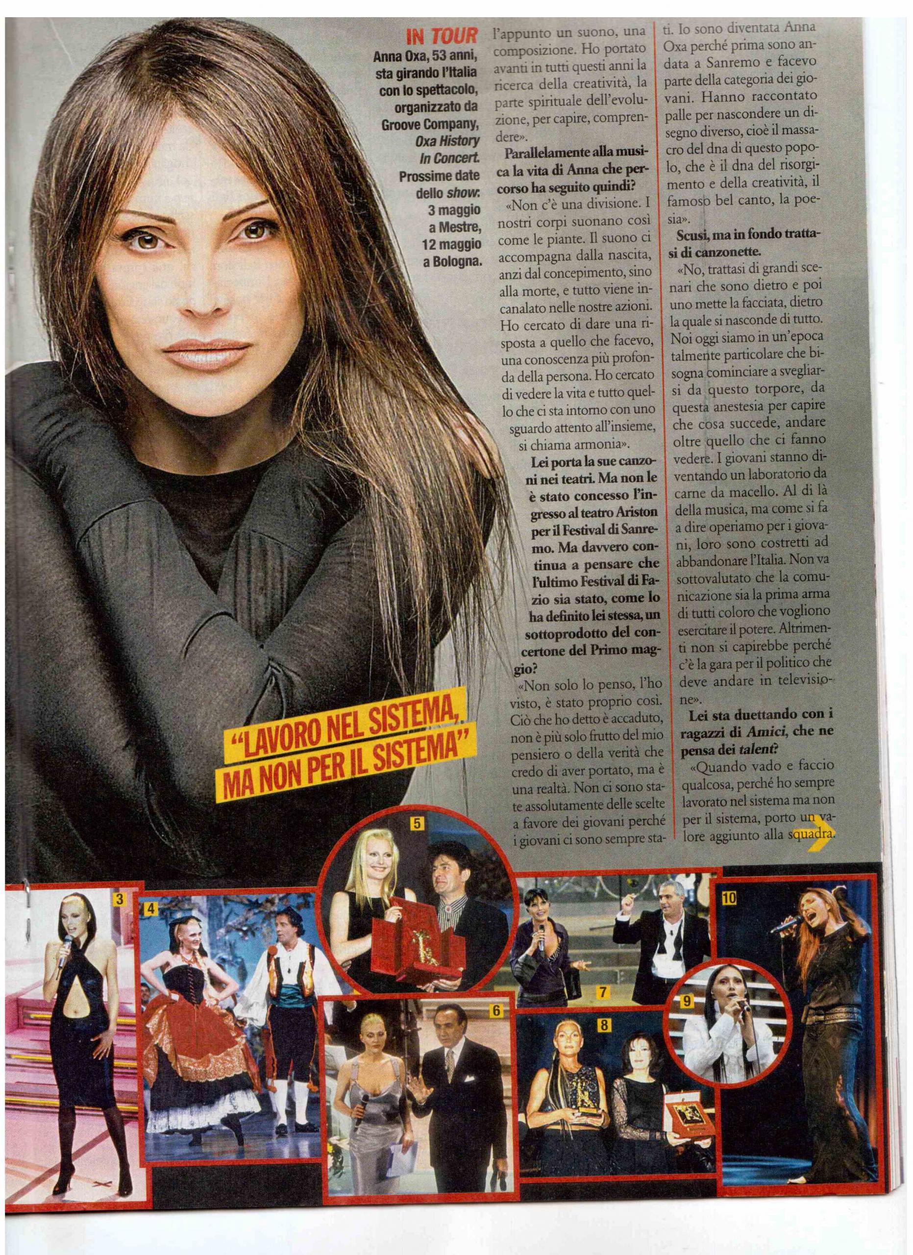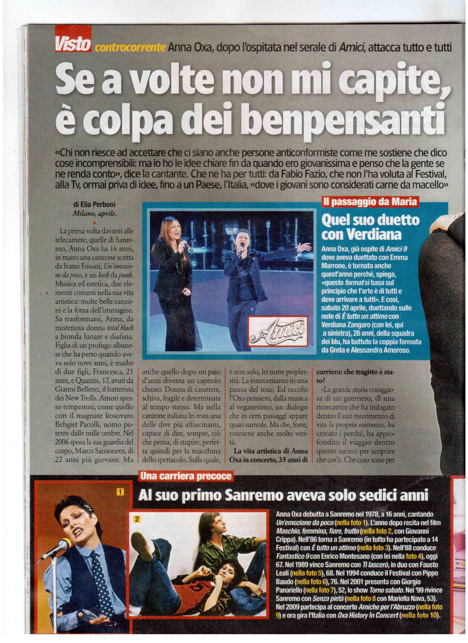 Anna Oxa è stata per la prima volta ad Amici nel 2009, quando ha duettato con la vincitrice di quell’edizione, Emma Marrone. Adesso, è tornata nel talent per duettare con Verdiana Zangaro. A proposito della sua partecipazione ha dichiarato: “Quando vado e faccio qualcosa, porto un valore aggiunto alla squadra. Chi intraprende questo percorso deve avere dentro di sé la coscienza artistica e quindi non sottovalutare il linguaggio corporeo, l’eleganza, lo stile, l’espressione, la pausa: anche quella è musica. Ad Amici ho trovato ragazzi con energia, carisma, conoscenza; cose che non vendono al mercato”. Quando le si chiede cosa pensa di Maria De Filippi, però, risponde: “Non m’interessa