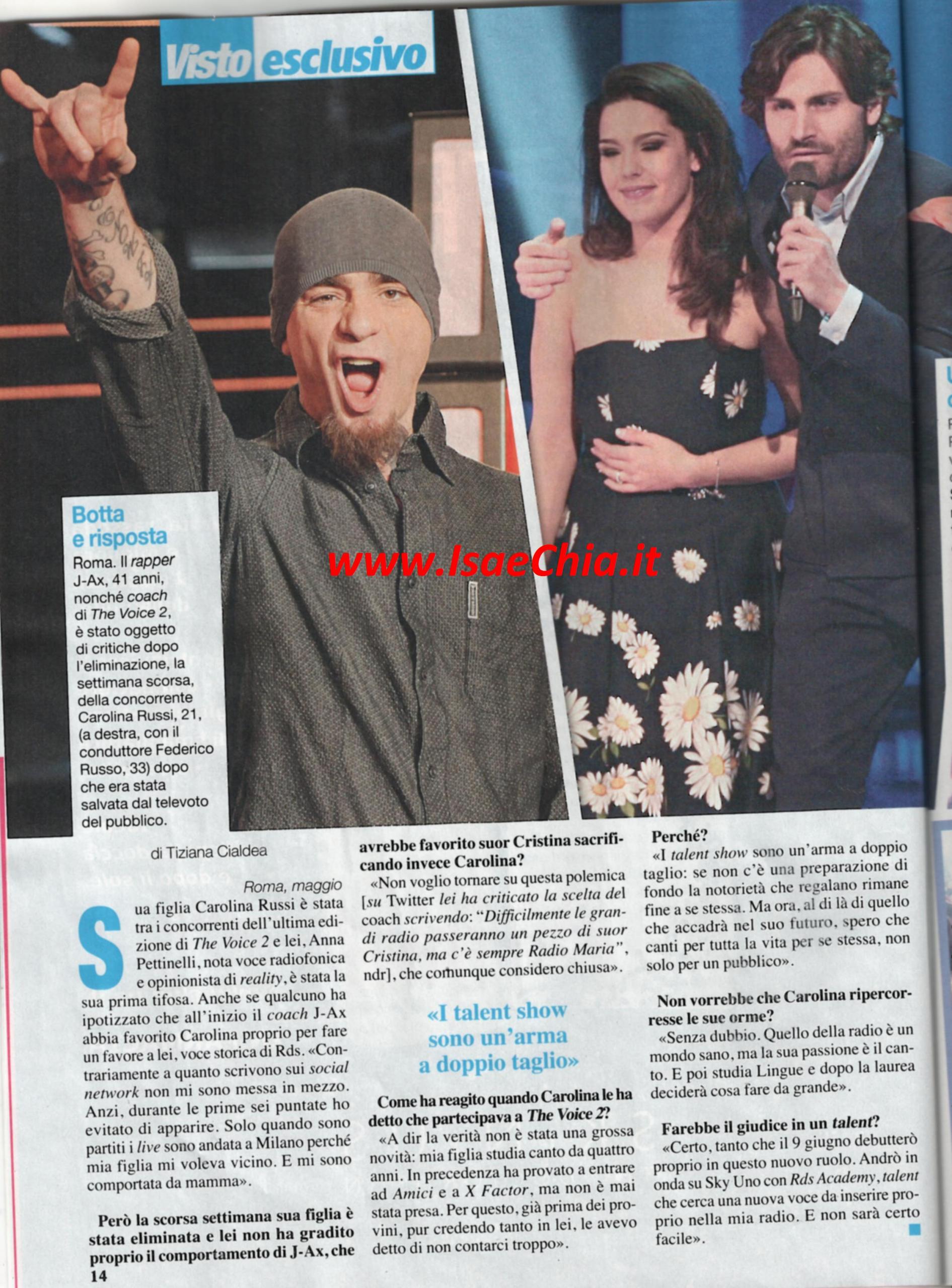 Tra le concorrenti di The Voice c’era Carolina Russi, figlia della nota speaker radiofonica ed opinionista Anna Pettinelli. La mamma non è apparsa per le prime puntate, finché la figlia non è arrivata ai Live, quando tuttavia, il coach J-Ax ha scelto di eliminarla. La Pettinelli ha commentato su Twitter: “Difficilmente le radio passeranno un pezzo di Suor Cristina, ma c’è sempre Radio Maria!”, alludendo al fatto che la suora nella squadra di Ax fosse favorita. Adesso, però, commenta così: “Non voglio tornare su questa polemica”. Quando le si chiede come ha reagito quando ha saputo che sua figlia avrebbe partecipato a The Voice, risponde: “Non era una novità: ha partecipato ai provini per Amici e X Factor, ma non era stata presa, quindi, pur credendo in lei, le avevo detto di non contarci troppo. I talent sono un’arma a doppio taglio: se non c’è preparazione, la notorietà che regalano rimane fine a se stessa. Al di là di ciò che accadrà in futuro, spero che Carolina canti tutta la vita per se stessa, non solo per il pubblico”. Tuttavia, Anna non è contraria ai talent: “Il 9 giugno debutterò come giudice in un talent, su Sky, con RDS Academy, in cui cerchiamo una nuova voce da inserire nella nostra radio!”