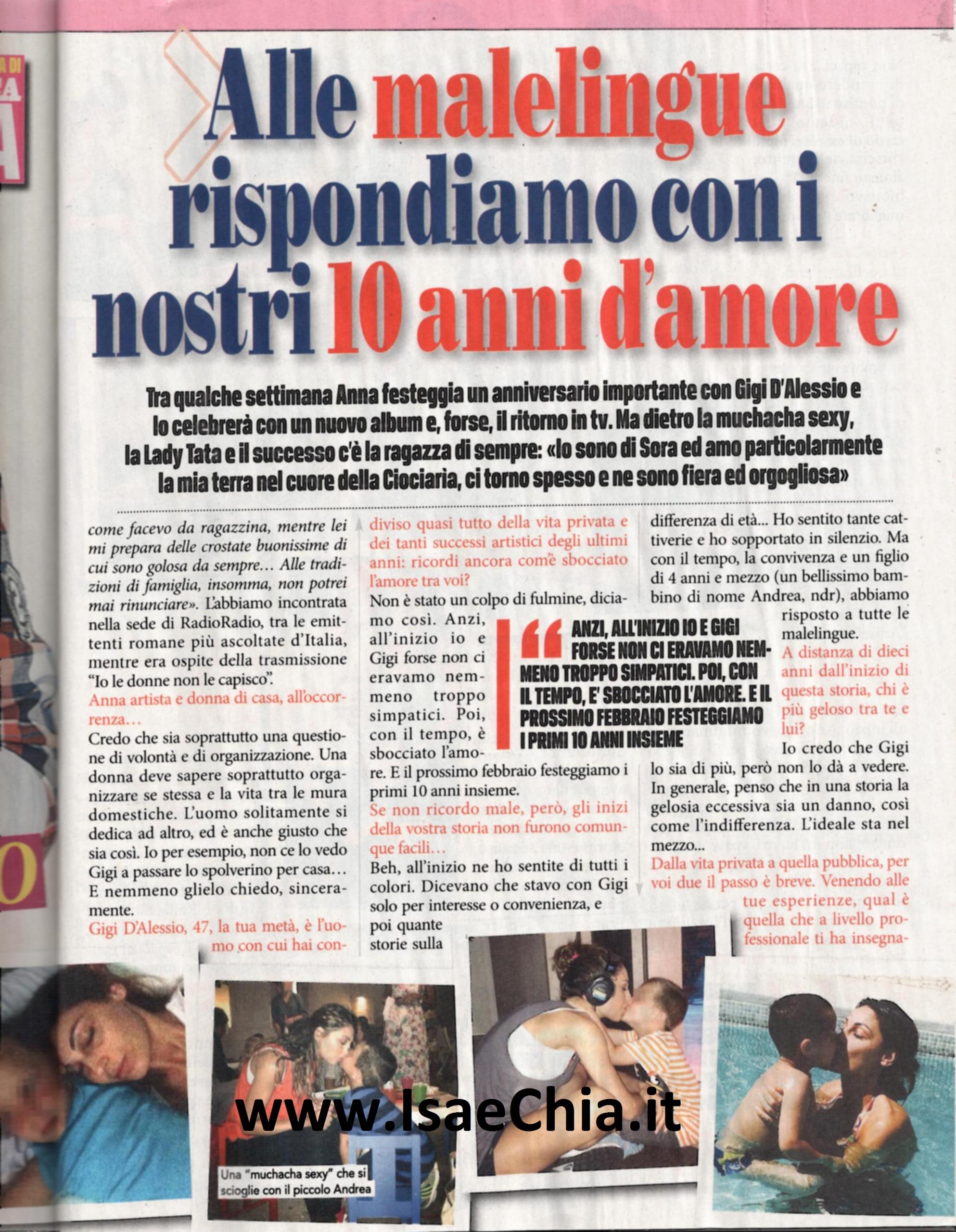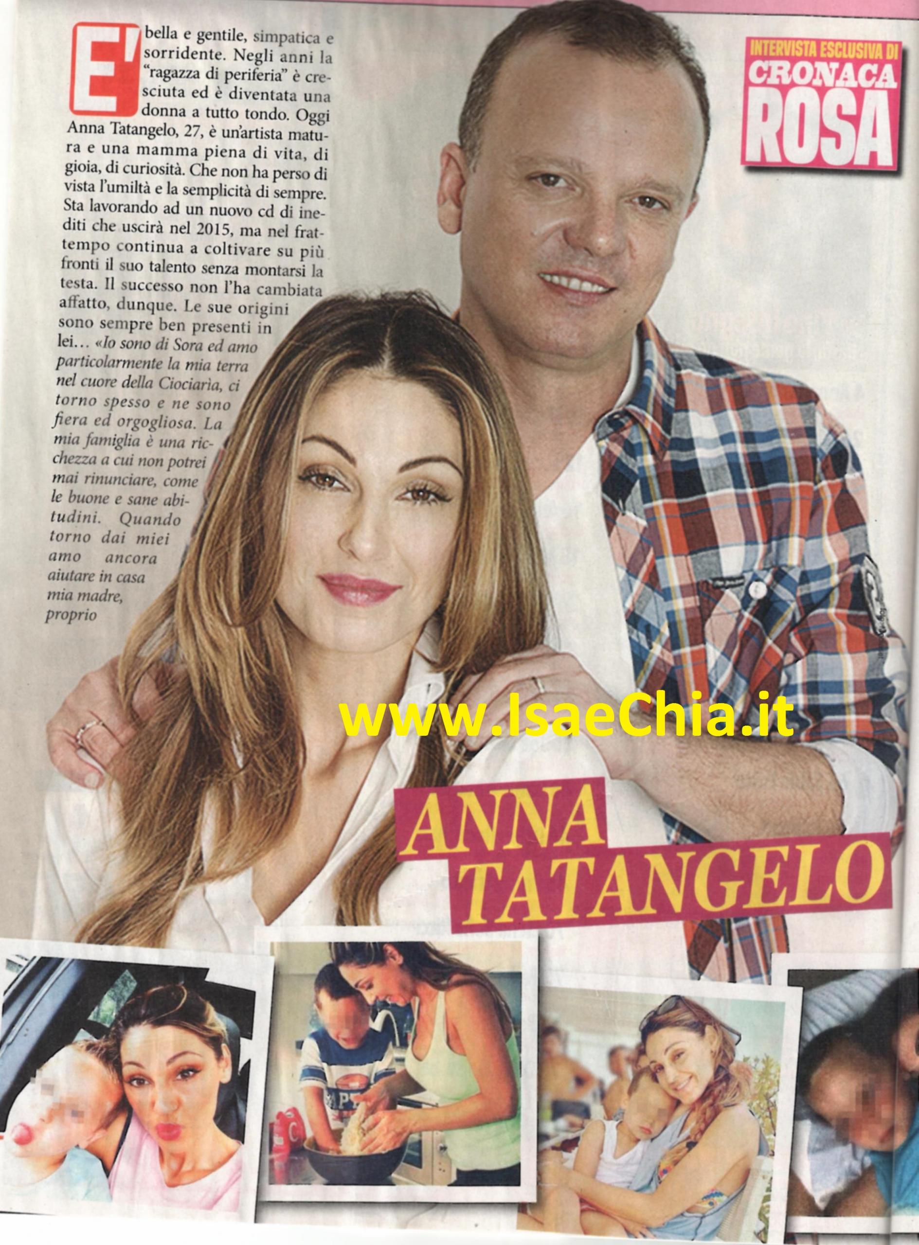 Vari Festival di Sanremo alle spalle, una partecipazione come giudice a X Factor e come concorrente a Ballando con le stelle, dove è arrivata in finale e uno show tutto suo con il compagno Gigi D’Alessio: Anna Tatangelo, ormai, è una cantante e donna di spettacolo matura, che si prepara a pubblicare un nuovo album nel 2015. Eppure, non si è mai dimenticata delle sue origini e non si è montata la testa: “Io sono di Sora e amo la mia terra, la Ciociaria. Ci torno spesso e ne sono fiera ed orgogliosa. La mia famiglia è una ricchezza a cui non potrei mai rinunciare, come le mie sane abitudini. Quando torno a casa, aiuto mia madre in casa come facevo da ragazzina, mentre lei mi prepara le sue crostate!” ha rivelato lei, mostrando il suo lato “casalingo”: “E’ una questione di volontà e organizzazione: una donna deve saper organizzare la sua vita e se stessa. Io non ce lo vedo Gigi a passare lo spolverino per casa, e nemmeno glielo chiedo!”. E, a proposito, racconta la storia con il cantante napoletano, che ormai è arrivata al suo decimo anno: “Non è stato colpo di fulmine, anzi, forse non ci stavamo neanche troppo simpatici. Poi, con il tempo, è sbocciato l’amore, che il prossimo 10 febbraio compirà dieci anni. All’inizio ne ho sentite di tutti i colori: dicevano che stavo con lui solo per convenienza. E quante storie sulla differenza d’età! Ho sopportato in silenzio, ma col tempo, una convivenza e Andrea, nostro figlio di 4 anni e mezzo, abbiamo messo a tacere le malelingue. Gelosia? Eccessiva è un danno, così come l’indifferenza. Credo che Gigi sia più geloso, ma non lo dia a vedere”. Invece, ripercorrendo la sua carriera, commenta: “Cerco di prendere qualcosa da ogni esperienza. X Factor è stato impegnativo ma anche molto bello; ai concorrenti ho cercato di trasmettere il mio pensiero fisso: mai sentirsi arrivati e sfruttare al meglio ogni occasione per imparare. A Ballando, invece, ero terrorizzata: non sapevo ballare, ero il classico pezzo di legno, ma poi mi sono divertita. E’ stata una scommessa ed è andata bene, anche se era un’incognita assoluta. Nel mio ultimo singolo, Muchacha, ho mostrato una Anna più sexy. Sono contenta del successo che ha avuto e del video, che esprime sensualità senza essere volgare. Francesco Silvestre, detto Kekko, dei Modà, aveva già scritto per me e continueremo a collaborare nel mio album, previsto per il prossimo anno: ancora qualche mese di pazienza e sarà ultimato. Il cinema e la recitazione? Non escludo niente, mi piace l’idea di poter fare esperienze che completino la mia formazione artistica. Penso a donne come Mina e Raffaella Carrà: quelli sono esempi, donne piene di talento e capaci di mettersi in gioco sempre e comunque. Lady Tata, Muchacha sexy…Sono semplicemente Anna, basta definizioni”.