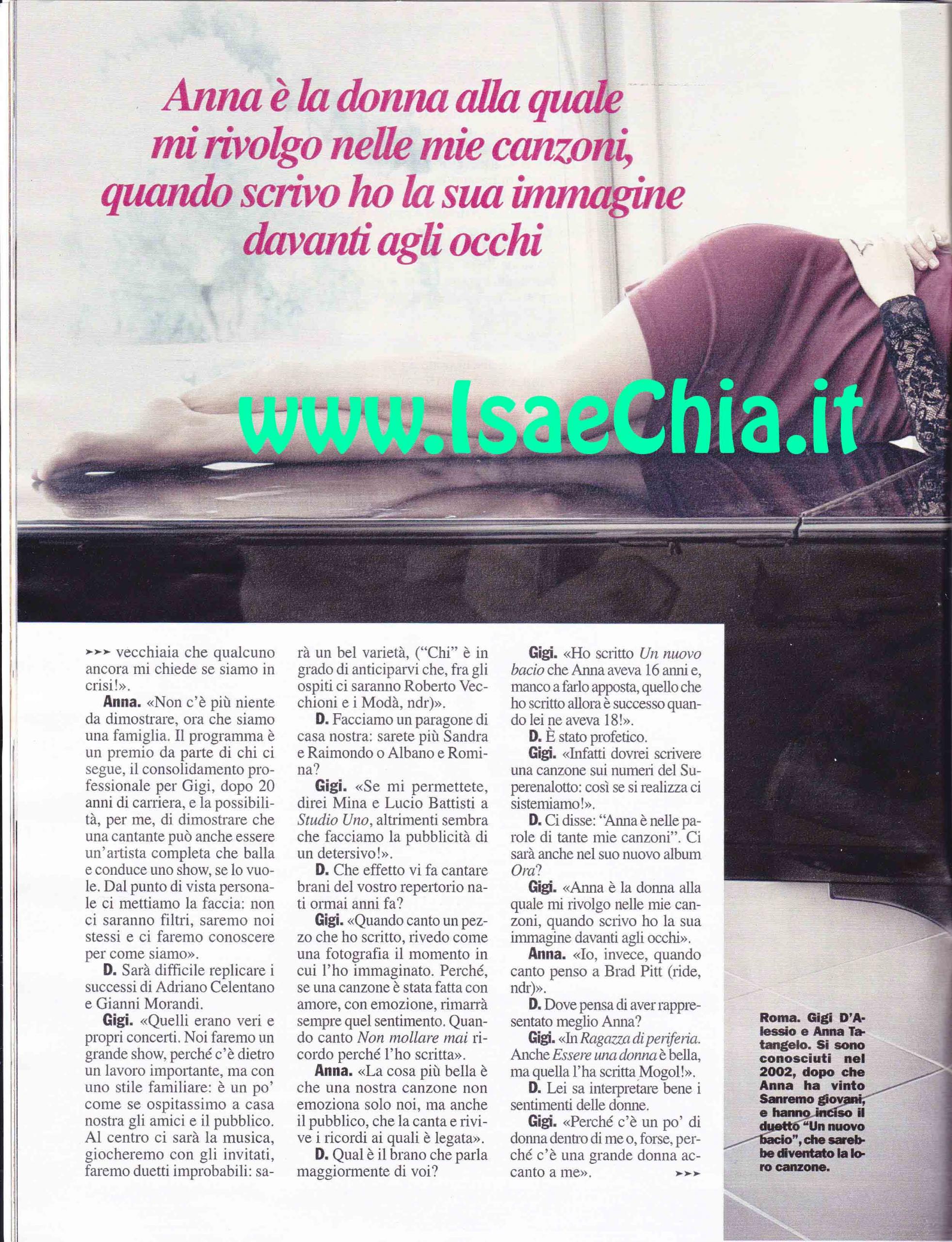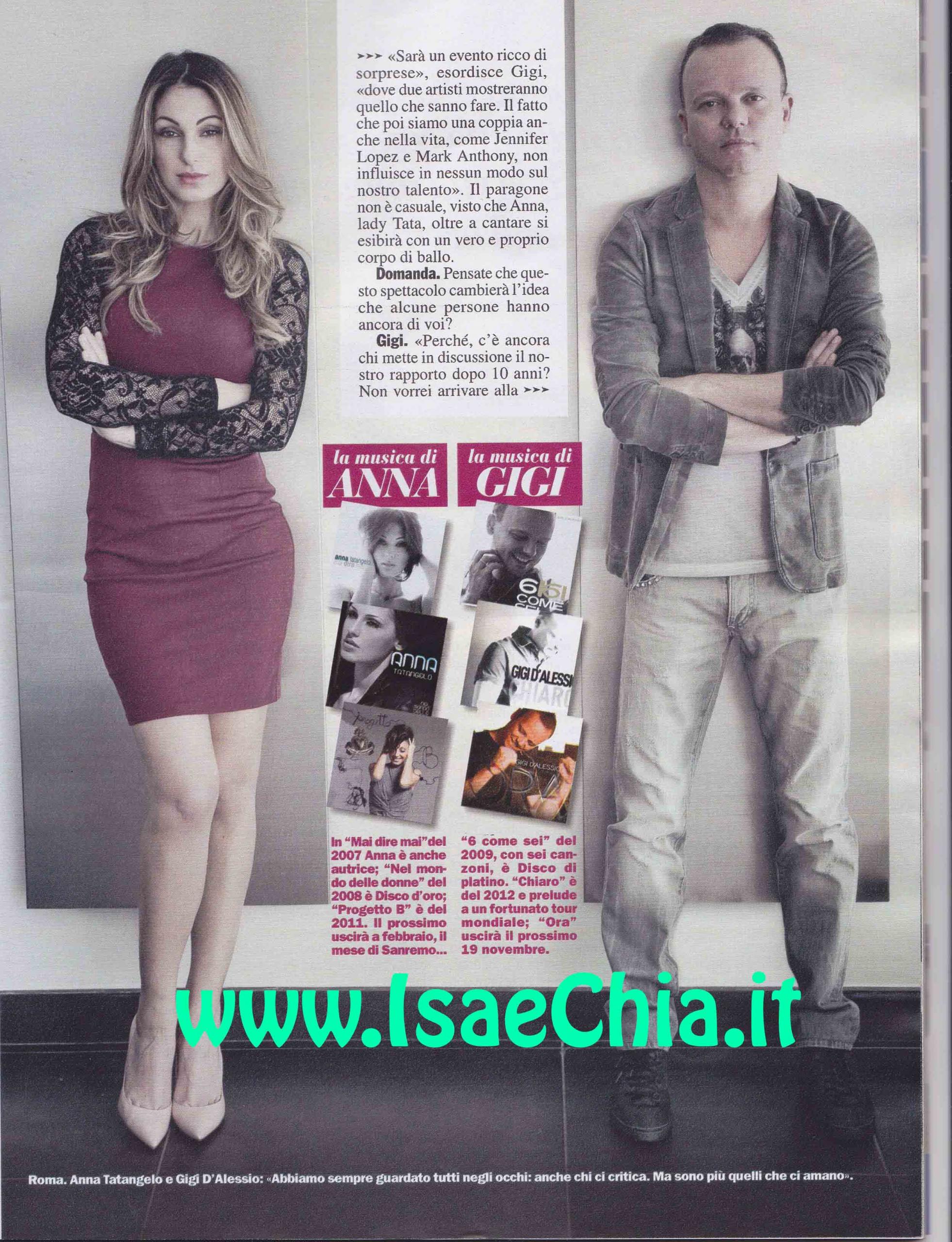 Nonostante le voci, la storia tra i cantanti Gigi D’Alessio e Anna Tatangelo prosegue a gonfie vele da ormai dieci anni. E per coronare il loro amore, i due avranno uno show tutto loro dal 25 novembre su Canale 5: “Sarà un evento ricco di sorprese, dove due artisti mostreranno quello che sanno fare. Il fatto che siamo una coppia non incide sul nostro talento. Tata, oltre a cantare, si esibirà con un vero e proprio corpo di ballo. C’è ancora chi mette in discussione il nostro rapporto? Non vorrei dover arrivare alla vecchiaia e dover dimostrare che non siamo in crisi” dice Gigi. Anna gli fa eco: “Non c’è più niente da dimostrare, ora che siamo una famiglia. Il programma è un consolidamento per i 20 anni di carriera di Gigi e per me un’occasione per dimostrare che una cantante può anche ballare e condurre uno show”. “Ci sarà la musica al centro, ma giocheremo con gli invitati e faremo duetti improbabili. Un po’ come Mina e Lucio Battisti in Studio Uno“. Parlando dell’ispirazione per le canzoni, il cantautore napoletano spiega: “Anna è la donna alla quale mi rivolgo nelle mie canzoni. Ho scritto Un nuovo bacio quando Anna aveva 16 anni ed è successo davvero quando ne aveva 18: è stata profetica. Noi cresciamo insieme nell’imparare a dividere la vita con un’altra persona. Prima partivo e tornavo senza avvisare, ora ho imparato che una telefonata e un messaggio sono importanti e che l’amore può bussare alla tua porta una seconda volta”. Anna rivela il segreto del loro amore: “Abbozzare: la convivenza è difficile, bisogna avere pazienza. A volte i matrimoni saltano per l’incapacità di accettare l’altro. E noi donne decidiamo quando far credere agli uomini di portare i pantaloni!”. Parlando del piccolo Andrea, svelano: “In bici fa le capriole, ma io non voglio saperne niente: sono il papà buono che concede tutto. Anna, invece, la mamma che si agita! La natura mi ha fatto bello e mangio quello che voglio. Anna, invece, è alla ricerca della forma perfetta: coca cola zero, formaggio zero, tra poco in frigo avremo anche Renato Zero!” scherza Gigi. Mentre sul recente furto che hanno subito, spiega: “Non è vero che sono intervenuti i servizi segreti! Mi sono stati rubati oggetti dal valore affettivo inestimabile, come regali per il battesimo di Andrea o i ricordi dei miei parenti. Di una collezione intera, è stato ritrovato solo un orologio in Germania”. E infine, quando si chiede loro che effetto fa la parola matrimonio, rispondono:” Per ora facciamo i testimoni ai matrimoni degli altri…così vediamo come si trovano! Il segreto per stare insieme lo abbiamo scoperto, quindi non ci serve altro!”