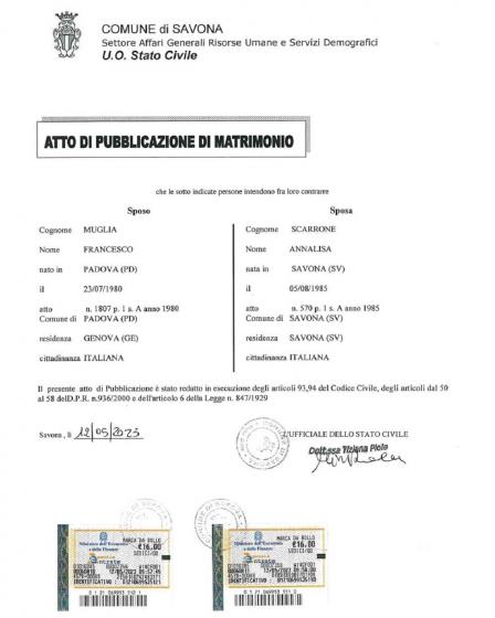 La conferma che Annalisa sposerà Francesco Muglia è arrivata dal comune di Savona che ha affisso proprio nella giornata odierna le pubblicazione di matrimonio nell’albo pretorio.