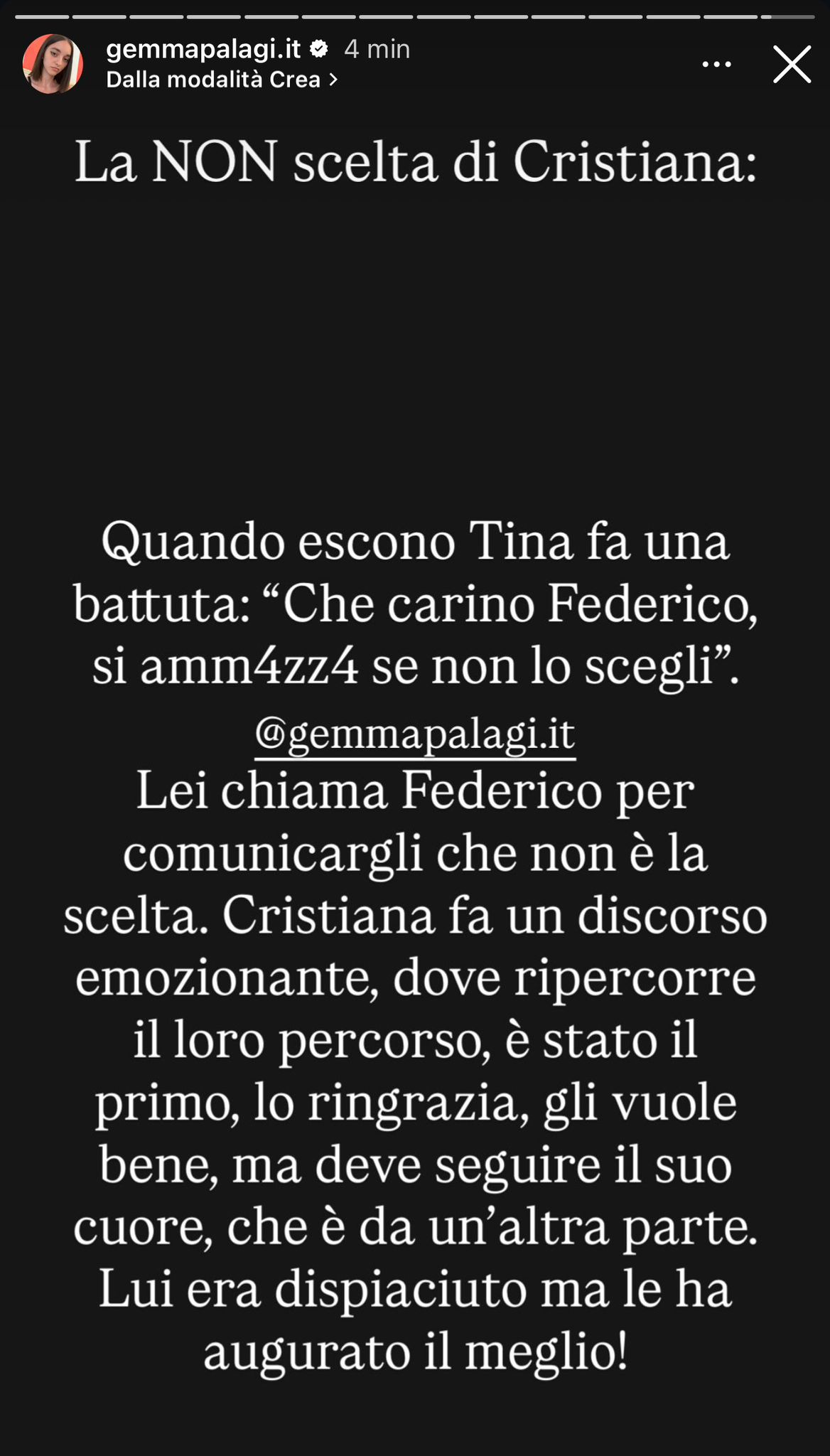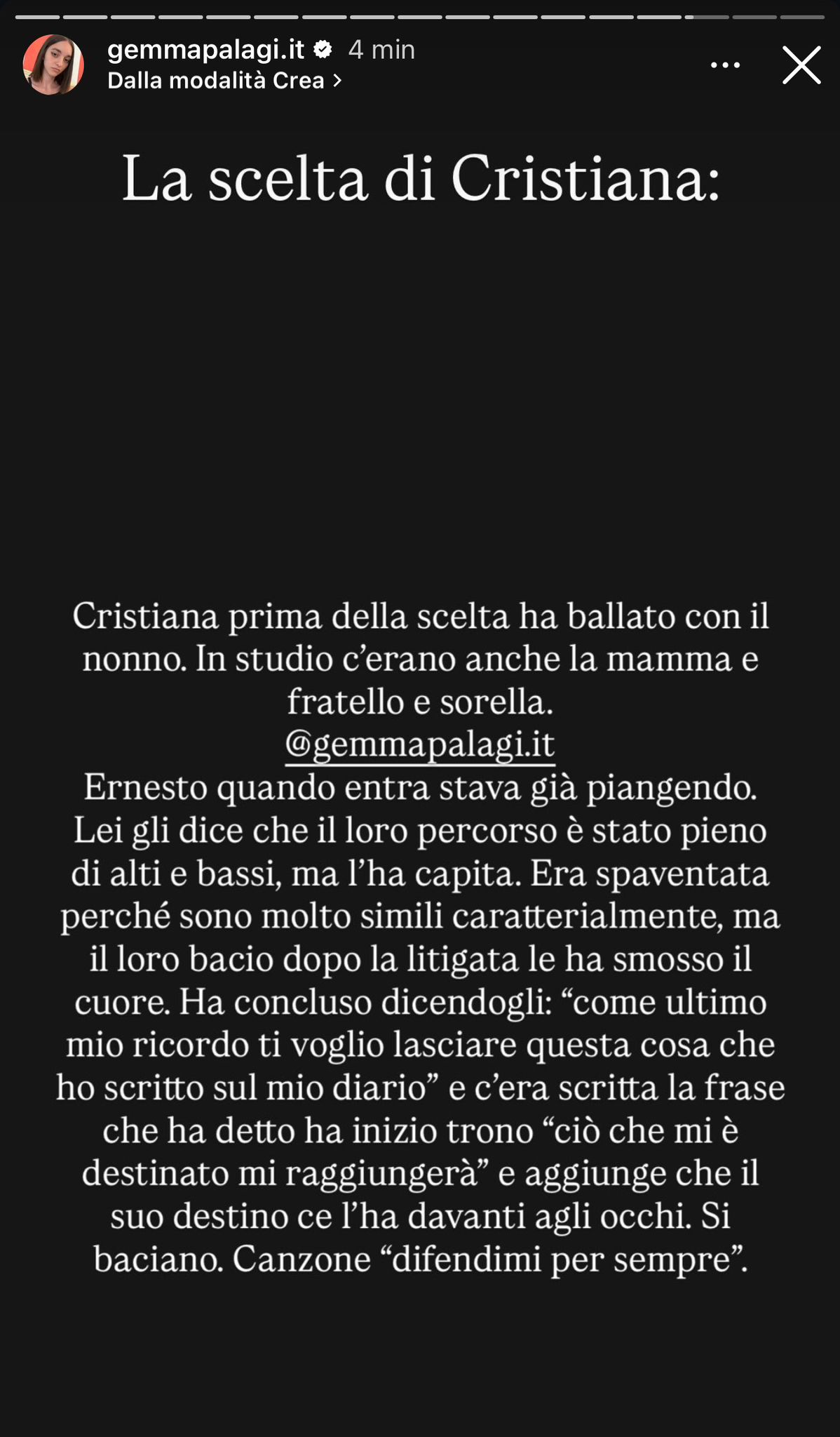Dopo mesi di frequentazioni e alti e bassi, la tronista ha deciso di continuare il suo percorso fuori dal programma con il corteggiatore Ernesto Passaro, preferendolo a Federico Cotugno. Nelle scorse settimane, Cristiana aveva vissuto una romantica esterna con Ernesto sotto il cielo di Roma: tra loro un romantico bacio e la conferma di lui di essersi innamorato. Tuttavia, in studio, il ragazzo aveva espresso la paura di non essere la sua scelta.