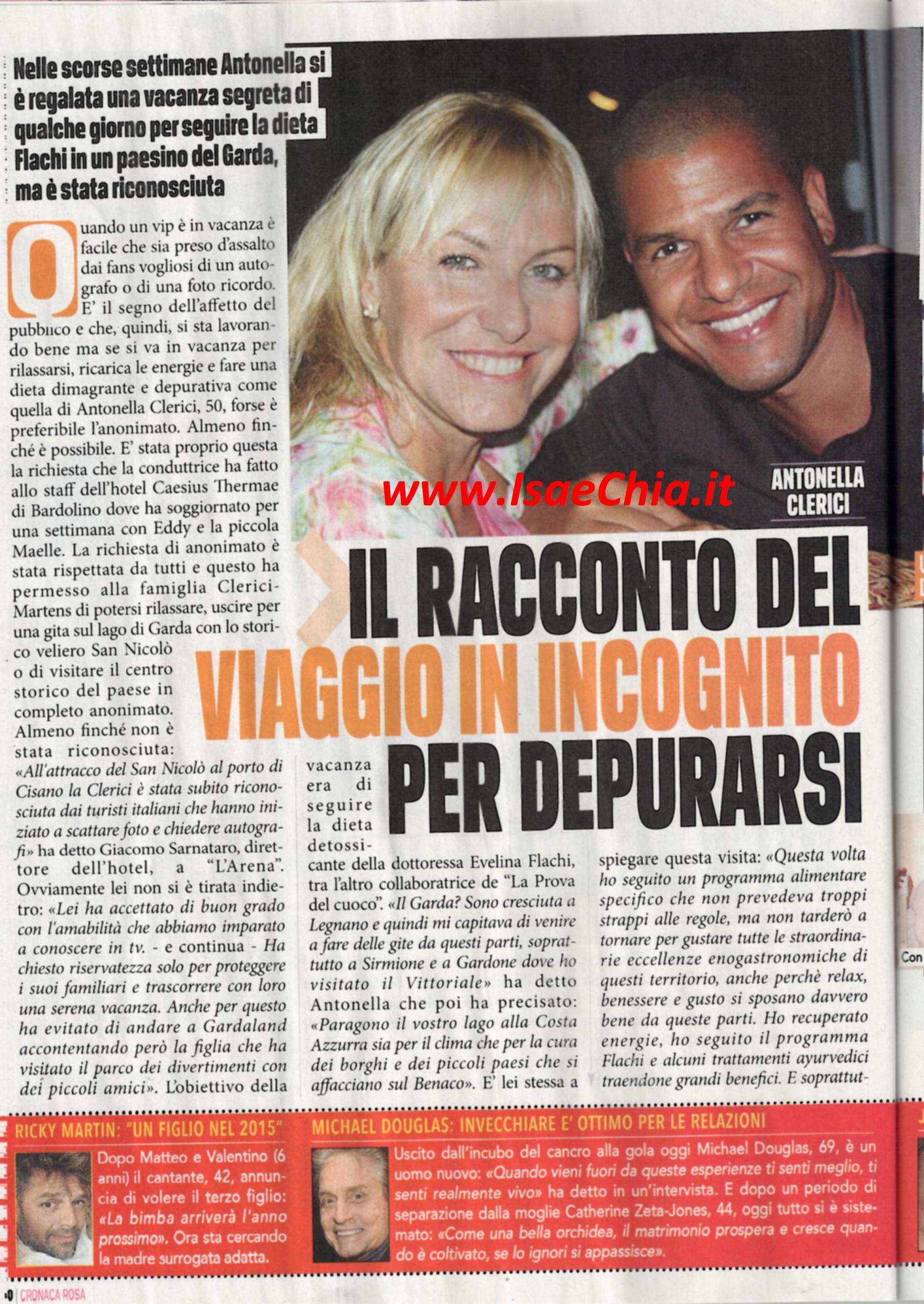 Quando un Vip è in vacanza, è facile che sia preso d’assalto dai curiosi, dai fotografi o semplicemente dai fan che vogliono una foto ricordo. Ecco perché la conduttrice Antonella Clerici ha chiesto allo staff dell’Hotel Caesius Thermae di Bardolino di mantenere l’anonimato mentre era in vacanza col compagno Eddy Martens e la figlia Maelle…Almeno finché non è stata riconosciuta: “Al porto di Cisano la Clerici è stata subito riconosciuta e lei ha accettato di buon grado di fare le foto, con l’amabilità che abbiamo visto in tv. Ha chiesto riservatezza solo per proteggere i suoi familiari. Anche per questo ha evitato di andare a Gardaland, anche se ha accontentato sua figlia, che ha visitato il parco giochi con degli amici” dice il direttore dell’hotel. Lo scopo della vacanza della Clerici era seguire la dieta disintossicante consigliatele da Evelina Flachi: “Ho seguito un programma alimentare che non prevedeva stroppi strappi alle regole, ma non tarderò a tornare per gustare le eccellenze gastronomiche di questo territorio, anche perché relax, benessere e gusto si sposano davvero bene da queste parti. Ho recuperato energie, ho seguito il programma e alcuni trattamenti traendone grandi benefici. E soprattutto, ho ritrovato un luogo speciale: Bardolino” dice la signora de La prova del cuoco. “La settimana trascorsa qui è stata una ricarica d’energia e credo che tornerò presto, magari approfittando di qualche weekend”. Ovviamente, con Eddy vicino: la crisi tra loro, infatti, sembra essere solo un ricordo e chi li ha visti insieme li ha trovati di nuovo felici.