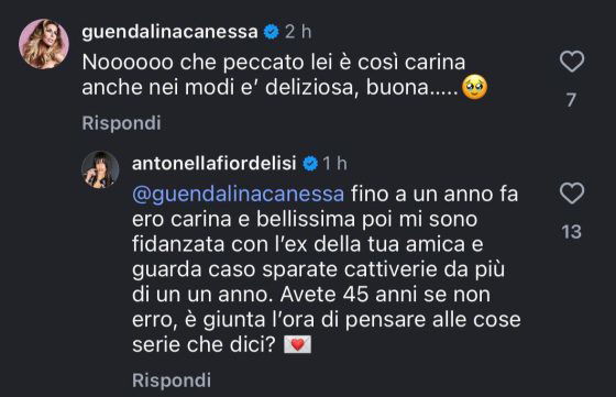 Il racconto di Antonella ha colpito i telespettatori, che si sono stretti alla showgirl, supportandola, ma tra i tanti commenti ricevuti spicca anche quello di Guendalina Canessa, a metà tra il serio e il faceto: “Noooooo che peccato lei è così carina anche nei modi e’ deliziosa, buona…..”.