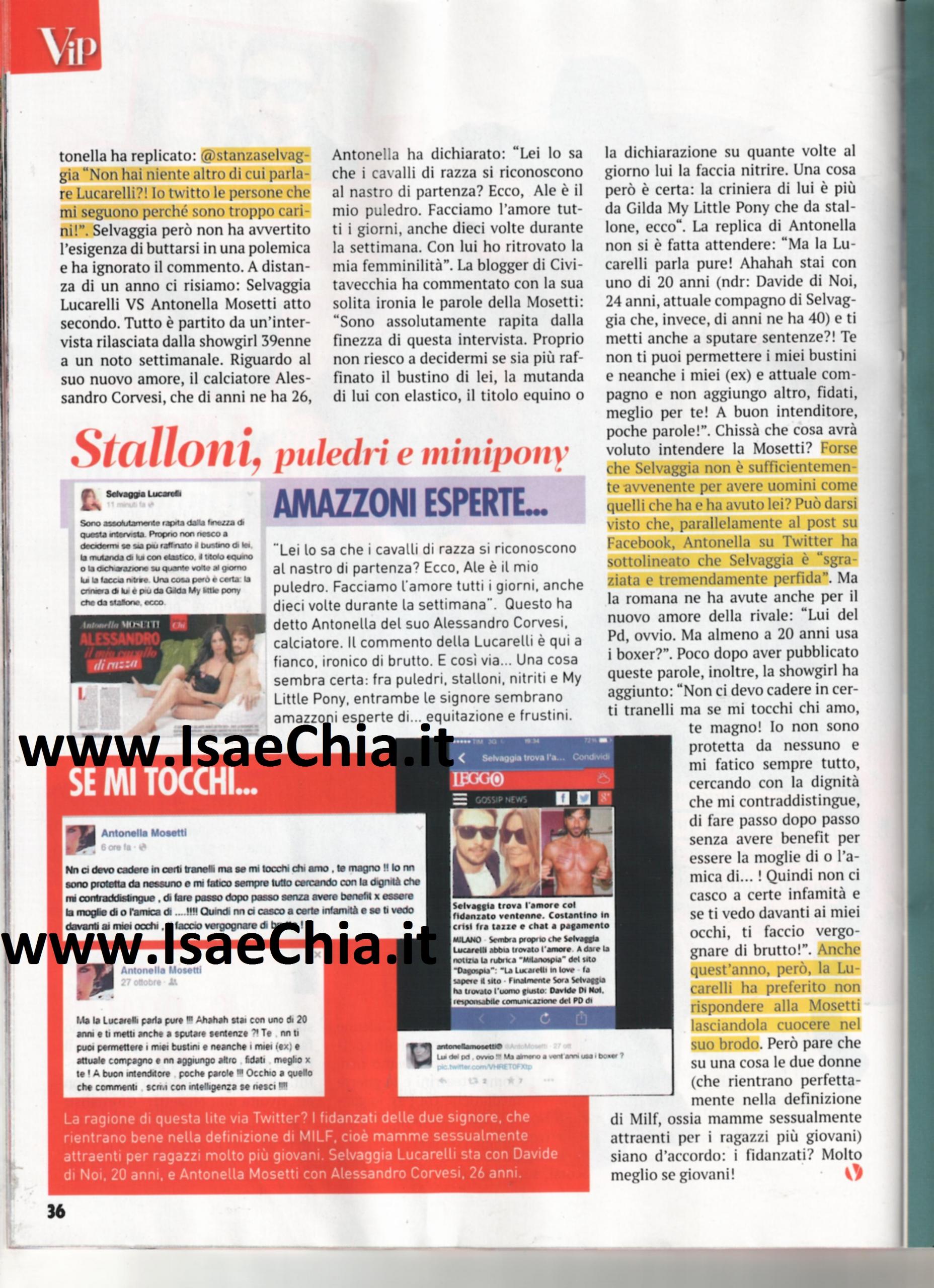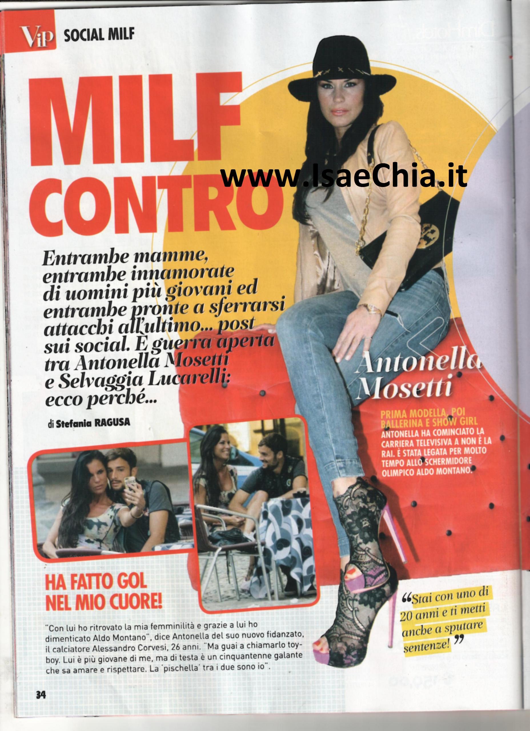 Recentemente la showgirl Antonella Mosetti ha fatto parlare di sé per le dichiarazioni piuttosto hot sulla passione con il suo nuovo, giovane fidanzato, il calciatore Alessandro Corvesi (QUI per rileggere l’articolo). Adesso, invece, ritorna l’astio tra lei e la blogger/opinionista Selvaggia Lucarelli. Il primo screzio con lei si era verificato l’anno scorso, quando la blogger scrisse: “Giornalisti stimati e navigati, pure di una certa età, che si ritwittano i complimenti come Antonella Mosetti. Ma il senso del ridicolo no?”. La Mosetti si risentì e replicò: “Non hai niente di cui parlare? Io twitto le persone che mi seguono perché sono troppo carine!”. Adesso, invece, tutto è nato dall’intervista di Antonella fatta con il suo Alessandro su Chi. La Lucarelli ha commentato le parole “E’ il mio puledro, facciamo l’amore tutti i giorni, anche dieci volte a settimana” così: “Sono assolutamente rapita dalla finezza di quest’intervista. Non riesco a decidermi se sia più raffinato il bustino di lei, la mutanda di lui con elastico, il titolo equino o la dichiarazione su quante volte al giorno la faccia nitrire. Una cosa è certa: la criniera di lui è più da Gilda My Little Pony che da stallone”. Anche stavolta, la Mosetti non se l’è tenuta. “Ma la Lucarelli esiste ancora? Stai con uno di vent’anni e ti permetti anche di sputare sentenze? Non ti puoi permettere i miei bustini e neanche i miei ex e attuale compagno”. Secondo le ultime indiscrezioni, infatti, Selvaggia starebbe con Davide Di Noi, esponente del PD 24enne, quindi di sedici anni più giovane, più o meno la stessa differenza d’età tra Mosetti e compagno. Ecco perché quest’ultima ha rincarato la dose: “Lui del PD, ovvio. Ma almeno a 20 anni usa i boxer? Non ci devo cadere in certi tranelli. Se mi tocchi chi amo, ti magno! Io non sono protetta da nessuno e mi fatico sempre tutto cercando la dignità che mi contraddistingue, senza avere benefit per essere la moglie o l’amica di…”. Selvaggia, ancora una volta, non ha replicato. Chi ha vinto la partita?