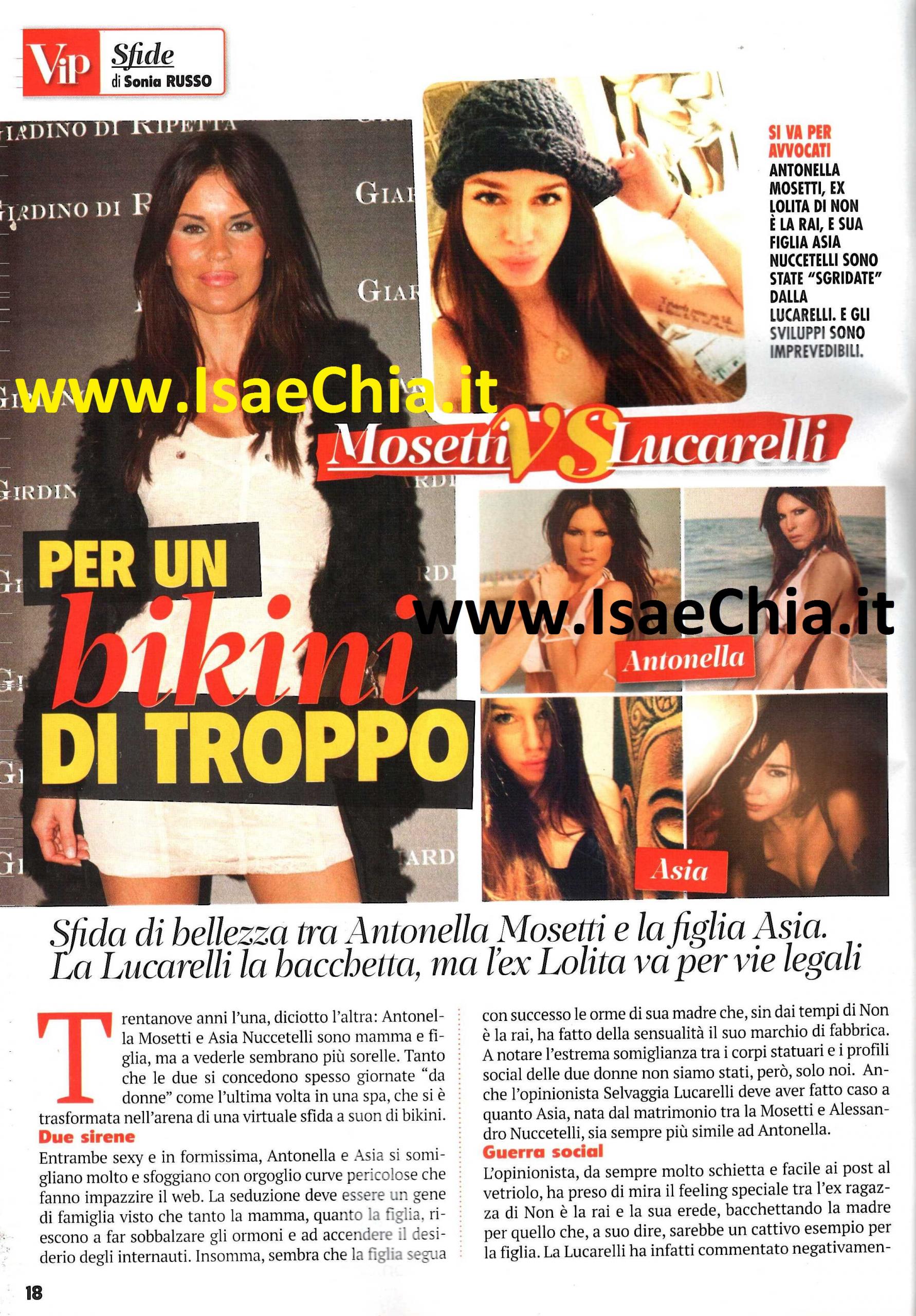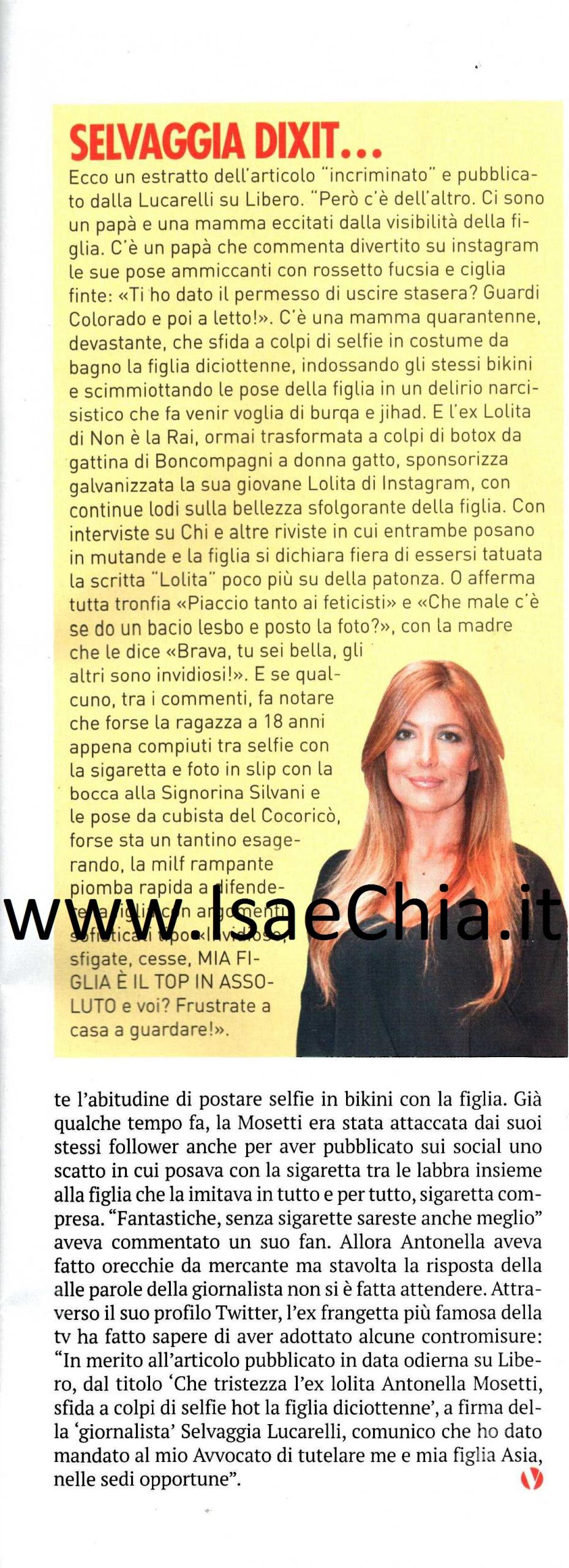 Solo ieri abbiamo visto la polemica che ha coinvolto la blogger Selvaggia Lucarelli e il politico Giuseppe Grasselli sui social network (clicca QUI per vedere l’articolo). Ma l’opinionista non è certo nuova a questo tipo di cose, anzi, si può dire che sia ormai il suo pane quotidiano. Solo pochi giorni prima, infatti, una discussione con la showgirl Antonella Mosetti l’aveva riguardata da vicino. La 39enne ex protagonista di Non è la rai, infatti, ha una figlia 18enne, Asia, avuta dall’imprenditore Alex Nuccetelli, che in quanto a sensualità ha ereditato appieno il corredo genetico della mamma. E deve essersene ben accorta la Lucarelli, che ha preso di mira il feeling speciale tra mamma e figlia (più volte dichiarato anche da loro stesse, come in QUESTO articolo) e ha commentato negativamente l’abitudine delle due di pubblicare selfie insieme. “Ci sono un papà e una mamma eccitati dalla visibilità della figlia. C’è un papà che commenta divertito su Instagram le sue pose ammiccanti con rossetto fucsia e ciglia finte: ‘Ti ho dato il permesso di uscire? Guardi Colorado e poi a letto!’. C’è una mamma quarantenne, devastante, che sfida a colpi di selfie in costume la figlia 18enne indossando gli stessi bikini e scimmiottando le pose della figlia in un delirio narcisistico che fa venir voglia di burqa e jihad. L’ex Lolita di Non è la Rai, ormai trasformata a colpi di botox da gattina di Gianni Boncompagni a donna gatto, sponsorizza galvanizzata la sua giovane Lolita su Instagram, con continue lodi sulla bellezza sfolgorante della figlia. Con interviste su Chi in cui entrambe posano in mutande e la figlia si dichiara fiera di essersi tatuata la scritta Lolita poco più su della patonza. O afferma ‘Piaccio ai feticisti’ o ‘Che male c’è se do un bacio lesbo e poi posto la foto?’ con la madre che le dice ‘Tu sei bella, gli altri sono invidiosi’. E se qualcuno tra i commenti le fa notare che a 18 anni, tra selfie con la sigaretta e con la bocca come la signorina Silvani e le pose da cubista del Cocoricò, forse sta un tantino esagerando, la milf rampante piomba rapida a difenderla con argomenti sofisticati tipo: ‘Invidiosi. Mia figlia è il top in assoluto. E voi? Sfigate a casa a guardare‘” sono state le parole usate da Selvaggia, riferendosi all’episodio in cui un fan che aveva commentato “Senza sigaretta sareste anche meglio” e la Mosetti aveva ribattuto. Quest’ultima, chiaramente, ha fatto già sapere di aver preso delle misure: “In merito all’articolo pubblicato oggi da Libero, a firma della ‘giornalista’ Selvaggia Lucarelli, comunico che ho già dato mandato al mio avvocato di tutelare me e mia figlia Asia nelle sedi opportune“. Pare, quindi, che non sia finita qui…