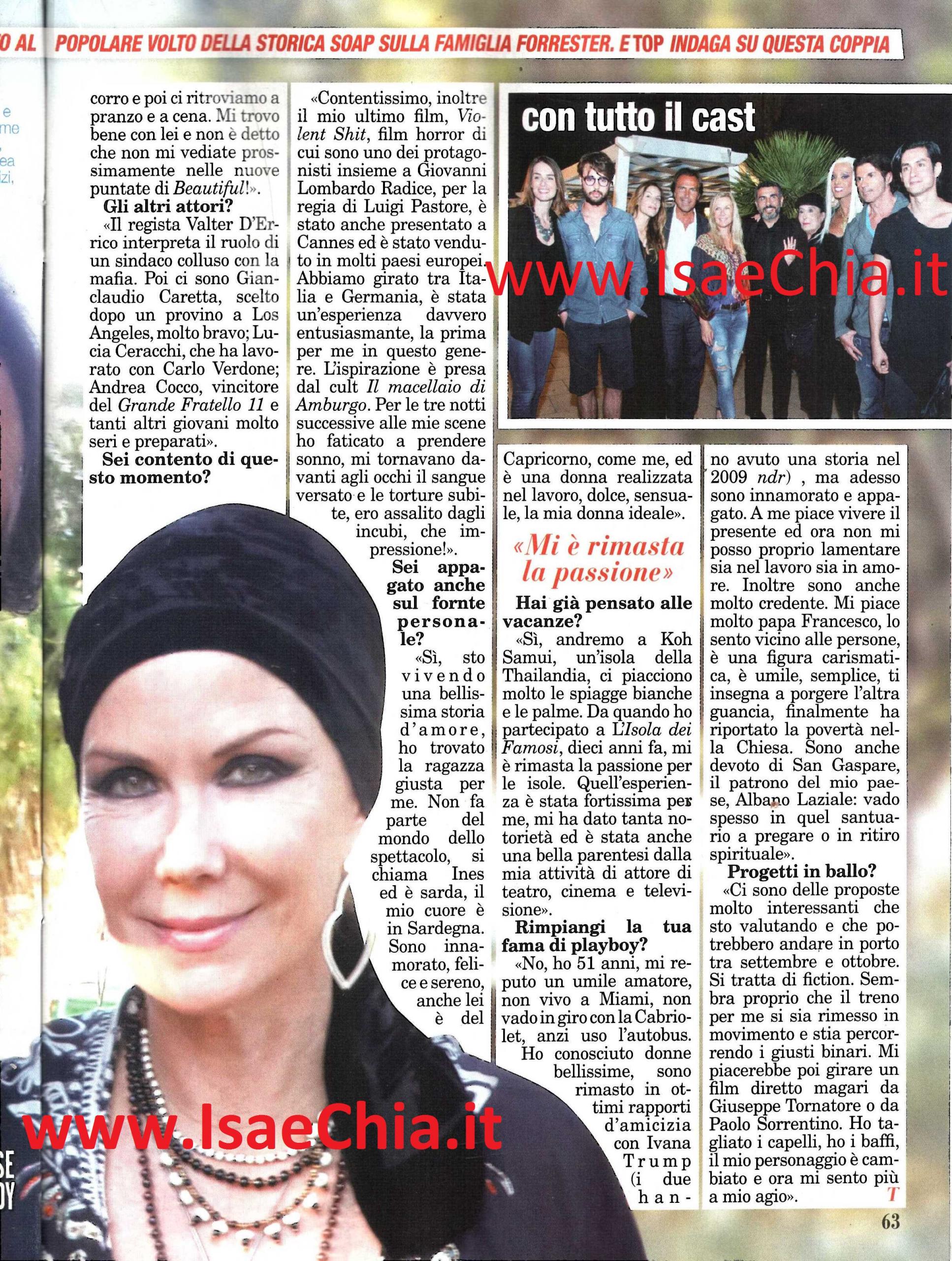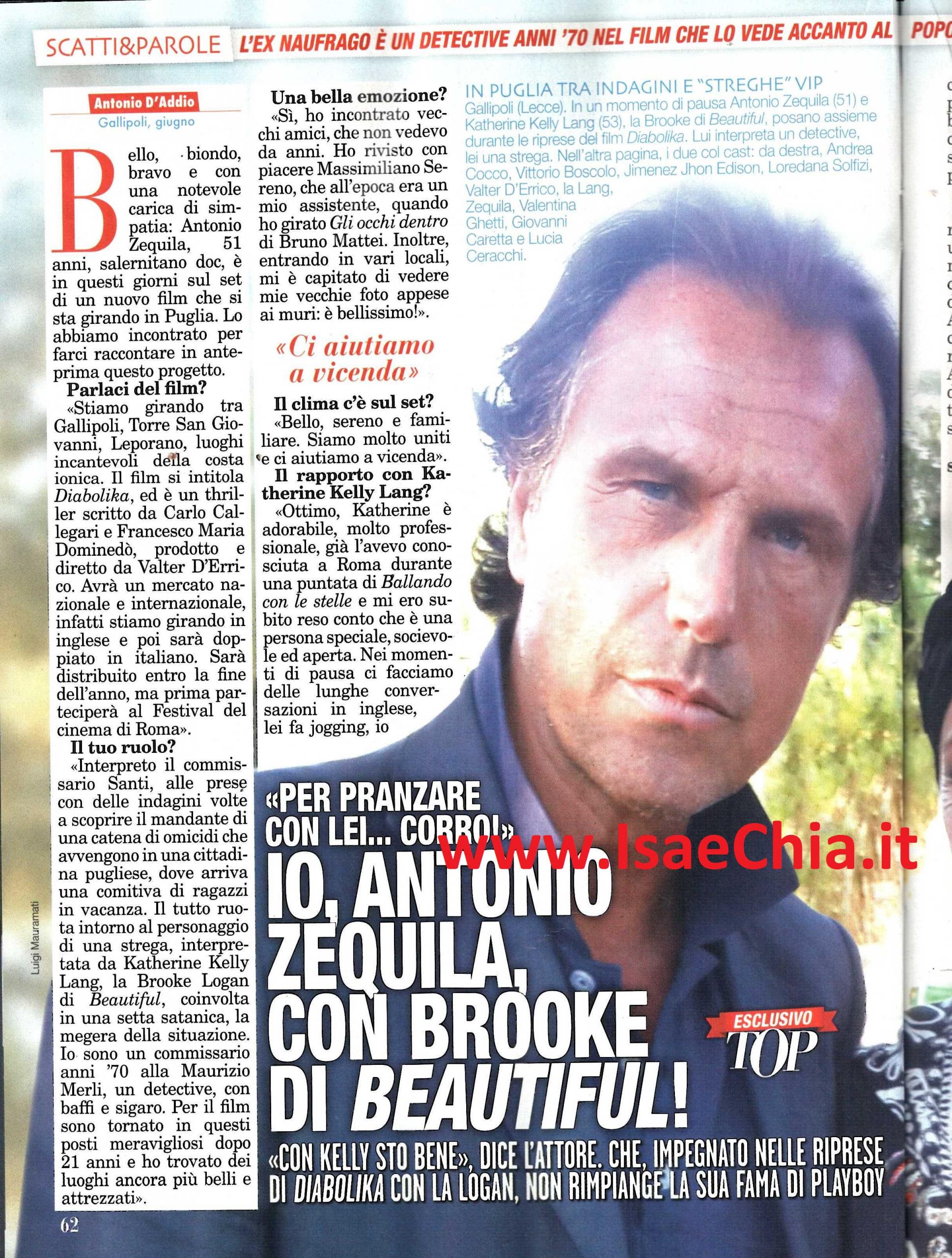 Sono passati alcuni anni da quando Antonio Zequila ha partecipato all’Isola dei famosi, facendo leva sul personaggio del ‘Mutanda‘, che ha molto divertito il pubblico. Adesso l’attore salernitano è alle prese con un nuovo film che sta girando in Puglia, che vanta nel cast la presenza anche di Katherine Kelly Lang, l’attrice famosa soprattutto per il ruolo di Brooke Logan nella soap Beautiful: “Stiamo girando tra Gallipoli, Torre San Giovanni e Leporano, luoghi incantevoli della costa ionica. Il film si intitola Diabolika ed è un thriller che avrà anche mercato internazionale: stiamo girando in inglese e verrà poi doppiato in italiano. Sarà distribuito entro la fine dell’anno, ma prima parteciperà al Festival del Cinema di Roma. Io interpreto il commissario Santi, alle prese con delle indagini per scoprire una serie di omicidi in una cittadina pugliese. Il tutto gira intorno a una strega, interpretata da Katherine Kelly, coinvolta in una setta satanica. Sono tornato in questi luoghi bellissimi dopo 21 anni e ho incontrato vecchi amici, come Massimiliano Sereni. Inoltre, entrando nei locali, mi è capitato di vedere mie vecchie foto appese ai muri: è bellissimo!“. Quando gli si chiede del rapporto con l’attrice statunitense, il playboy risponde: “Ottimo. Katherine è adorabile, molto professionale. Già l’avevo conosciuta durante una puntata di Ballando con le stelle e mi ero subito reso conto che è una persona speciale. Nei momenti di pausa ci facciamo delle lunghe conversazioni in inglese, lei fa jogging, io corro e poi ci ritroviamo a pranzo o a cena. Mi trovo bene con lei e non è detto che non mi vediate prossimamente nelle nuove puntate di Beautiful!”. Infine, quando gli si chiede se è contento di questo momento, Antonio risponde: “Contentissimo. Il mio ultimo film, Violent Shit, è stato presentato a Cannes ed è stato venduto in molti paesi europei. Dal punto di vista sentimentale, sto vivendo una bellissima storia d’amore, ho trovato la ragazza giusta per me. Non fa parte del mondo dello spettacolo, si chiama Ines ed è sarda. Sono innamorato, felice e sereno. E’ una donna realizzata nel lavoro, dolce, sensuale, la mia donna ideale! La fama di playboy? Non la rimpiango. Ho 51 anni, mi reputo un umile amatore, non vino a Miami, non giro con la Cabriolet. Ho conosciuto donne bellissime, sono rimasto in ottimi rapporti d’amicizia con Ivana Trump, l’ereditiera con cui ho vissuto una storia nel 2009, ma ora sono innamorato e appagato. A me piace vivere il presente e ora non mi posso proprio lamentare, sia sul lavoro che in amore!”.