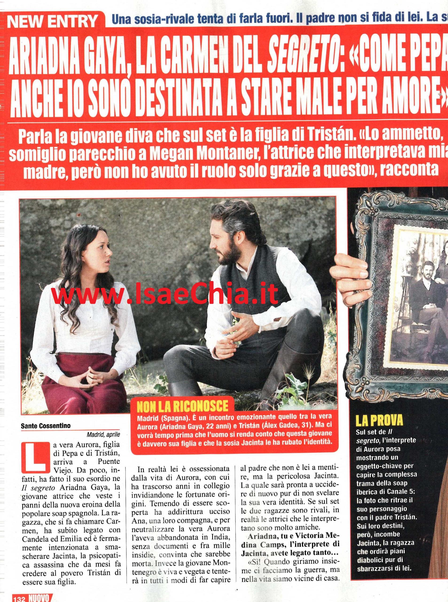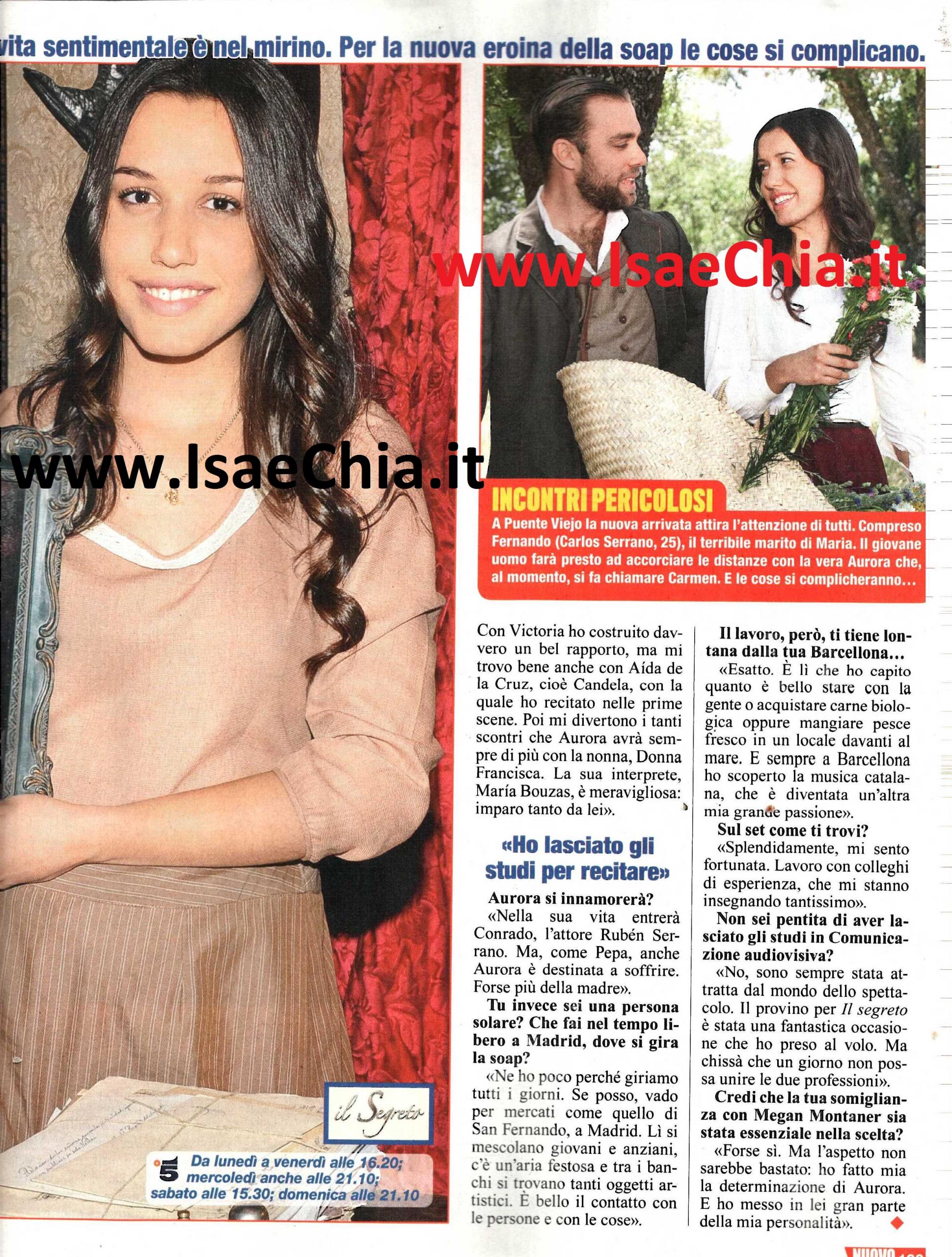 Il segreto è senza dubbio una delle soap più seguite degli ultimi tempi e anche questa stagione sta assicurando molti colpi di scena ai telespettatori. Al momento la vicenda principale riguarda la vera Aurora, la figlia avuta da Pepa e Tristan prima che Pepa morisse. Jacinta si sta spacciando per Aurora e ha ottenuto la fiducia del padre Tristan, mentre la vera Aurora si fa chiamare Carmen e lavora nella pasticceria di Candela. Così, infatti, aspetta di vendicarsi della psicopatica compagna di collegio, che le ha rubato l’identità. Intervistata, l’attrice Ariadna Gaya, scelta per interpretare proprio la figlia di Pepa, racconta che in realtà lei e Victoria Camps Medina, che interpreta la sua rivale Jacinta, sono amiche: “Sì, quando giriamo ci facciamo la guerra, ma nella vita siamo vicine di casa. Con Victoria ho costruito un bel rapporto, ma mi trovo bene anche con Aida De La Cruz, che interpreta Candela. Poi mi divertono gli scontri che Aurora avrà con la nonna, donna Francisca. La sua interprete, Maria Bouzas, è meravigliosa e imparo tanto da lei. Nella vita di Aurora entrerà Conrado, interpretato da Rubén Serrano, ma, come Pepa, anche lei è destinata a soffrire, forse più della madre“. Quando le si chiede cosa fa nel tempo libero, Ariadna racconta: “Ora ne ho poco, perché giriamo tutti i giorni, ma se posso, giro per i mercatini, di Madrid, come quello di San Fernando. Ma è nella mia Barcellona che ho scoperto quanto sia importante carne biologica o il pesce appena pescato, e lì ho scoperto la musica catalana, un’altra mia grande passione. Non sono pentita di aver lasciato i miei studi in Comunicazione audiovisiva: sono sempre stata attratta dal mondo dello spettacolo. Il provino per Il segreto è stata un’occasione che ho colto al volo, ma chissà che un giorno non possa unire le due professioni! Credo che forse la somiglianza con Megan Montaner sia stata importante per la mia scelta, ma solo l’aspetto non sarebbe bastato. Ho fatto mia la determinazione di Aurora e ho messo in lei gran parte della mia personalità“.