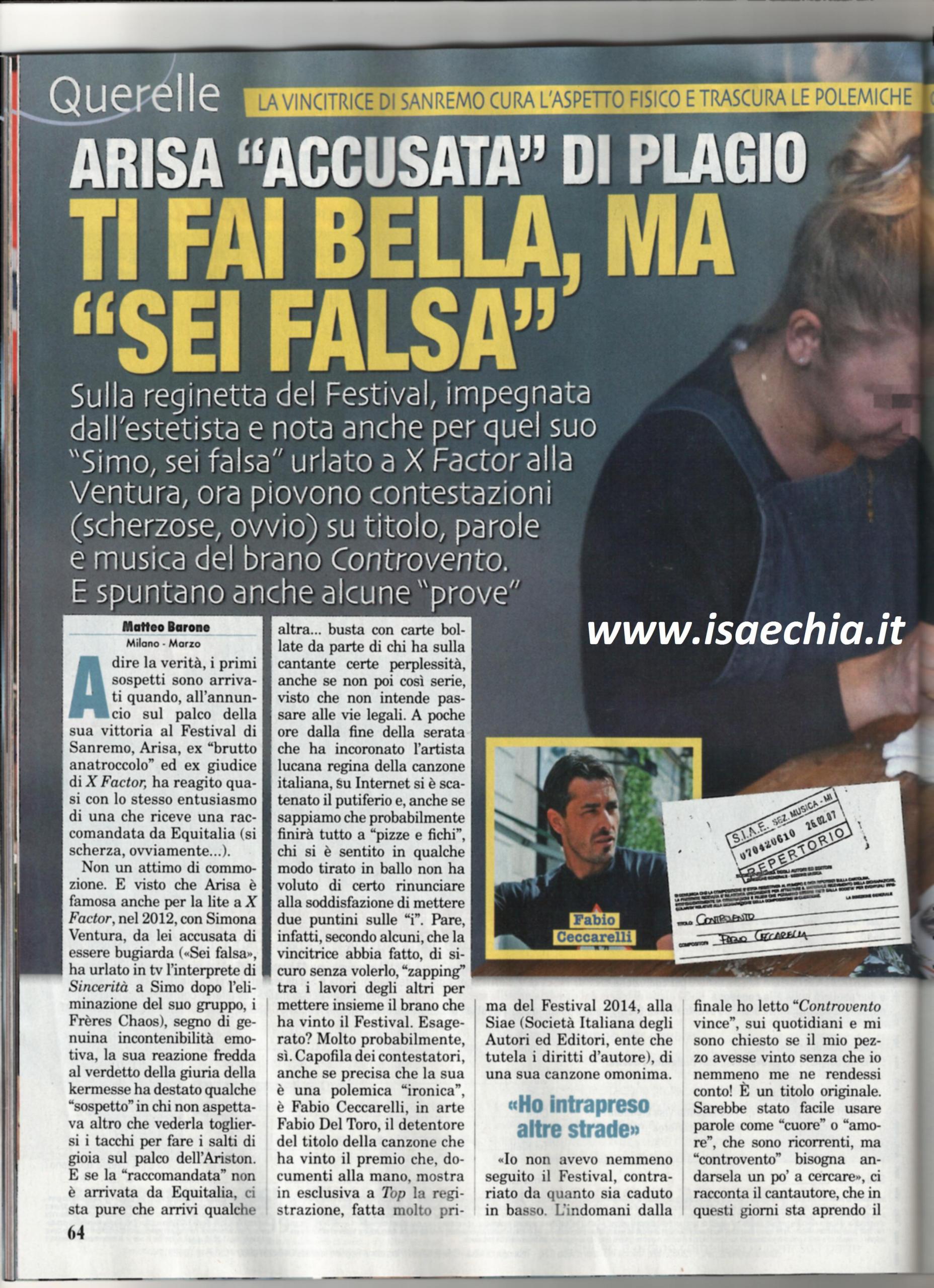 Quando ha sentito annunciare il suo nome come vincitrice del festival di Sanremo, Arisa ha reagito con lo stesso entusiasmo con cui si riceve una bolletta. Alcuni hanno visto in questa reazione una prima, strana avvisaglia. La stessa Arisa che ad X Factor aveva accusato Simona Ventura di essere “falsa”, mostrando così un’incontenibilità emotiva, ha destato qualche sospetto con la sua impassibilità. A poche ore dalla vittoria della cantante lucana, ecco che su internet si è scatenato il putiferio: pare, infatti, che la cantante abbia fatto “zapping” tra le canzoni degli altri per comporre Controvento, il pezzo vincitore a Sanremo. Capofila dei contestatori è Fabio Del Toro, che mostra in esclusiva la registrazione di un pezzo intitolato Controvento alla Siae molto precedente al 2014. “Non ho seguito il festival, ma sono contrariato da quanto sia caduto in basso. L’indomani ho letto “Controvento vince” e mi sono chiesto se il mio pezzo avesse vinto senza che io lo sapessi! E’ un titolo originale: “Controvento” bisogna andare a cercarselo! Non intendo muovermi a tutela del brano. Ho intrapreso anche altre strade professionali e, da un lato, questa vittoria la vedo anche un po’ mia”. Ma non finisce qua: la cantante Micol Barsanti ha scritto “Abbiamo contro-vinto”: le note iniziali della canzone di Arisa sono molto simili al suo brano Entra nel cuore, pubblicato nel 2007 e il video col confronto tra i due pezzi ha fatto il giro del web.