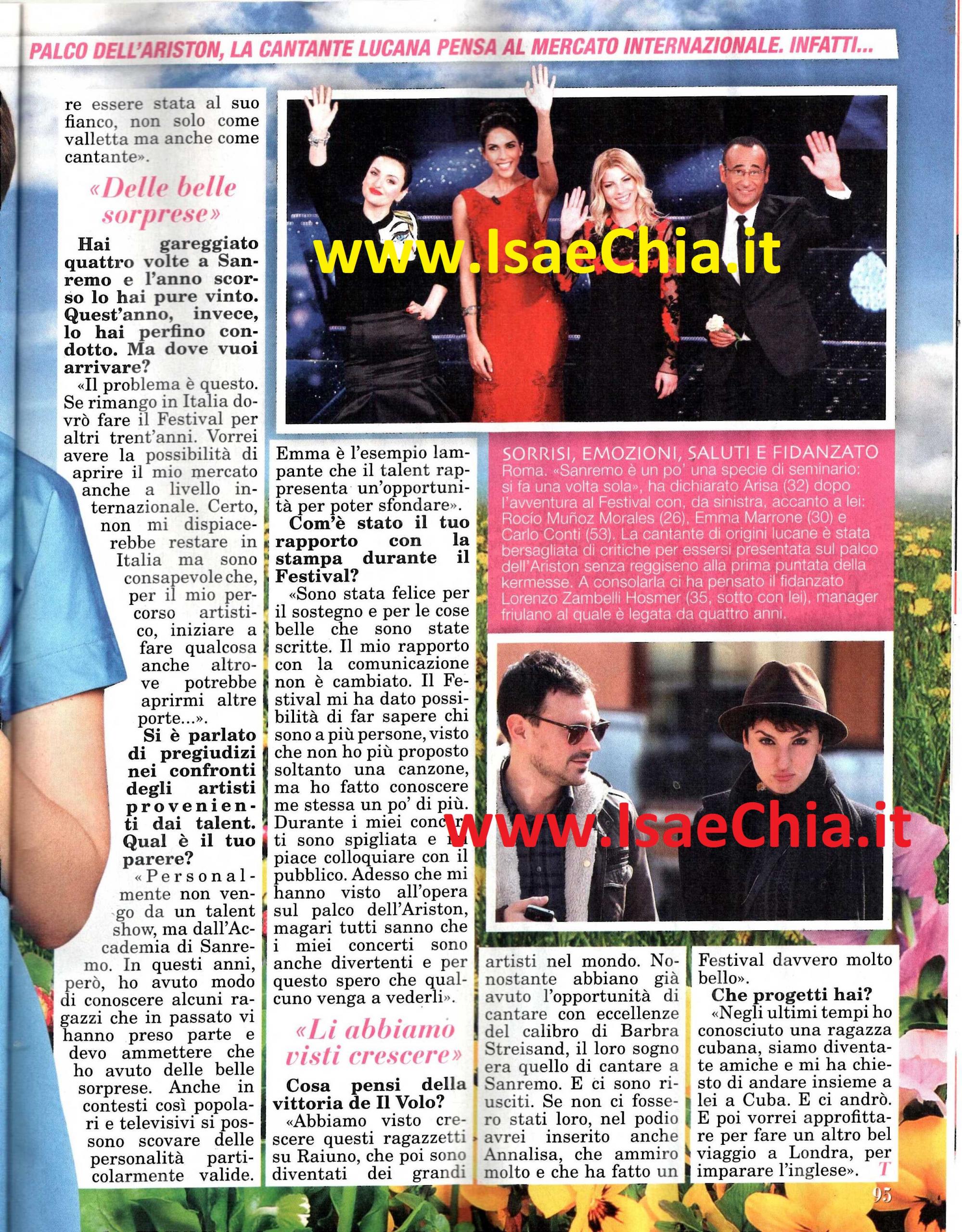Ha esordito al Festival di Sanremo, per poi tornare sul palco dell’Ariston, ma nelle vesti di valletta. Adesso, Arisa traccia un bilancio di questo grande ritorno a Sanremo nel ruolo di co-conduttrice: “In realtà non mi sono vista e non so come sono stata. Ho cercato di dare il meglio, anche perché si trattava di un ruolo nuovo per me. Alla fine credo di essere riuscita a trovare un equilibrio, vivendo il tutto come se fossi a un mio concerto o ad una festa tra amici. Credo di essere stata, come sempre, un po’ fuori di testa! Durante la seconda serata sono apparsa spenta: avevo ‘le mie cose’. In quei giorni noi donne siamo un po’ suscettibili, abbiamo sbalzi d’umore che inevitabilmente possono emergere anche sul palcoscenico. E così è stato“. Quando le si chiede come è stato lavorare con Carlo Conti, l’ex giudice di X Factor risponde: “Carlo è stato molto attento alla parte musicale, è una persona che stimo moltissimo perché è stato sempre in grado di trasmettere tranquillità. E’ stato un onore lavorare con lui, non solo come valletta, ma anche al suo fianco. Sono stata felice delle cose che sono state scritte su di me. Il mio rapporto con la comunicazione non è cambiato. Il Festival mi ha dato la possibilità di far sapere chi sono a più persone, visto che non ho solo proposto una canzone, ma ho fatto conoscere me stessa un po’ di più. Durante i miei concerti sono spigliata, colloquio col pubblico e adesso che mi hanno visto anche sull’Ariston, tutti sanno che magari i miei concerti sono anche divertenti“. Quanto ai concorrenti provenienti dai talent e ai vincitori, il trio Il Volo, Arisa commenta: “Personalmente non vengo da un talent, ma in questi anni ho conosciuto dei ragazzi che vi hanno preso parte ed ho avuto delle belle sorprese. Anche in contesti così popolari e televisivi si possono scovare delle personalità particolarmente valide: Emma Marrone è l’esempio lampante del fatto che un talent sia un’opportunità per poter sfondare. Abbiamo visto crescere Il Volo a Raiuno, poi sono diventati noti in tutto il mondo e nonostante abbiano cantato con celebrità come Barbra Streisand, il loro sogno era cantare a Sanremo e ci sono riusciti. Se avessi potuto scegliere io il podio, avrei inserito anche Annalisa, che ammiro molto e che ha fatto un Festival molto bello”. Quando le si fa notare che ha partecipato già quattro volte a Sanremo e ora ha anche fatto da valletta e le si chiede ironicamente dove vuole arrivare, risponde: “Il problema è questo: se rimango in Italia dovrò fare il Festival per altri trent’anni, vorrei avere la possibilità di aprire il mio mercato anche sul piano internazionale. Certo, non mi dispiacerebbe rimanere in Italia, ma sono consapevole del fatto che, per il mio percorso artistico, iniziare a fare qualcosa altrove mi aprirebbe altre porte. Negli ultimi tempi sono diventata amica di una ragazza cubana che mi ha chiesto di andare con lei a Cuba e ci andrò. Vorrei approfittarne per fare un altro viaggio a Londra, per imparare l’inglese“.