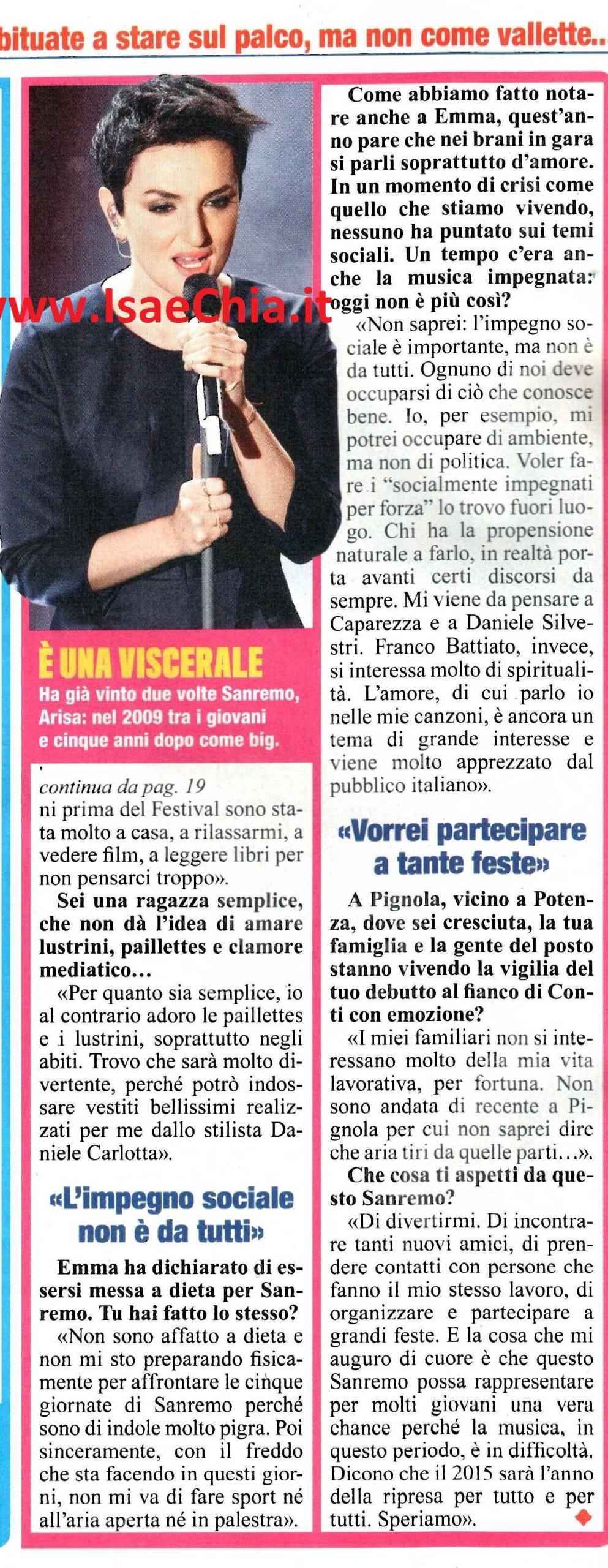 Ne è passato di tempo da quando Arisa esordì a Sanremo con un aspetto infantile e da ragazzina goffa cantando Sincerità. Adesso, l’ex giudice di X Factor sarà sull’Ariston al fianco di Carlo Conti, con un nuovo stile sofisticato e una femminilità ritrovata, che non le fa temere nemmeno il confronto con la “bellona”, l’attrice spagnola Rocío Muñoz Morales: “Non la temo. Anzi, a dirla tutta, all’inizio temevo il confronto con Emma Marrone perché lei è un’artista bravissima e ha un grande riscontro dal pubblico, così, considerando che l’Italia è un Paese che tende alla tifoseria, quando Carlo Conti mi ha detto che la mia collega sarebbe stata Emma, ho avuto paura! Io non la conoscevo se non per quello che avevo visto in tv. Quando ci siamo incontrate e confrontate, ho scoperto una ragazza alla mano, una tipa del Sud, leale e tutta d’un pezzo“. Lo stilista di Arisa sarà lo stesso di Belén Rodriguez. Interpellata, la showgirl argentina (sposata con l’ex di Emma, Stefano De Martino) ha commentato però che Emma e Arisa hanno già molta esperienza e l’unica cosa che potrebbe insegnare loro è stare sui tacchi. La cantante lucana ha commentato così: “Belén per me è bella, simpatica, intelligente e mi sembra anche generosa. Credo che quello che ha detto a me e Emma suoni solo come un bel complimento“. Quando le si chiede come si sente in questo ruolo di co-conduttrice, Rosalba Pippa (questo è il suo vero nome), precisa: “Sono una valletta! Questo ruolo di “affiancatrice” non lo trovo affatto sminuente, anzi! Per quanto sia semplice, adoro lustrini e paillettes, trovo tutto divertente, perché potrò indossare gli splendidi vestiti realizzati da Daniele Carlotta! Non sono affatto a dieta e non mi sto preparando fisicamente perché per indole sono molto pigra. Poi, sinceramente, con questo freddo, non mi va di fare sport né all’aria aperta né in palestra! Mi aspetto di divertirmi, di conoscere nuove persone che fanno il mio lavoro…E mi auguro che sia una vera occasione per i giovani, perché la musica è in crisi. Dicono che il 2015 sarà l’anno della ripresa. Speriamo!“. Le canzoni di quest’anno, tuttavia, parlano quasi tutte d’amore e poco di temi sociali: “L’impegno sociale è importante, ma non da tutti: ognuno deve occuparsi di ciò che conosce bene e voler fare i “socialmente impegnati” per forza lo trovo fuori luogo. L’amore, di cui parlo io nelle mie canzoni, è ancora un tema di grande interesse per il pubblico italiano” conclude lei.