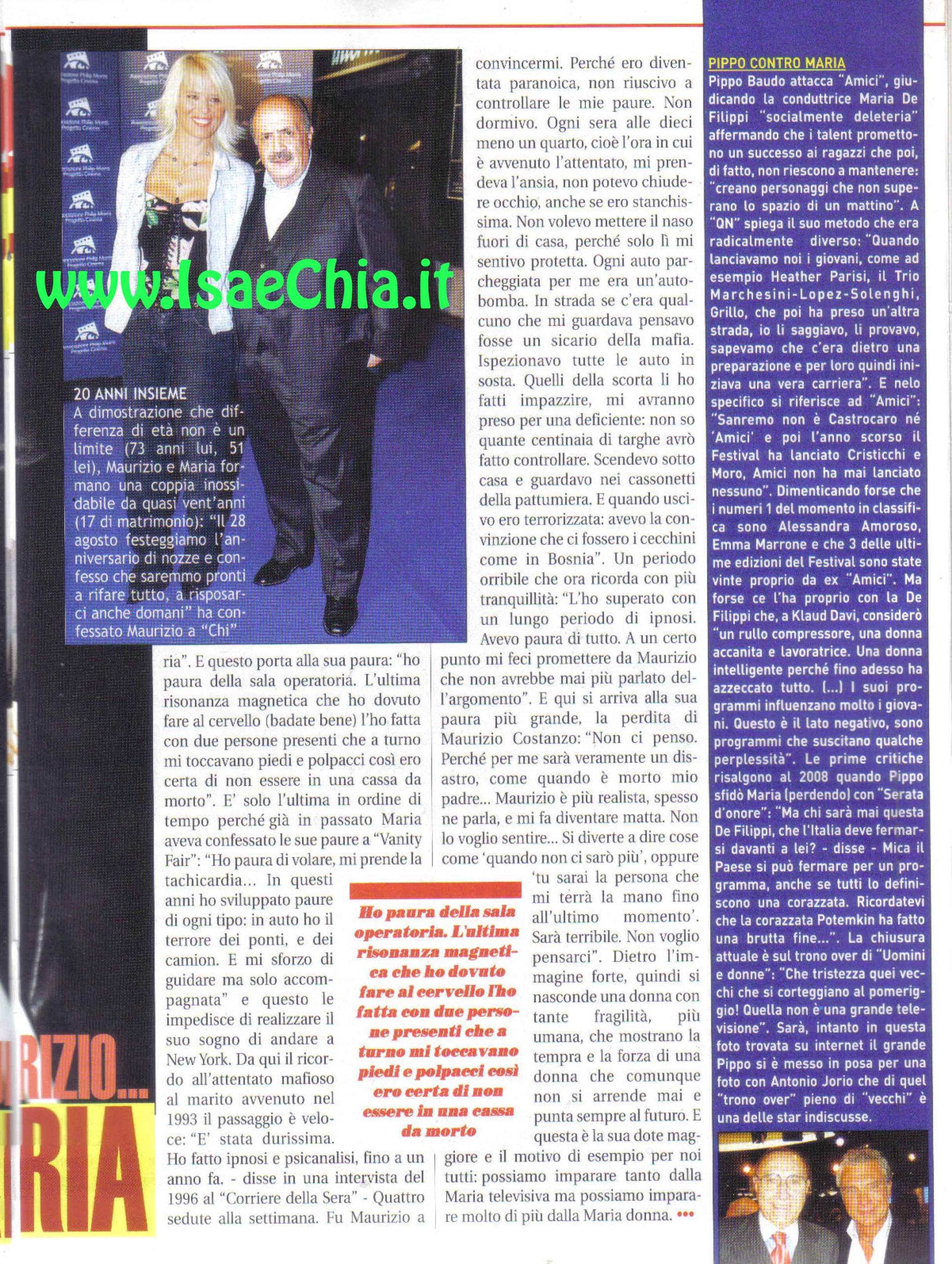 Ciò che traspare dalla conduttrice Maria De Filippi è sicuramente una gran sicurezza. In realtà, anche lei ha le sue paure. La storia del calazio all’occhio, infatti, le ha riportate fuori: dopo aver spiegato che poteva sembrare “tirata” a causa del trucco per coprire l’accumulo di colesterolo, Maria ha dichiarato di aver paura di operarsi: “L’ultima risonanza magnetica che ho dovuto fare al cervello (badate bene) l’ho fatta con due persone presenti che mi toccavano piedi e polpacci, così che io potessi essere certa di non essere in una cassa da morto!”. Inoltre, recentemente aveva dichiarato: “Ho paura di volare e in auto ho paura dei ponti: mi sforzo di guidare solo se accompagnata. L’attentato a mio marito è stato durissimo: ho fatto ipnosi e psicoanalisi fino ad un anno fa. Ero diventata paranoica ed ogni sera alla stessa ora mi veniva l’ansia e non uscivo di casa. Ogni auto era una bomba, chiunque mi fissava era un cecchino”. Questo trauma le è stato causato dalla paura di poter perdere Maurizio Costanzo: “Per me sarà un disastro. Lui è realista e dice “Quando non ci sarò più” e mi fa diventare matta”.