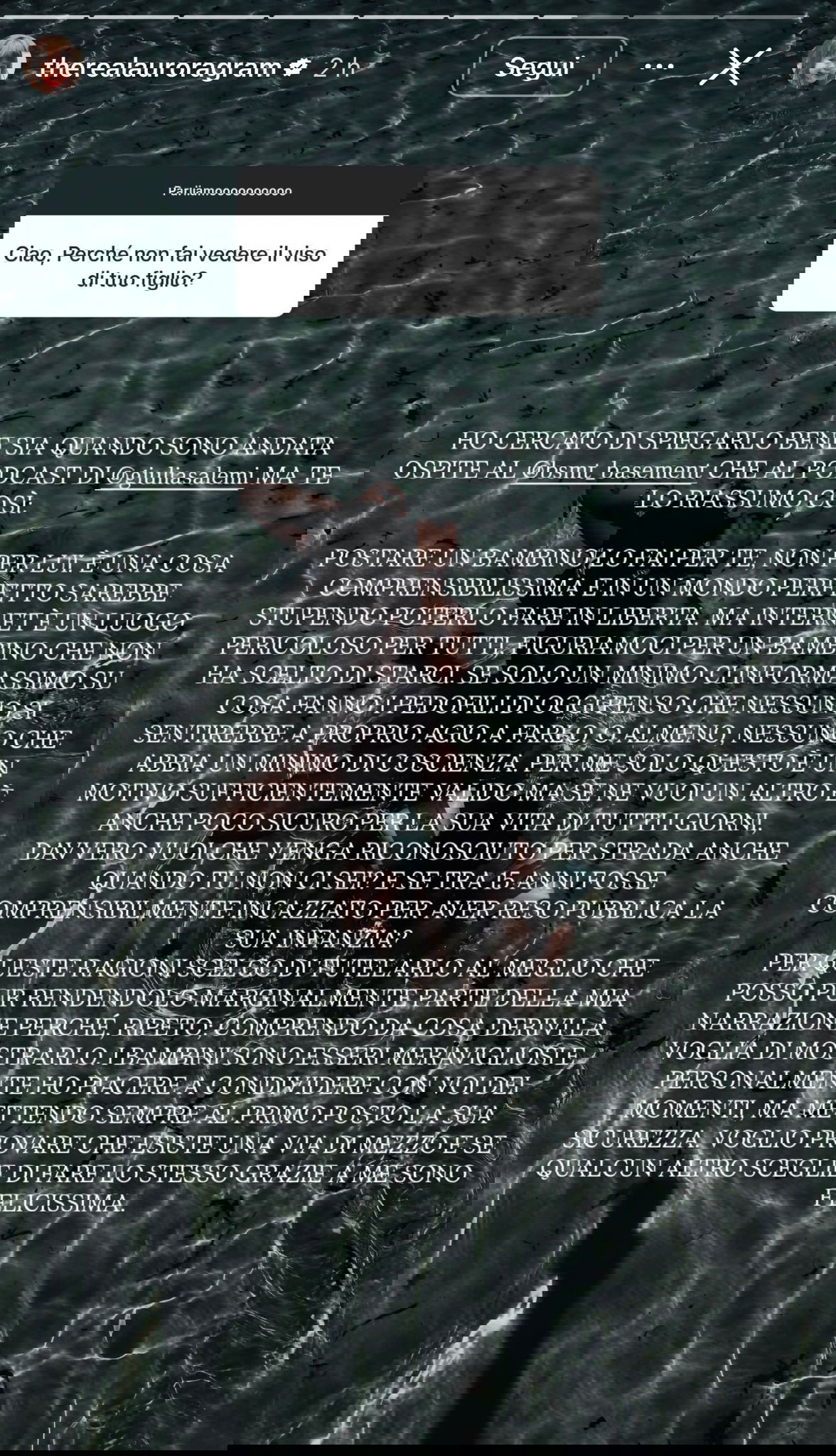 Ho cercato di spiegarlo bene sia quando sono andata ospite al Bmst Basement che al podcast di Giulia Salemi ma te lo riassumo così: postare un bambino lo fai per te, non per lui. È una cosa comprensibilissima e in un mondo perfetto sarebbe stupendo poterlo fare in libertà. Ma internet è un luogo pericoloso per tutti, figuriamoci per un bambino che non ha scelto di starci. Se solo un minimo ci informassimo su cosa fanno i pedofili di oggi penso che nessuno si sentirebbe a proprio agio a farlo, o almeno, nessuno che abbia un minimo di coscienza. Per me solo questo è un motivo sufficientemente valido. Ma se ne vuoi un altro è anche poco sicuro per la sua vita di tutti i giorni, davvero vuoi che venga riconosciuto per strada anche quando tu non ci sei? E se tra 15 anni fosse comprensibilmente incazzato per aver reso pubblica la sua infanzia?