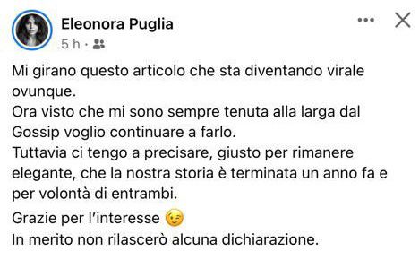 Poche ore fa però, Eleonora Puglia attraverso il suo profilo Facebook ha voluto mettere in chiaro alcune cose. La giovane attrice e ballerina ha confermato la rottura, che risalirebbe a un anno fa, ma non è stata affatto lasciata dall’ex volto di Ballando con le Stelle: