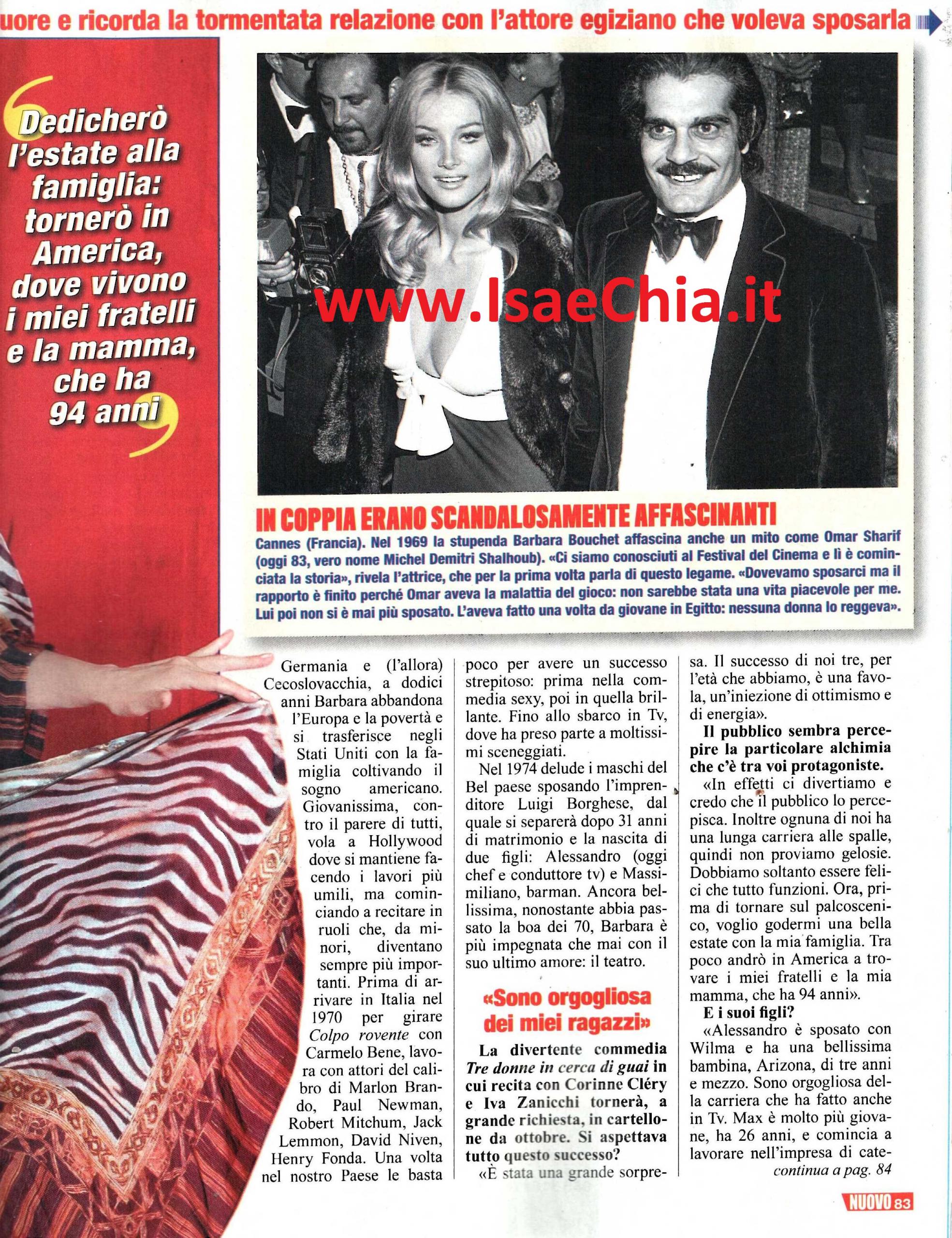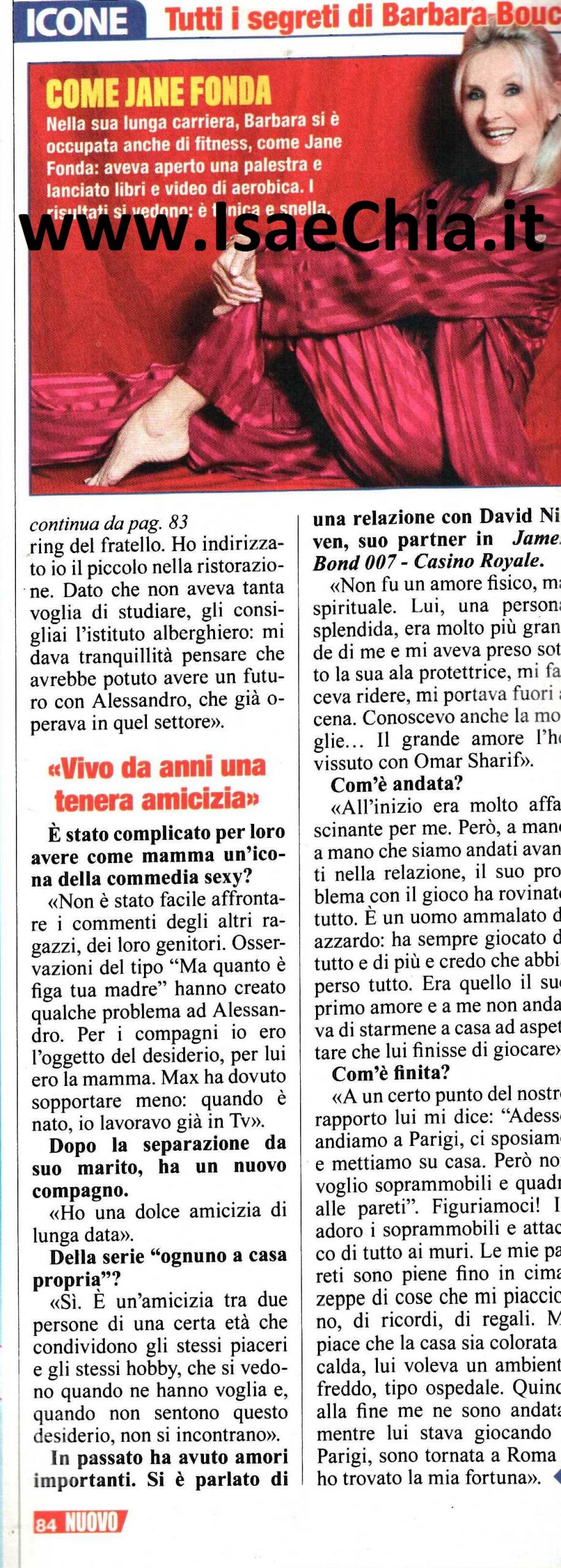 La diva della commedia sexy anni Settanta Barbara Bouchet è rimasta sempre nell’immaginario collettivo del pubblico italiano per film come La moglie in vacanza…L’amante in città o Anatra all’arancia, in cui si mostrava senza veli: “Non ho mai pensato troppo a questo aspetto. Per me era un lavoro, che mi piaceva e mi divertiva. Essendo tedesca e venendo da una famiglia di sei figli, per me il nudismo non era un tabù. Un’attrice interpreta la mamma, la drogata, la prostituta, ma sono tutti ruoli. Io ho svolto un ruolo con l’aiuto della mia faccia e della mia fisicità”. Adesso, invece, sta avendo un grande successo a teatro, con Tre donne in cerca di guai, in cui recita con Corinne Cléry e Iva Zanicchi: “Il successo ci porterà a tornare ad ottobre e questa è stata una grande sorpresa per me. Per noi tre e per l’età che abbiamo, è una favola, un’iniezione di ottimismo ed energia. Ci divertiamo e penso che il pubblico lo capisca. Inoltre ognuna di noi ha una grande carriera alle spalle, quindi non proviamo gelosie. Ora, prima di tornare sul palcoscenico, voglio godermi la mia famiglia e andrò in America da mia madre, che ha 94 anni. Mio figlio Alessandro (Borghese, chef e protagonista di vari programmi televisivi sulla cucina) è sposato con Wilma e ha una bellissima bambina, Arizona, che ha 3 anni. Sono orgogliosa della carriera che ha fatto in tv. Max ha 26 anni e comincia a lavorare nell’impresa di catering del fratello. Visto che non aveva voglia di studiare, l’ho indirizzato verso l’alberghiero, così poteva avere un futuro con Alessandro, che già opera nel settore. Non è stato facile affrontare i commenti degli altri ragazzi e dei loro genitori sui miei film sexy: per i compagni io ero l’oggetto del desiderio, per Alessandro ero la mamma. Max ha dovuto sopportare meno: quando è nato lui, io lavoravo già in tv“. E adesso che si è separata dopo oltre trent’anni dal marito, la Bouchet ha un nuovo amore, o meglio…”Una dolce amicizia di lunga durata. Un’amicizia tra due persone che condividono gli stessi hobby, gli stessi piaceri e che si vedono quando ne hanno voglia“. Ma le sue storie più chiacchierate appartengono al passato…: “Con David Niven, mio partner in James Bond 007 – Casino Royale, non fu un amore fisico, ma spirituale: lui mi aveva preso sotto l’ala protettrice, mi faceva ridere, mi portava fuori a cena. Il grande amore l’ho vissuto con Omar Sharif: all’inizio era molto affascinante per me, poi il suo amore per il gioco ha rovinato tutto. Era quello il suo primo amore e a me non andava di starmene a casa ad aspettare che finisse di giocare. Ad un certo punto mi disse: ‘Andiamo a Parigi, ci sposiamo e mettiamo su casa. Ma non voglio soprammobili e quadri’. Figuriamoci! Io adoro i soprammobili e ho le pareti zeppe. Mi piace la casa colorata, calda, lui voleva un ambiente freddo, tipo ospedale. Quindi me ne sono andata mentre lui stava giocando a Parigi e ho fatto la fortuna a Roma!“.