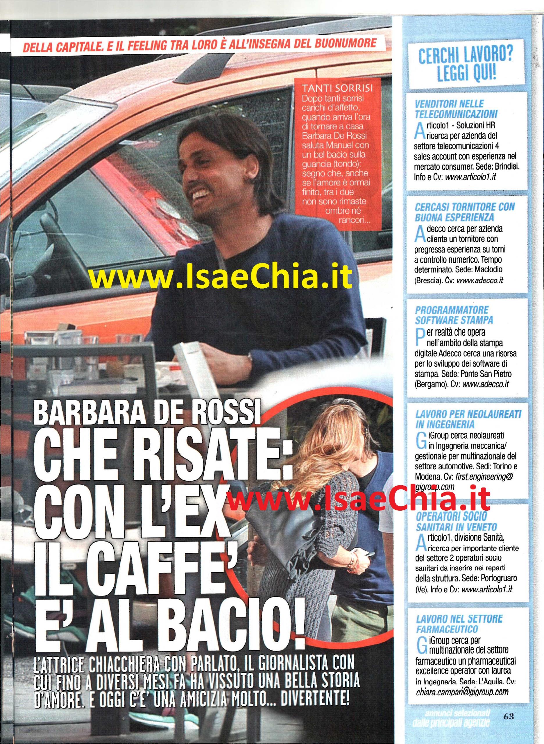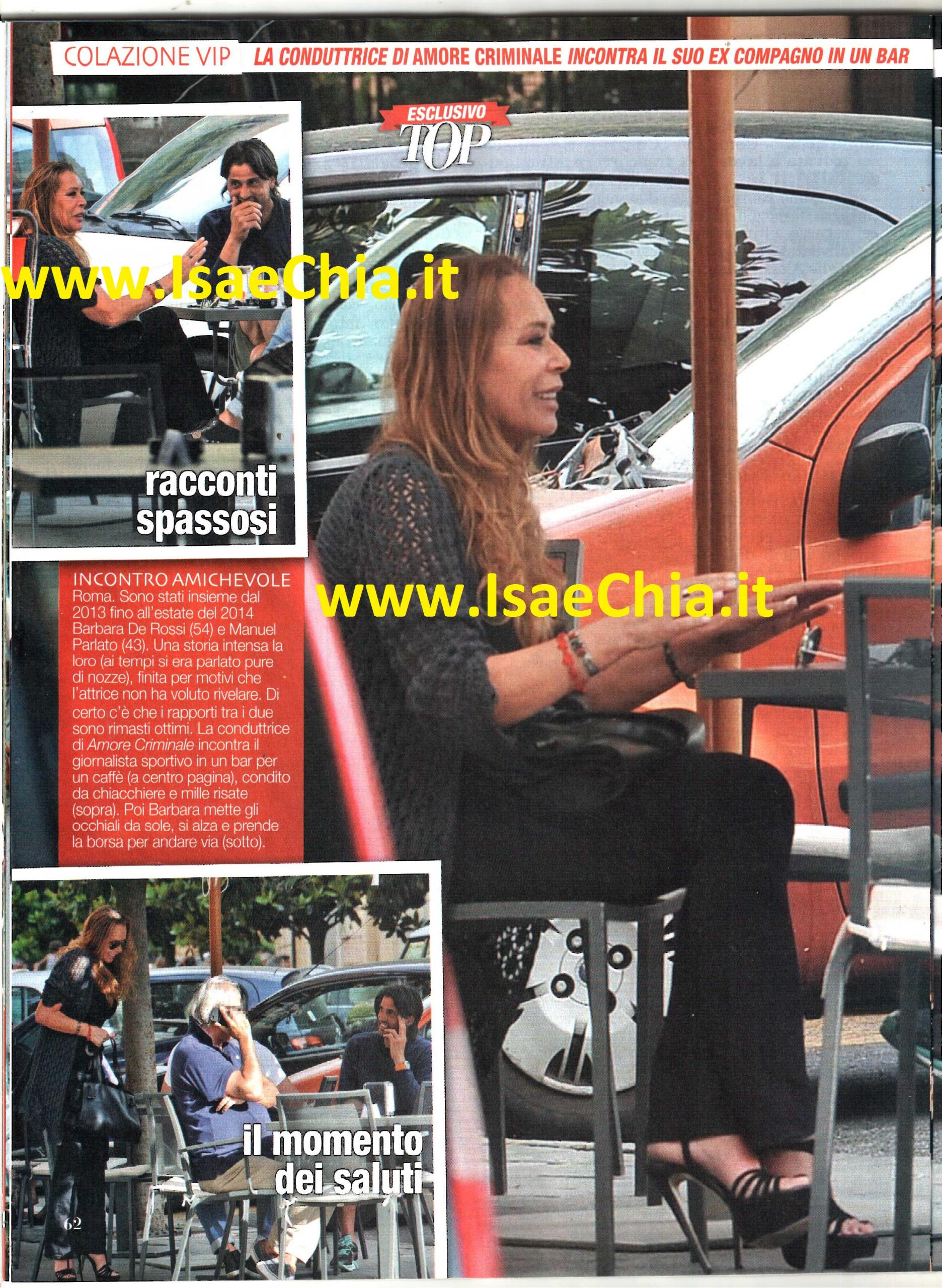 Nelle sue interviste più recenti, risalenti ai mesi scorsi, in cui ha partecipato al programma di Milly Carlucci Notti sul ghiaccio, l’attrice Barbara De Rossi si è dichiarata di nuovo single. La storia con Manuel Parlato, il giornalista di circa 11 anni più giovane, è finita durante la scorsa estate e questo nonostante si fosse arrivato a parlare persino di matrimonio tra loro. I motivi, l’attrice non ha mai voluto rivelarli. Adesso, però, arrivano delle immagini che stupiscono: ecco i due, di nuovo insieme, in un bar di Roma. A quanto pare, i rapporti tra di loro sono rimasti ottimi. I due prendono un caffè insieme e si fanno tante risate, come se tra di loro nulla fosse mai cambiato. Poi, quando arriva l’ora di andare, Barbara si alza e schiocca un bel bacio al suo ex. Poi mette gli occhiali da sole e scappa. Che sia previsto un prossimo incontro? O addirittura un ritorno di fiamma?