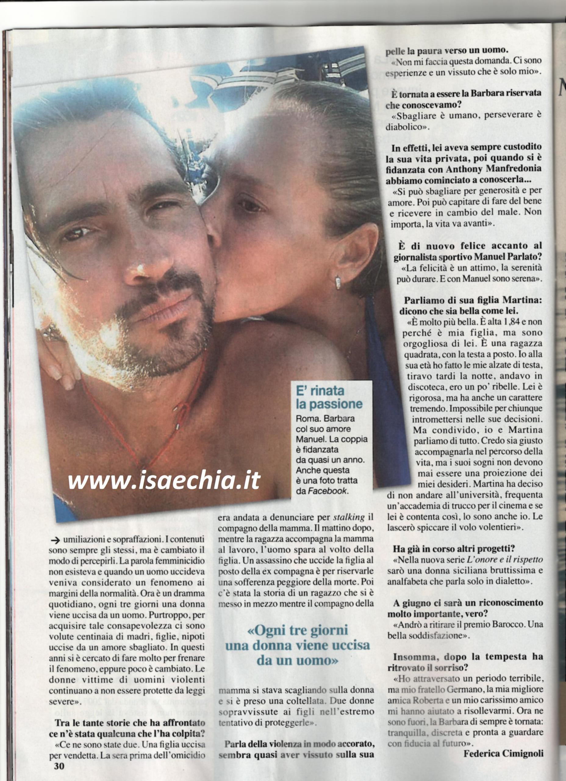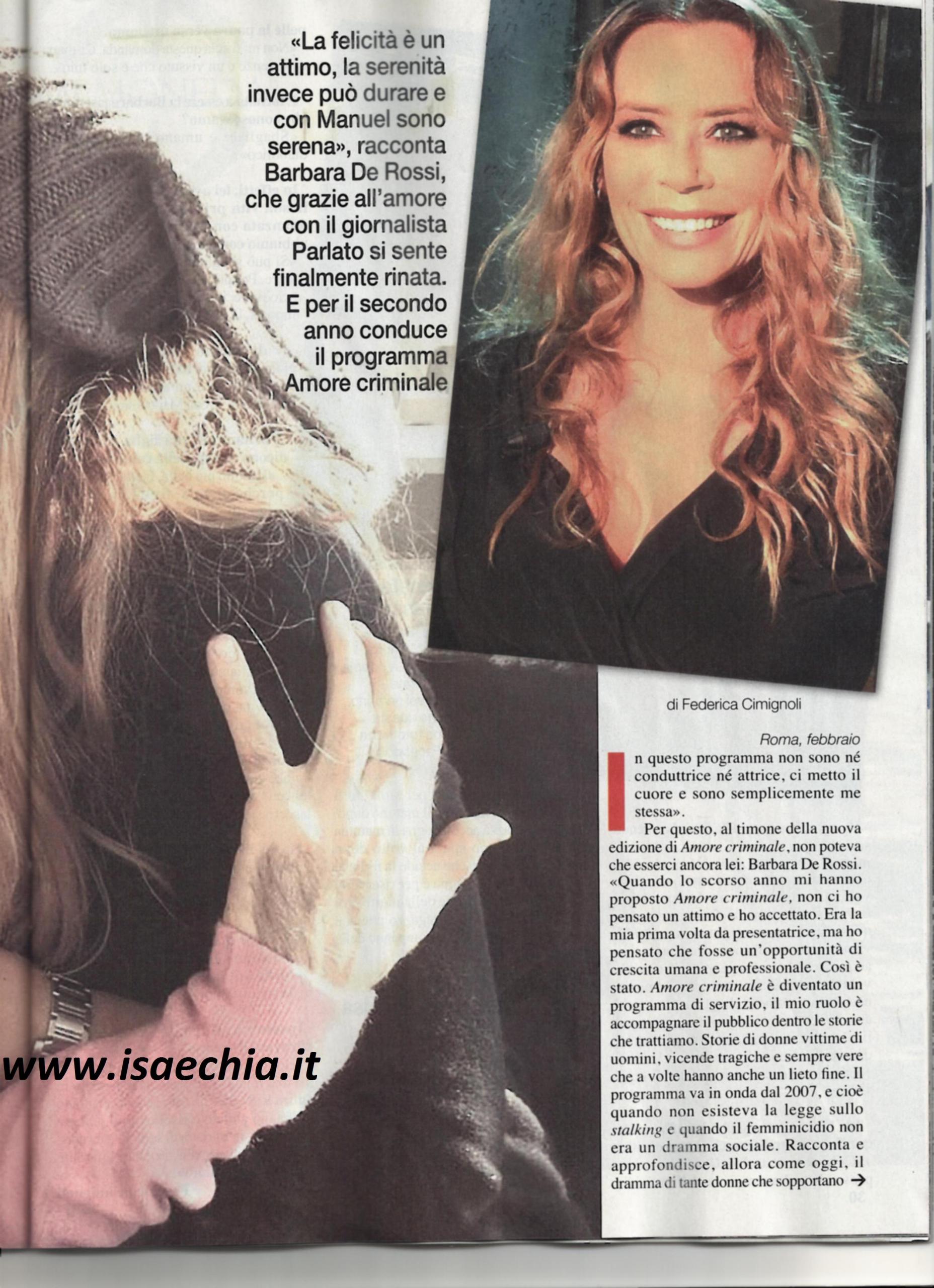 Barbara De Rossi è alla guida del programma Amore criminale: “Io non sono né conduttrice né attrice. Ci metto il cuore e sono semplicemente me stessa. Quando me l’hanno proposto, non ci ho pensato un attimo. Era la mia prima volta da conduttrice, ma ho pensato che fosse un’occasione di crescita professionale e così è stato. E’ stato un programma di servizio, accompagno il pubblico nelle storie che trattiamo: storie di donne vittime di uomini. Il programma esiste dal 2007, quando non esisteva la legge sullo stalking e il femminicidio non era ancora un dramma sociale. I contenuti sono sempre gli stessi, ma è cambiato il modo di percepirli. Oggi il femminicidio è un fdramma quotidiano: ogni tre giorni una donna viene uccisa da un uomo. Si è cercato di fare qualcosa contro il fenomeno, però poco è cambiato. Le donne vittime di uomini violenti continuano a non essere protette da leggi severe. Due sono le storie che mi hanno colpito: una figlia era andata a denunciare per stalking il compagno della mamma e il giorno dopo viene uccisa da lui con un colpo in viso. Ha riservato alla compagna una sofferenza peggiore della morte. Poi c’è la storia di un ragazzo che si è messo in mezzo mentre il compagno della mamma si stava scagliando contro la donna e si è preso una coltellata”. Quando le si chiede se ha avuto esperienze simili, dice: “Non mi faccia questa domanda: ci sono esperienze e un vissuto che è solo mio”. Lei, infatti, si è fatta conoscere solo grazie alla sua storia con Anthony Manfredonia, di cui dice: “Si può sbagliare per generosità e amore. Può capitare di fare del bene e ricevere del male. Con Manuel Parlato sono serena”. Poi, parlando di sua figlia, racconta: “E’ molto più bella di me. E’ alta 1,84 m, è una ragazza quadrata, con la testa a posto, mentre io ero più ribelle. Frequenta un’accademia di trucco per il cinema e se lei è felice così, lo sono anch’io”. Infine, i progetti futuri: “In L’onore e il rispetto sarò una donna siciliana bruttissima e analfabeta. A giugno andrò a ritirare il premio Barocco: una bella soddisfazione”.