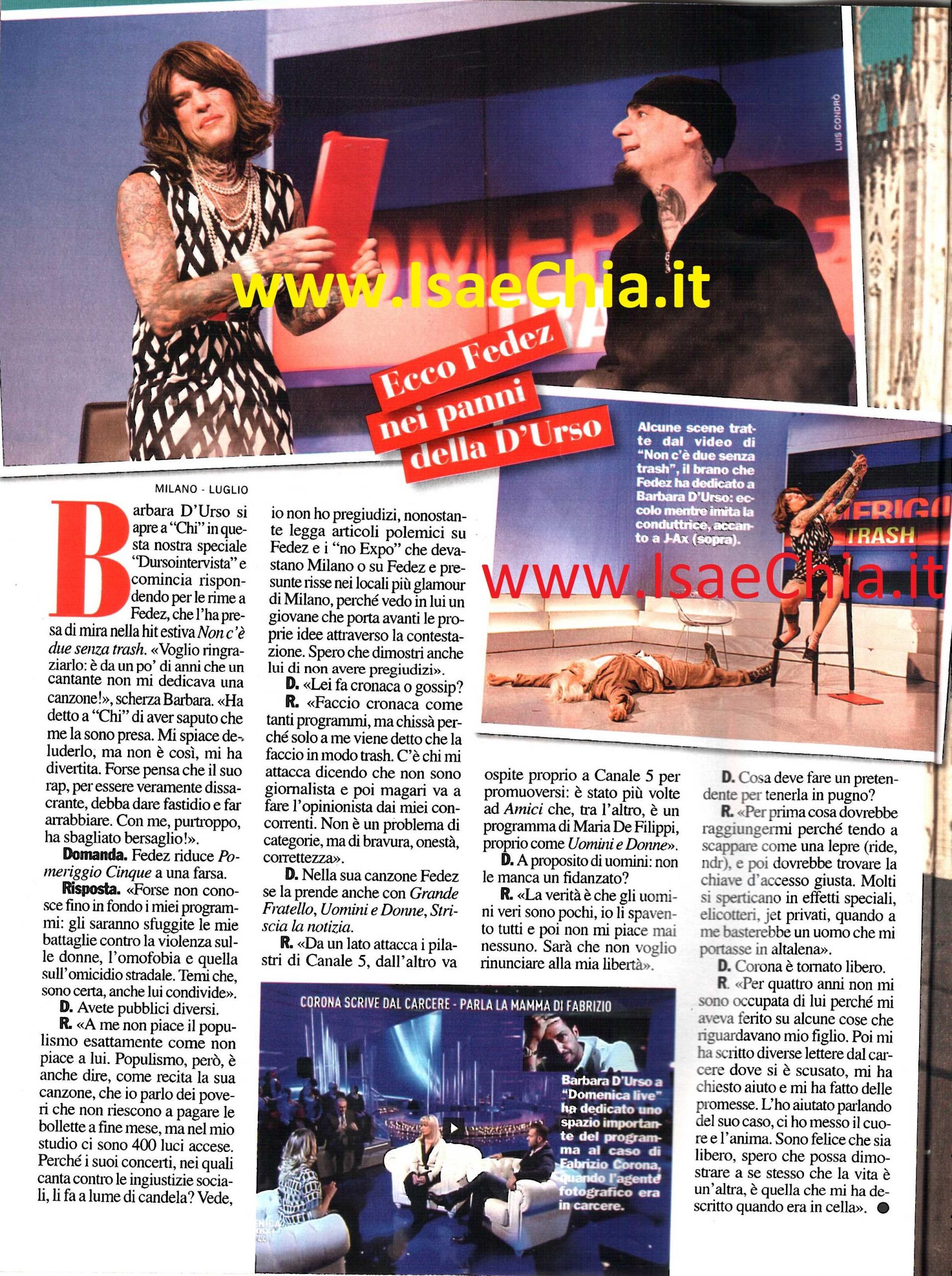 Ha fatto molto discutere il video per l’ultimo singolo di Fedez, Non c’è due senza Trash, in cui il rapper ha impersonato la conduttrice Barbara D’Urso, riducendo il suo programma Pomeriggio Cinque ad una farsa e prendendo in giro molti aspetti del tipo di televisione rappresentato dalla conduttrice, che però, come sempre sicura di sé, risponde: “Innanzitutto vorrei ringraziarlo: erano anni che un cantante non mi dedicava una canzone! Ha detto a Chi che ha saputo che io me la sono presa. Mi spiace deluderlo ma non è così. Mi sono divertita. Forse pensa che il suo rap, per essere dissacrante, debba dar fastidio e far arrabbiare, ma con me ha proprio sbagliato! Forse non conosce i miei programmi, non conosce le mie lotte contro la violenza sulle donne, l’omofobia e per l’omicidio stradale. Temi che sono certa lui condivide. A me non piace il populismo esattamente come non piace a lui. Lui dice che io parlo di poveri che non riescono a parlare le bollette e poi nel mio studio ci sono 400 luci accese. Perché i suoi concerti in cui canta le ingiustizie sociali, li fa a lume di candela? Vede, io non ho pregiudizi, nonostante legga articoli polemici su Fedez e i no Expo che devastano Milano o su Fedez e le presunte liti nei locali glamour di Milano, perché vedo in lui un giovane che porta avanti le sue idee con la contestazione. Spero dimostri anche lui di non avere pregiudizi. Faccio cronaca come in tanti altri programmi, ma viene detto solo a me che faccio trash. C’è chi mi attacca dicendo che non sono giornalista e poi va a fare l’opinionista dalla mia concorrenza. Fedez attacca Grande fratello, Uomini e Donne, Striscia la notizia, ma poi è stato più volte a Mediaset a farsi promozione: Amici è un programma di Maria De Filippi, proprio come Uomini e Donne”. Chiuso questo argomento, Barbara non può dire la sua sulla scarcerazione di Fabrizio Corona, più volte argomento del suo salotto pomeridiano e con il quale lei stessa era stata in contrasto in passato: “Per quattro anni non mi sono occupata di lui perché mi aveva ferito per alcune cose che riguardavano mio figlio. Poi mi ha scritto diverse lettere dal carcere, chiedendomi scusa e aiuto e facendomi delle promesse. L’ho aiutato parlando del suo caso, ci ho messo il cuore e l’anima. Sono felice che sia libero e spero possa dimostrare che ora la sua vita è un’altra, quella di cui mi ha scritto nella cella“. Infine, quando le si chiede se le manca un uomo, Barbara risponde: “Gli uomini veri sono pochi. Li spavento e non me ne piace nessuno. Sarà che non voglio rinunciare alla mia libertà. Un pretendente dovrebbe prima raggiungermi, perché scappo come una lepre, poi portarmi la chiave d’accesso giusta. Molti pensano sia un jet privato, invece mi basterebbe un uomo che mi porti su un’altalena”.