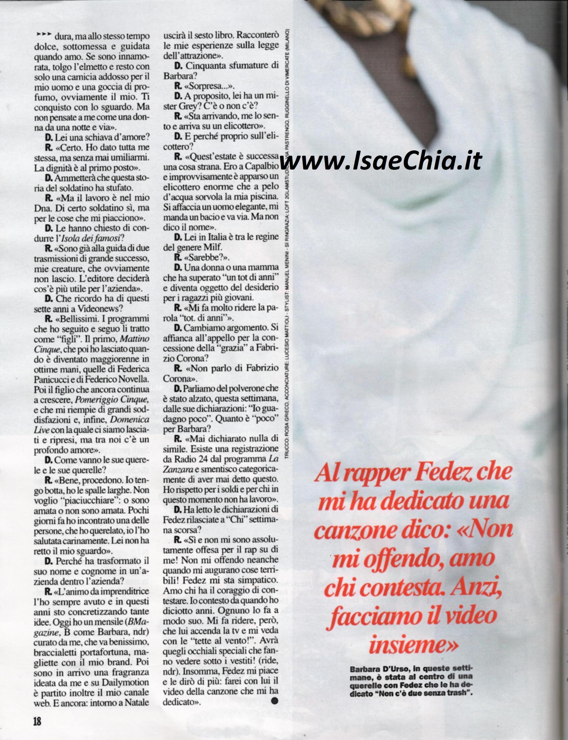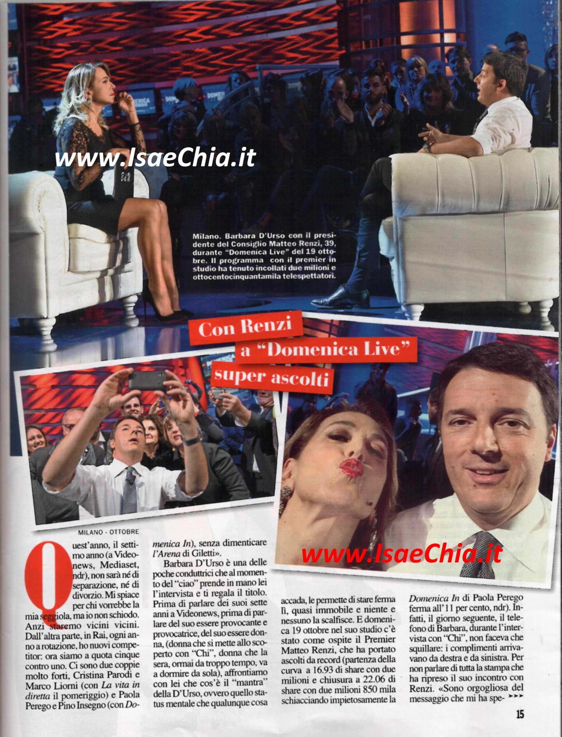 La conduttrice Barbara D’Urso ha avuto l’onore di avere tra i suoi ospiti a Domenica Live anche il Presidente del Consiglio Matteo Renzi. Così, il suo programma ha ottenuto gli ascolti record pari al 22% di share, con oltre 2.850.000 telespettatori, contro l’11% dei diretti rivali, ossia Domenica In: “Quest’anno, che è il settimo a Videonews – Mediaset, non sarà un anno di separazione o divorzio. Mi spiace per chi vorrebbe la mia seggiola, ma io non mi schiodo. Anzi, staremo vicini vicini. D’altra, parte, in Rai, ogni anno a rotazione, cambiano i miei competitors. Ora siamo a quota cinque contro uno: Cristina Parodi e Marco Liorni con La vita in diretta, Paola Perego e Pino Insegno con Domenica in e L’Arena di Massimo Giletti” dice la conduttrice. “Sono orgogliosa del messaggio che mi ha spedito Filippo Sensi, portavoce di Renzi. Matteo mi aveva promesso che sarebbe venuto e lo aspettavo. Abbiamo un rapporto personale, così tre giorni prima della puntata mi aveva chiamato dicendomi: “Vorrei farmi intervistare da te”. Dopo l’intervista non ci siamo nemmeno salutati, perché ero in diretta. Dopo di lui c’era Nino D’Angelo ed è stato lui stesso a annunciarlo. Non abbiamo discusso domande e risposte prima: mi ha detto “Mi fido di te”. Avrei voluto chiedergli dell’incontro con Vladimir Putin, ma non c’era più tempo. Durante le pause pubblicitarie continuava il talk, giocavamo con il pubblico, che ha fatto i selfie con lui e chiedeva degli 80 euro in busta paga e dei diritti civili. Silvio Berlusconi? So che mi stima e che avrà apprezzato questa mia intervista. La prossima ospite? Agnese, la moglie di Renzi”. Poi la bella napoletana parla di sé come donna: “So essere dura, ma so anche essere molto dolce, quando amo. Se sono innamorata, tolgo l’elmetto e resto solo con camicia e profumo. In amore ho dato tutta me stessa, ma senza mai umiliarmi: la dignità al primo posto. Le mie querele procedono bene. Non sono una che vuole ‘piaciucchiare’: o mi si ama, o non mi si ama. Qualche giorno fa ho incontrato una delle persone che ho querelato e l’ho salutata carinamente. Lei non ha retto il mio sguardo”. Sull’amore, sul fatto di essere considerata una Milf e su Fabrizio Corona glissa e non si esprime, ma del rapper Fedez, che la cita in una canzone, dice: “Non mi sono assolutamente offesa per il suo rap su di me. Non mi offendo neanche quando dicono cose terribili! Fedez mi sta simpatico, amo chi ha il coraggio di contestare. Io contesto da quando avevo 18 anni. Mi fa ridere che lui accenda la tv e mi trovi “con le tette al vento”. Avrà quegli occhiali speciali che fanno vedere sotto i vestiti! Insomma, mi piace e le dirò di più: farei con lui il video della canzone che mi ha dedicato”.