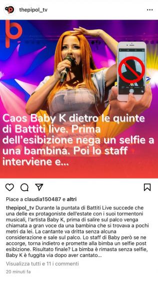 Durante la puntata di Battiti Live succede che una delle ex protagoniste dell’estate con i suoi tormentoni musicali, l’artista Baby K, prima di salire sul palco venga chiamata a gran voce da una bambina che si trovava a pochi metri da lei. La cantante va dritta senza alcuna considerazione e sale sul palco. Lo staff di Baby K però se ne accorge, torna indietro e promette alla bimba un selfie post esibizione. Risultato finale? La bimba è rimasta senza selfie, Baby K è fuggita via dopo aver cantato…