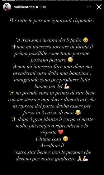 Per tutte le persone ignoranti rispondo: Non sono incinta del quinto figlio. Non mi interessa tornare in forma il prima possibile come tante persone possono pensare. Non mi interessa fare una dieta ma prendermi cura della mia bambina. Mangiando sano per produrre latte buono per lei. Mi prendo cura in primis di star bene con me stessa e non dover dimostrare che la ripresa dal parto debba essere per forza in tre c***o di mesi. Dopo quattro gravidanze il corpo ci mette molto più tempo a riprendersi e lo rispetto. Ultima cosa, ascoltate il vostro star bene e non le persone che devono per forza giudicare.