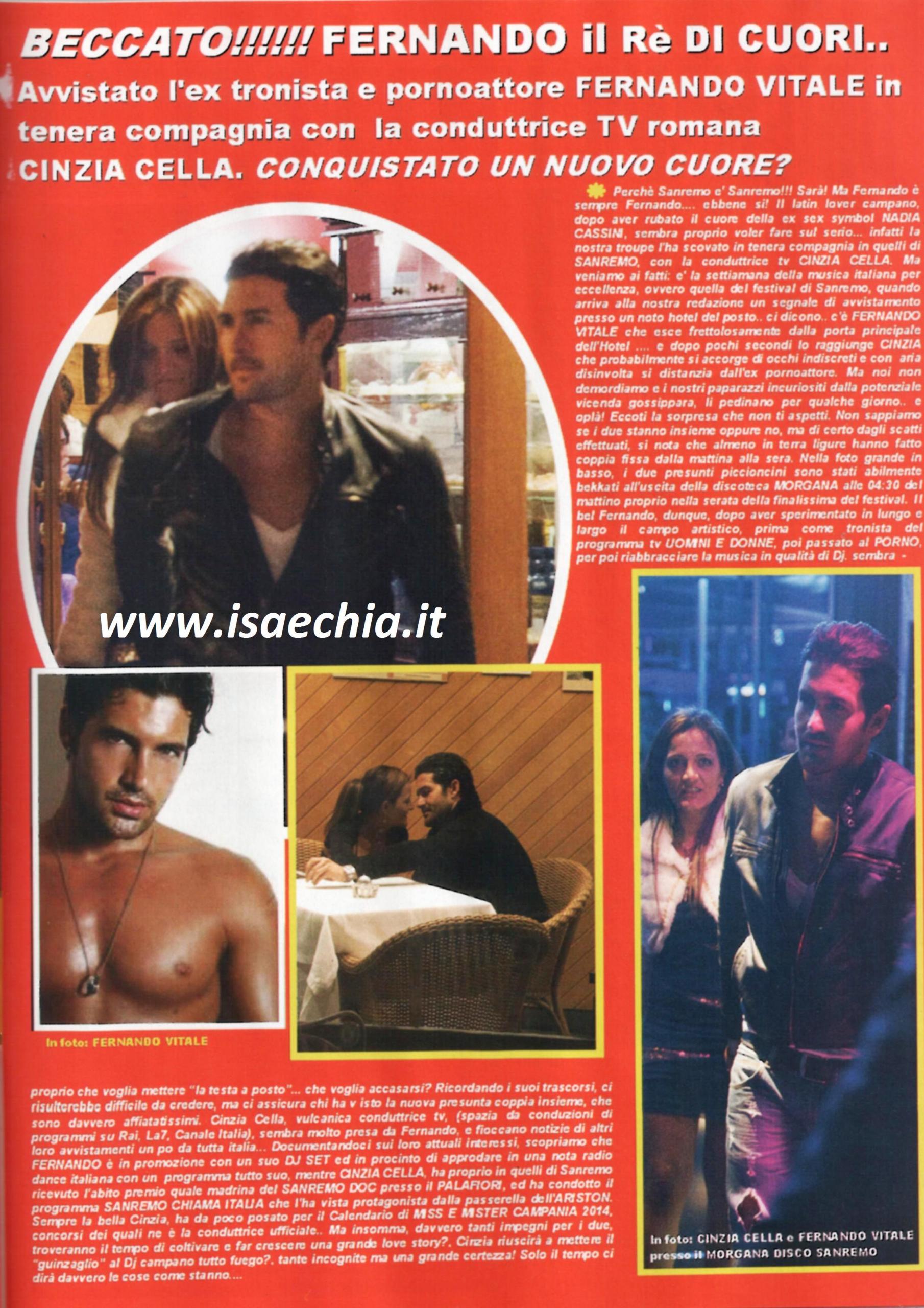 Dopo aver rubato il cuore all’ex showgirl molto più grande di lui Nadia Cassini, l’ex tronista Fernando Vitale è stato beccato a Sanremo con la conduttrice Cinzia Cella, inviata in occasione del Festival. L’ex pornoattore esce frettolosamente dall’albergo ed è seguito dalla nuova fiamma, che, accorgendosi degli occhi indiscreti, si allontana da lui. I due vengono poi beccati insieme all’uscita della discoteca Morgana, alle 4.30 del mattino. Al momento Fernando è attivo in tutta Italia per la promozione del suo DJ set ed è in procinto di debuttare in una radio italiana con un programma dance tutto suo; Cinzia, invece, ha recentemente posato per il calendario Miss e Mister Campania 2014, concorso di cui è conduttrice. Chissà, riuscirà a far mettere la testa a posto al playboy napoletano?