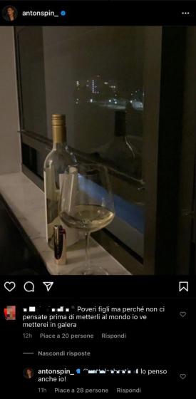 Stavolta è stato l’hair stylist a mostrare la sua insofferenza su Instagram, rendendosi bersaglio dei suoi follower che non hanno affatto apprezzato. Antonino infatti, ha condiviso un tenero scatto in cui stringe la mano della loro bambina, accompagnato dalla didascalia: “Provate a dividerci”. E ancora, in uno scatto successivo, Spinalbese inquadra un calice di vino posto al fianco di una bottiglia, come a voler intendere di aver passato un sabato sera in solitaria. Una utente, a quel punto, ha tuonato commentando sotto: “Poveri figli, ma perché non ci pensate prima di metterli al mondo?”.