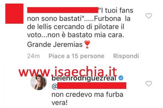 Dopo la vittoria al televoto da parte di Jeremias, la Rodriguez nel rispondere ad un utente su Instagram, si è lasciata andare ad un commento contro Giulia De Lellis. L’ex corteggiatrice in merito al televoto tra il Rodriguez e la Angeloni supportando quest’ultima, aveva dichiarato: “Le mie ragazze (le sue fans, ndr) sanno già cosa devono dare” e con il 27enne rientrato in casa di tutta risposta, le ha detto: “I tuoi fans non sono bastati“…