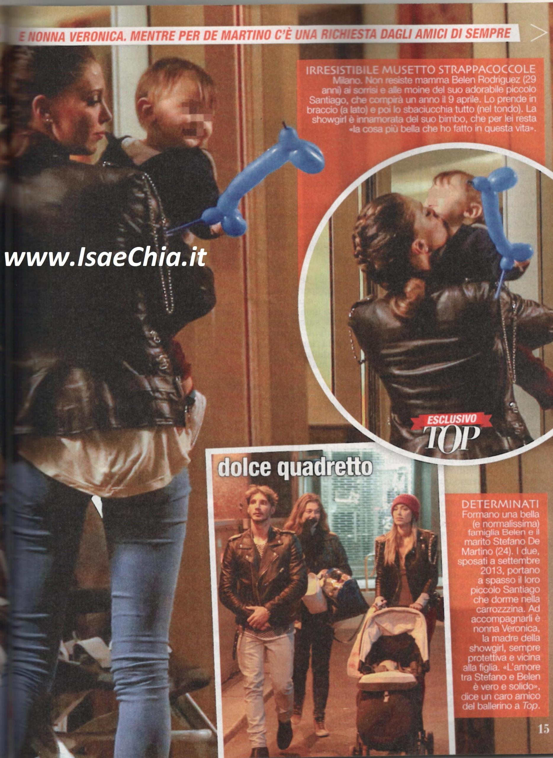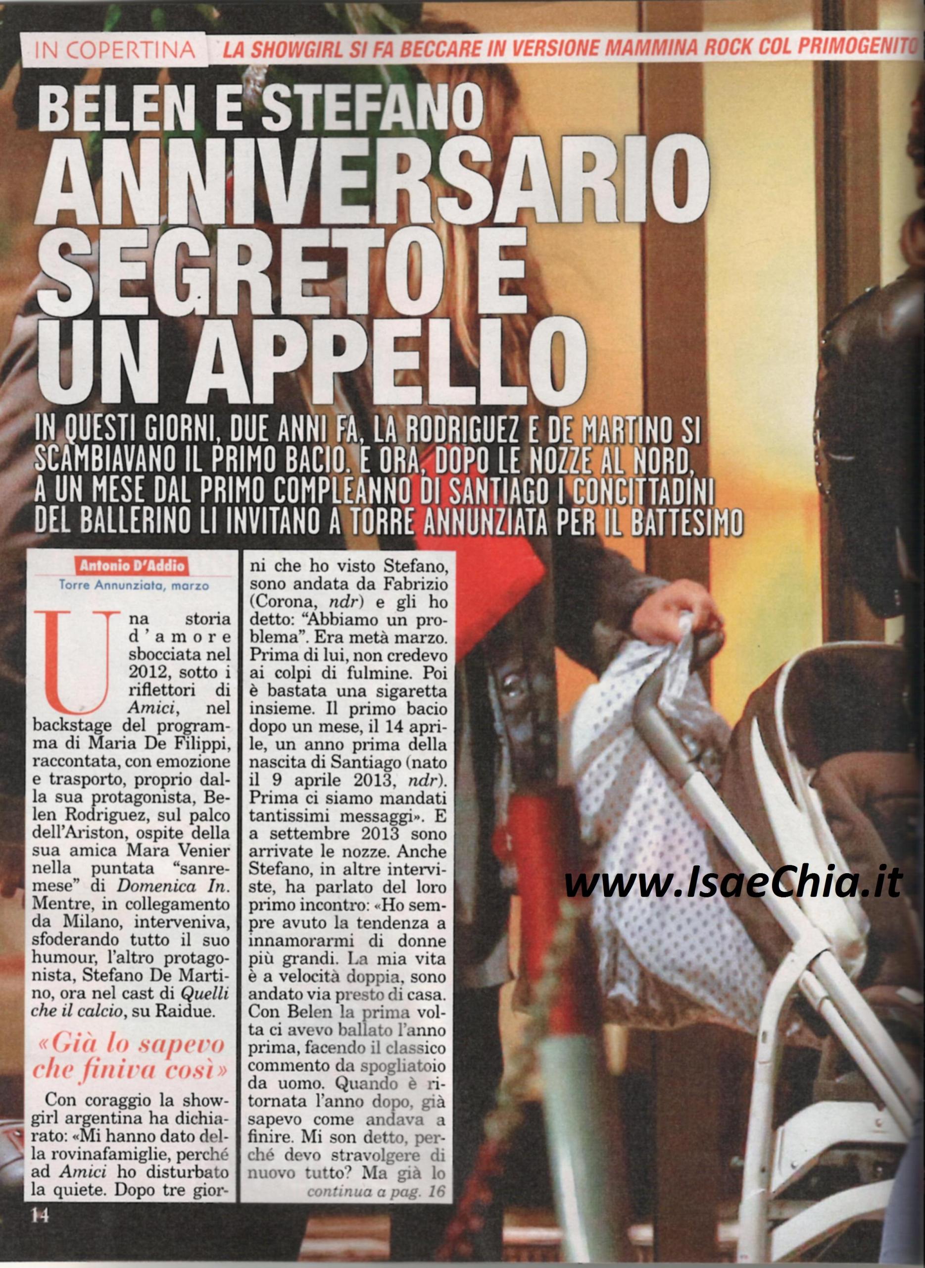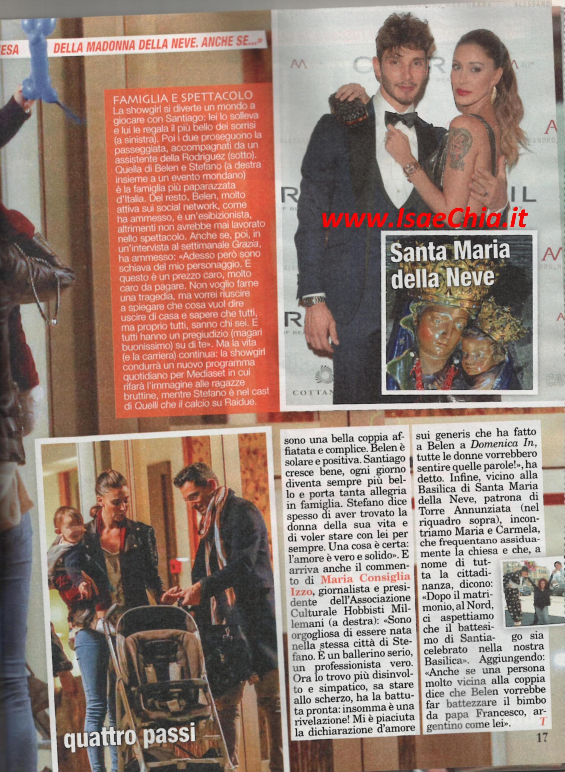 Ospite da Mara Venier nella puntata sanremese di Domenica In, Belén Rodriguez ha dichiarato: “Mi hanno dato della rovinafamiglie, perché ad Amici ho disturbato la quiete. Dopo tre giorni che avevo incontrato Stefano De Martino, sono andata da Fabrizio Corona e gli ho detto “Abbiamo un problema”. Era metà marzo. Prima di lui, non credevo nel colpo di fulmine, ma è bastata una sigaretta insieme. Il primo bacio, il 14 aprile, un anno prima della nascita del nostro Santiago. Prima ci siamo mandati tantissimi messaggi”. Stefano, invece, racconta: “Ho sempre avuto la tendenza ad innamorarmi di donne più grandi. Con Belén avevo già ballato l’anno prima, facendo il classico commento da spogliatoio da uomo. Quando è tornata l’anno dopo, sapevo già come sarebbe andata a finire. Mi sono detto “Perché non stravolgere di nuovo tutto?”. Da allora sono passati due anni. I concittadini di Stefano, come lo speaker radiofonico Massimo Leone o la semplice signora dell’edicola che conosce il ballerino da una vita, sono contenti che la storia vada avanti. Altri, sono nostalgici di Emma Marrone: “L’abbiamo vista molte volte qui a Torre Annunziata, c’eravamo affezionate a lei, dolce, semplice e socievole” dichiarano delle ragazze. Il blogger Armando Sanchez dichiara: “Ogni volta che inserisco notizie su di loro, il gradimento è alle stelle. Li ho incontrati ad un evento di moda e, mano nella mano, contenti e complici, hanno scherzato con il pubblico. Stefano sbalordisce con le sue battute” e l’imprenditore Diego Di Flora conferma. “Nella fiera E’ sposa, è stato un professionista, abituato ai ruoli dello spettacolo e rispettoso dei ruoli. Nonostante la notorietà, riesce ad essere il bravo ragazzo della porta accanto”. Il curatore della pagina Facebook ufficiale di Stefano, Fabio Marantino, dice: “Auguro al mio fratello Stefano e alla mia cognatina acquisita Belén di continuare con lo stesso sentimento tutta la vita. Il loro bambino cresce bene e porta tanta allegria. Stefano dice di aver trovato la donna della sua vita”. Infine, Maria Consiglia Izzo, giornalista concittadina di De Martino, dice: “Sono orgogliosa di esser nata nella sua stessa città. Oltre ad essere un bravo ballerino, è disinvolto, simpatico, ha la battuta pronta: una rivelazione!”. Ora, i torresi aspettano il battesimo di Santiago nella Basilica di Santa Maria della Neve, anche se pare che Belén punti in alto, ossia a farlo battezzare dal Papa Francesco I, argentino come lei…